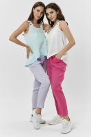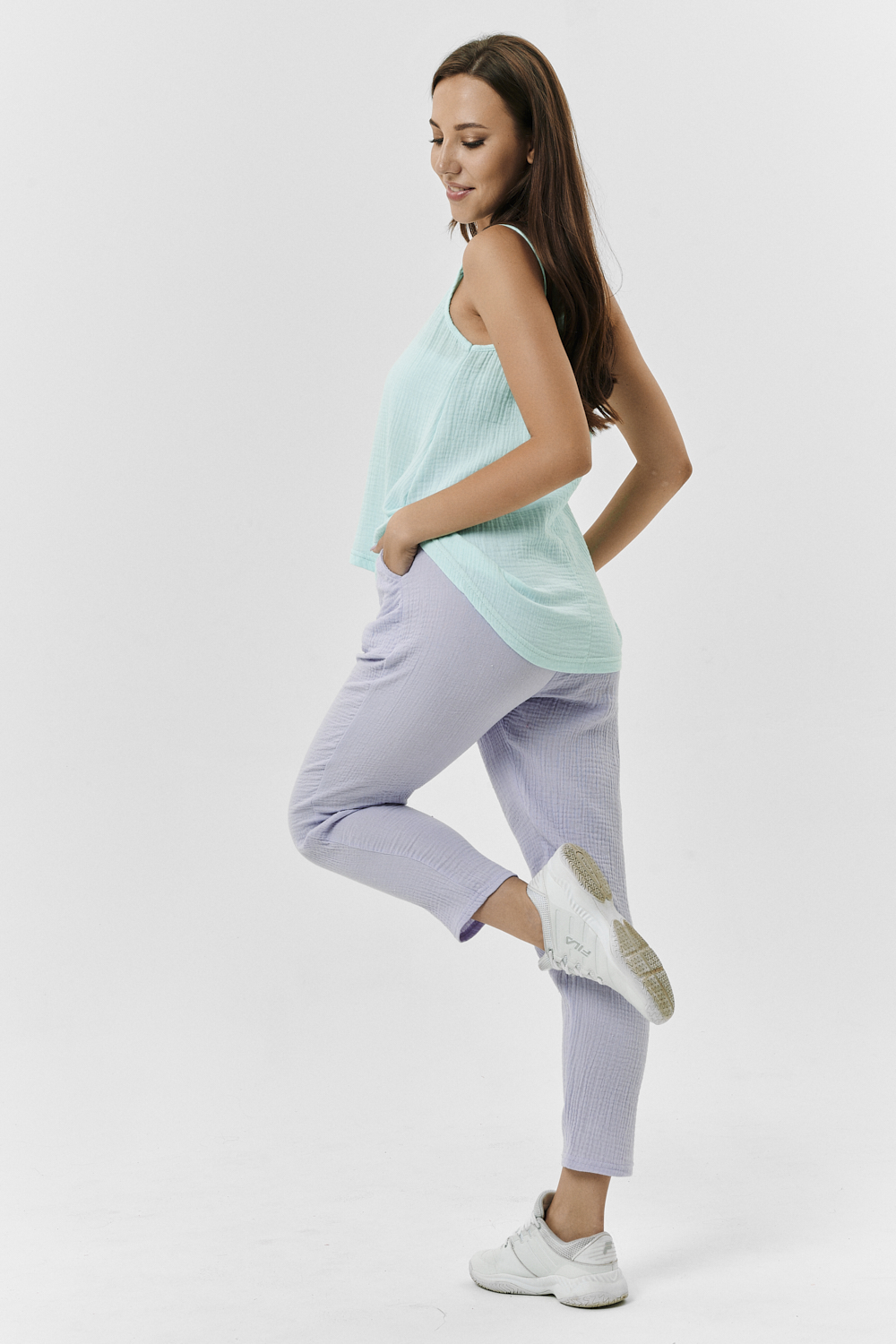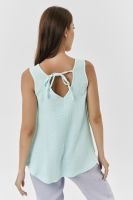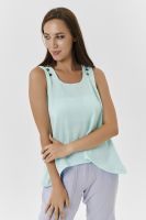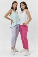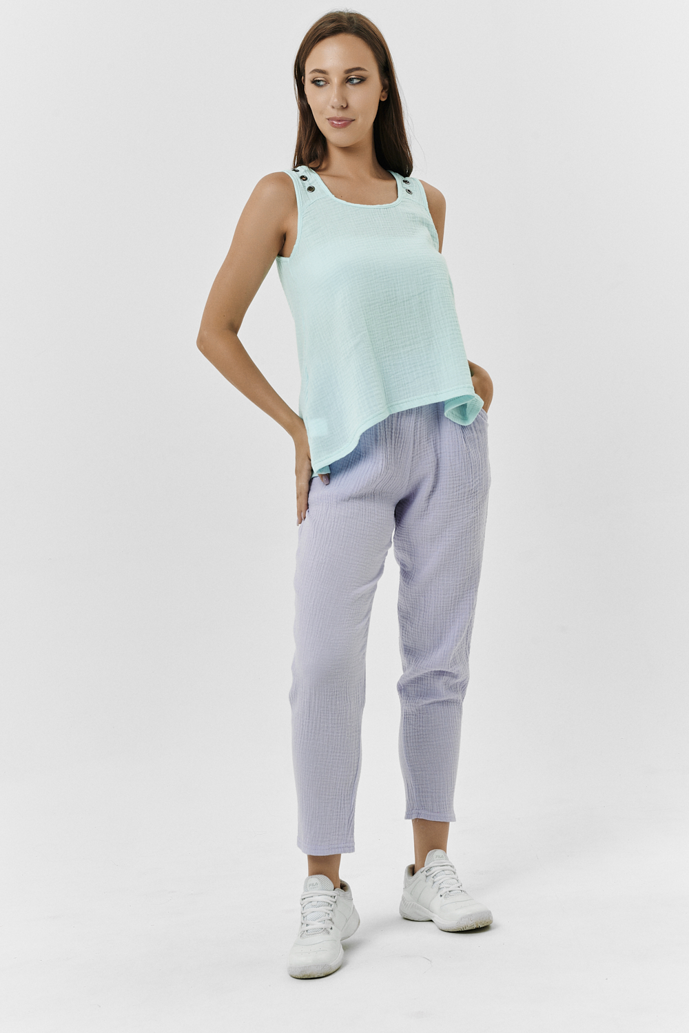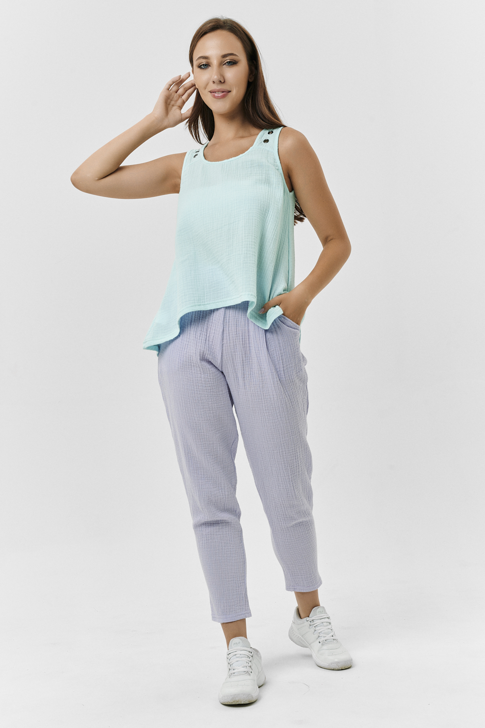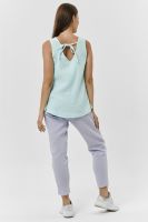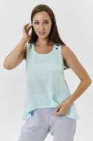 Майка трапецивидного силуэта средней длины, с округлой горловиной, без рукавов, с удлиненной спинкой. На кокетках полочки расположены декоративные люверсы. Горловина и проймы обработаны бейкой из основного полотна.