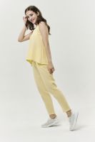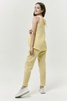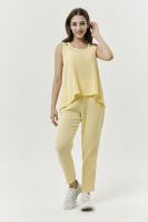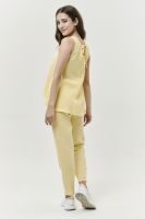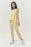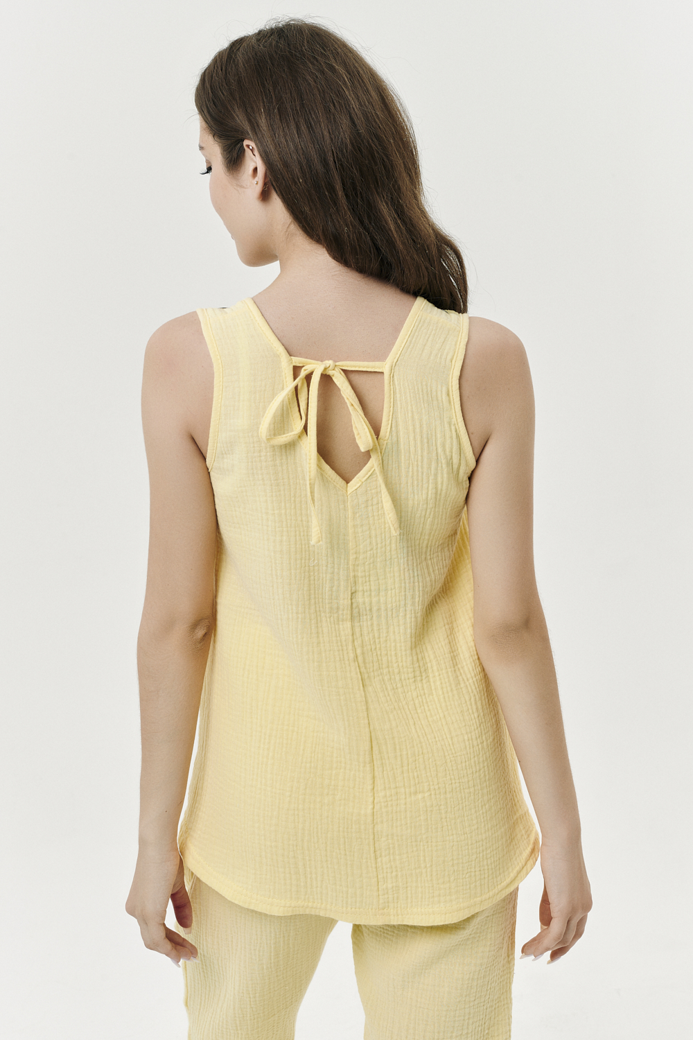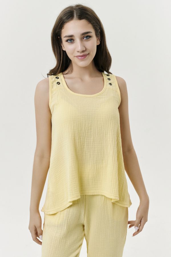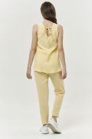 Майка трапецивидного силуэта средней длины, с округлой горловиной, без рукавов, с удлиненной спинкой. На кокетках полочки расположены декоративные люверсы. Горловина и проймы обработаны бейкой из основного полотна.