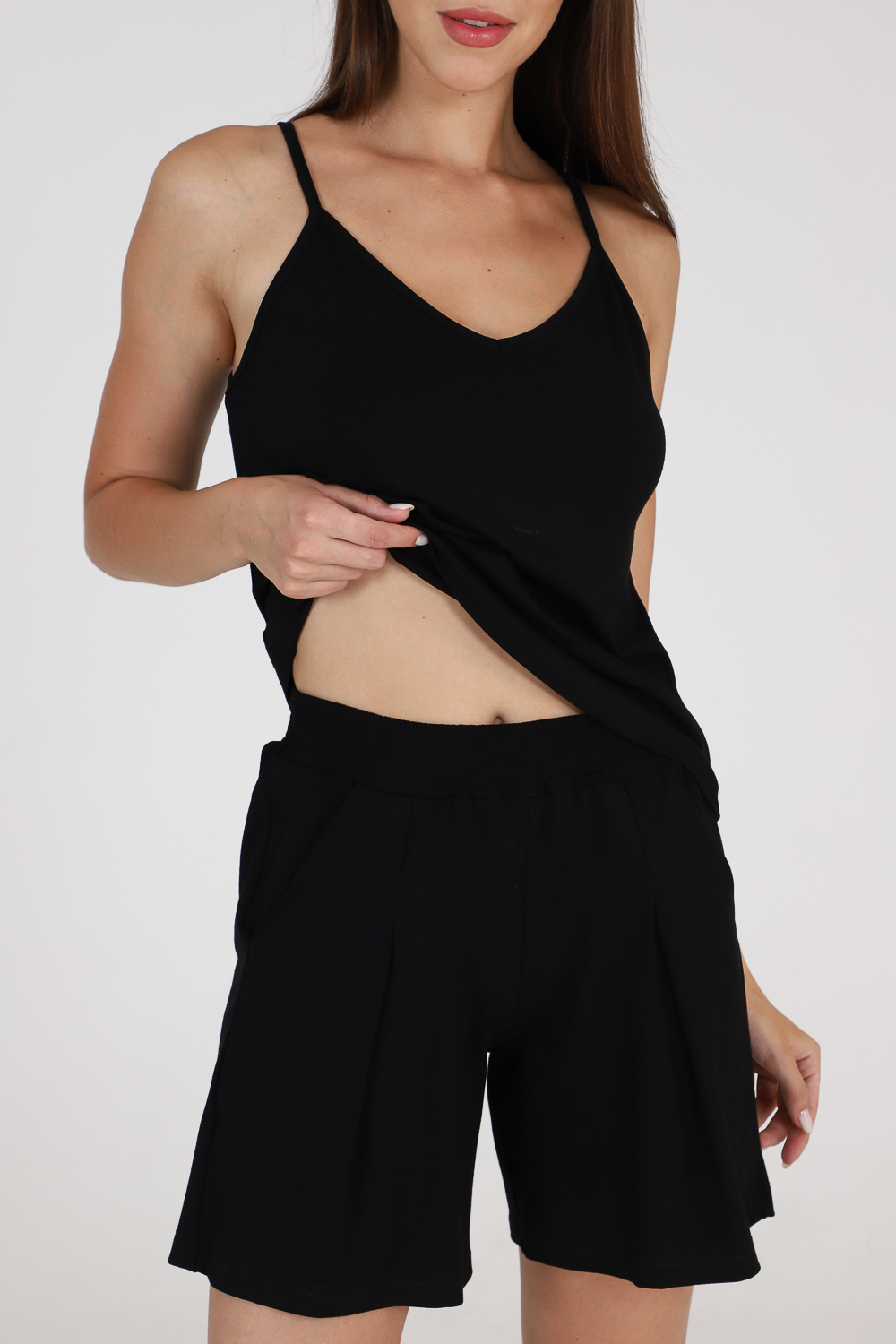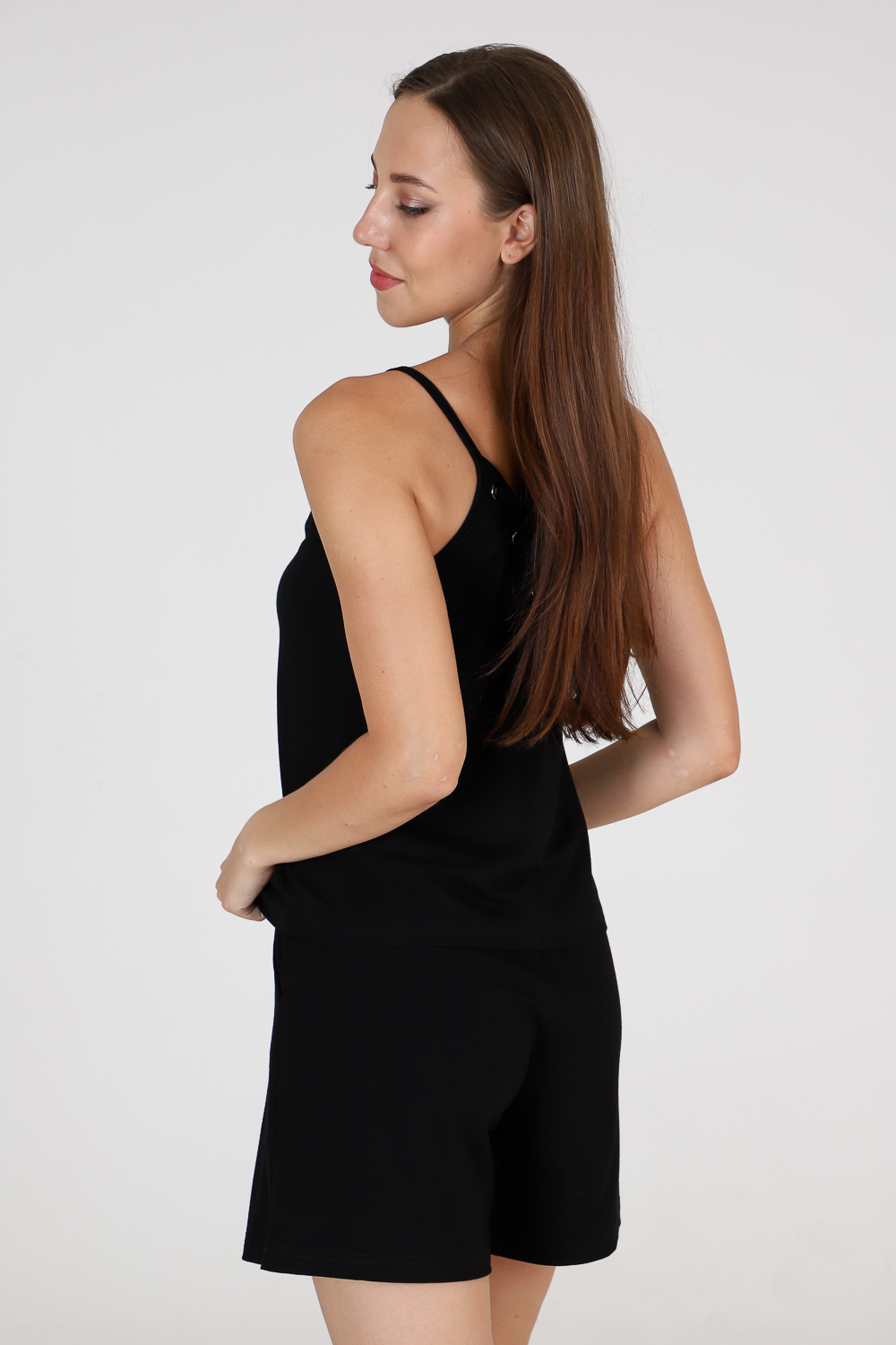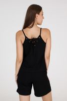 Майка на тонких бретелях, с V-образной горловиной на полочке и спинке. На спинке обработан декоративный вырез со шнуровкой.