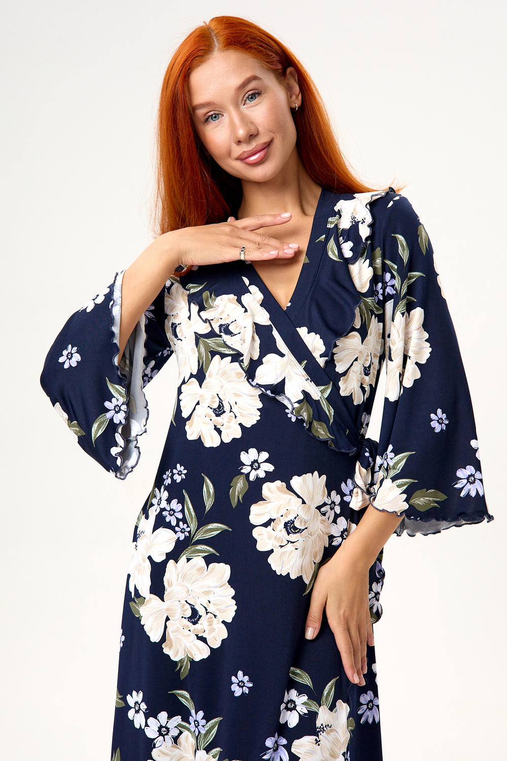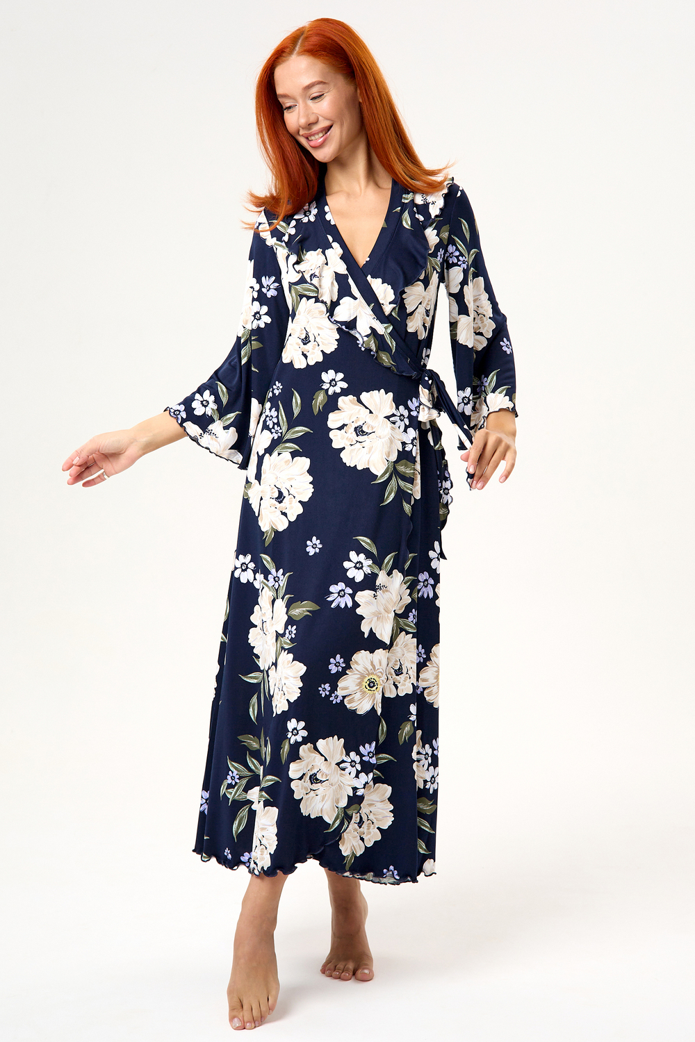 Халат домашний трикотажный женский - это отличное дополнение к вашей коллекции одежды для дома, созданной для тех, кто любит быть яркой и стильной, даже находясь в уютном уголке своего дома. Длинный халат с запахом имеет полуприлегающий силуэт, расклешенный к низу, длиной до середины икры. Линия талии завышена, что создает элегантный и изящный силуэт. На полочках, в области груди, расположены изящные воланы, которые добавляют изюминку к образу, подчеркивая женственность. Рукав в тачной, длиной 3/4, смотрится легко и элегантно, это делает его удобным в использовании. Подойдет как стройным женщинам, так и дамам с пышными формами. Идеально для подарка. Благодаря крою подойдет на маленькие и большие размеры, беременным и кормящим мамочкам. Возьмите халатик в роддом и будете самой элегантной мамочкой. Наш халат – это идеальный выбор для приятного времяпрепровождения в уютной обстановке. Сочетая в себе красоту и удобство, он идеально подходит для женщин, которые ценят качество во всем.