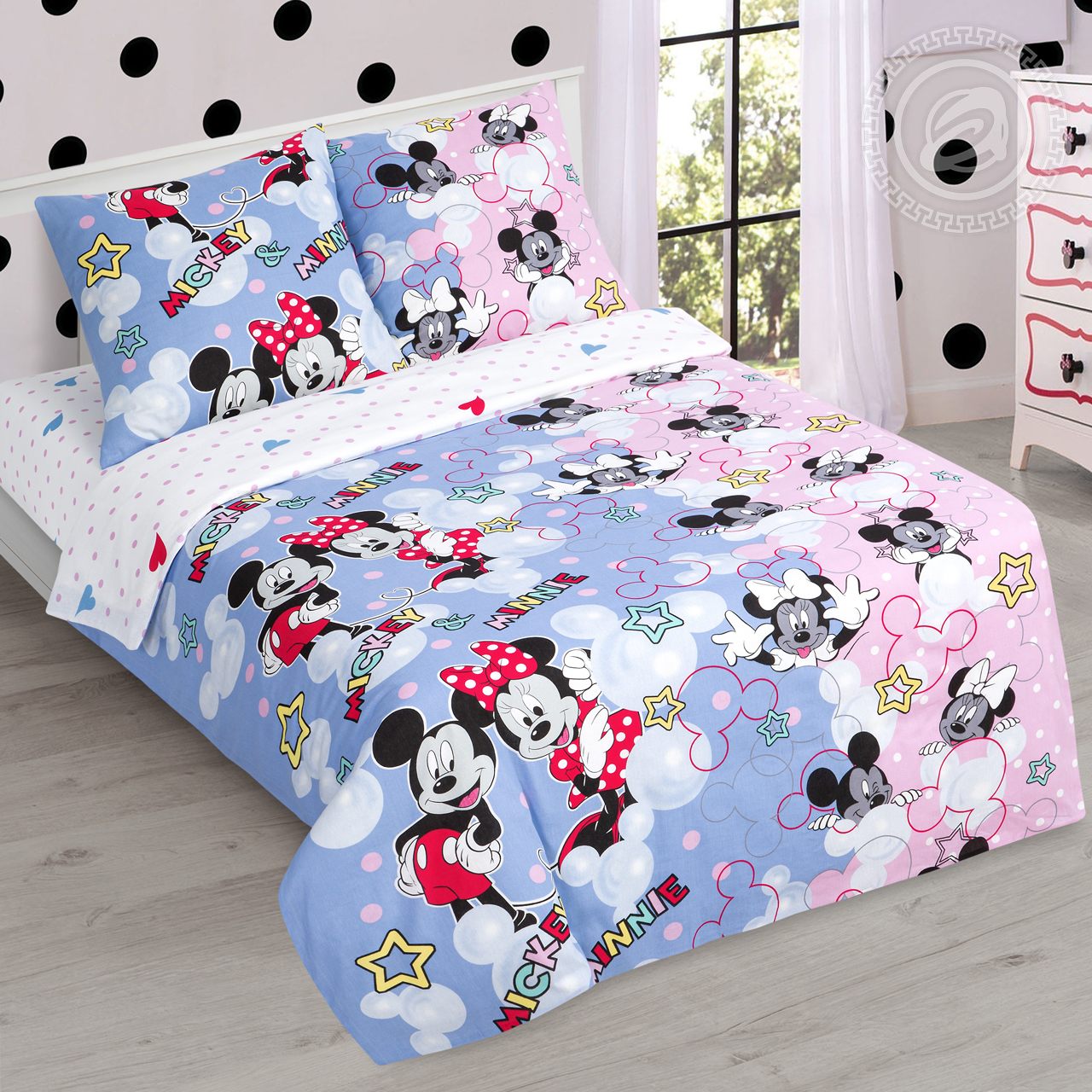 В стране грез, среди золотых звезд и розовых сердечек, живут Микки и Минни Маусы. Этот милый и очаровательный дуэт любим всеми. Минни – модница и кокетка. Она обожает бантики и пышные платья в горошек. А Микки – главный герой веселых историй, который всегда помогает друзьям и любит приключения. Детское постельное белье микки маус из бязи в розовой и голубой гамме подарит волшебные сны, а забавные мышата станут яркими героями сказок.
