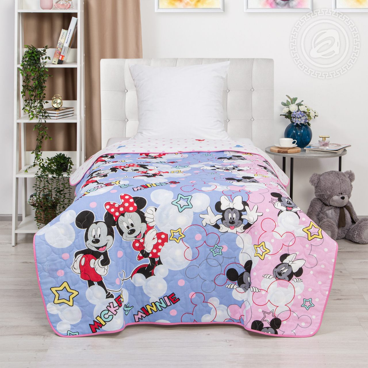 Покрывало защищает постельное белье от загрязнений, а также выполняет декоративную функцию, меняя облик комнаты в лучшую сторону. Снаружи изделия выполнены из материала, в основе которого лежит 100% хлопок. Натуральное волокно не вызывает аллергии и абсолютно безопасно для здоровья. К главным достоинствам бязи относят также высокую воздухопроницаемость и износостойкость. В качестве наполнителя используется полиэфирное волокно. Оно отличается легкостью и высокими теплоизоляционными характеристиками и хорошо сохраняет форму. В стране грез, среди золотых звезд и розовых сердечек, живут Микки и Минни Маусы. Этот милый и очаровательный дуэт любим всеми. Минни – модница и кокетка. Она обожает бантики и пышные платья в горошек. А Микки – главный герой веселых историй, который всегда помогает друзьям и любит приключения. Покрывало в розовой и голубой гамме подарит волшебные сны, а забавные мышата станут яркими героями сказок.