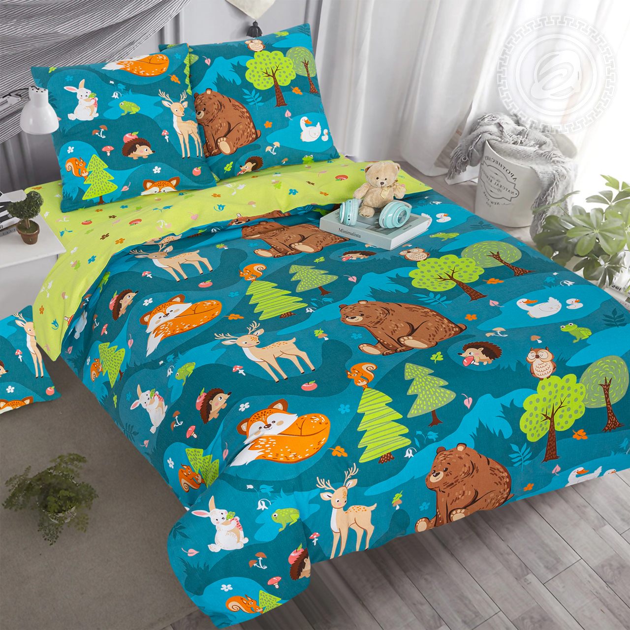 Детское постельное белье с изображением лесных героев станет ярким акцентом в интерьере. Перед нами волшебный лес с очаровательными персонажами. В окружении ёлочек, на цветочных полянках, живут медвежата, белочки, лисички, ёжики и многие другие. Наши лесные друзья не оставят равнодушными детей, малышей и родителей. Комплект из натурального поплина обеспечит комфорт, а красочный дизайн подарит радость.