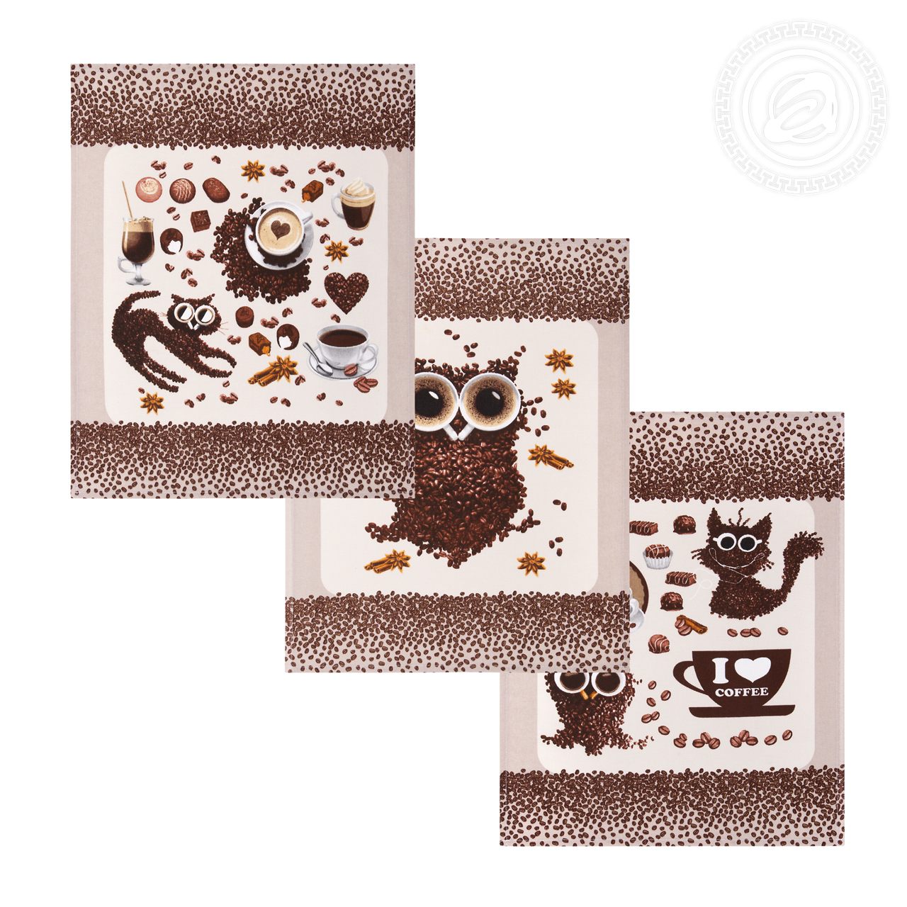 С учетом особенностей рисунка комплектация наборов может быть разной (микс). Ни дня без кофе! Любимый утренний напиток теперь не только в кружке, но и на полотенцах из рогожки с тематическим дизайном. «Кофе-Брейк» — это россыпь обжаренных зерен, чарующие ароматы капучино и латте, забавные совы и черные кошки с глазами-чашками и сладкие пирожные. Атмосферная композиция создана для истинных кофеманов и дарит позитивные эмоции. «Кофе-брейк» - идеальный рецепт бодрого утра.