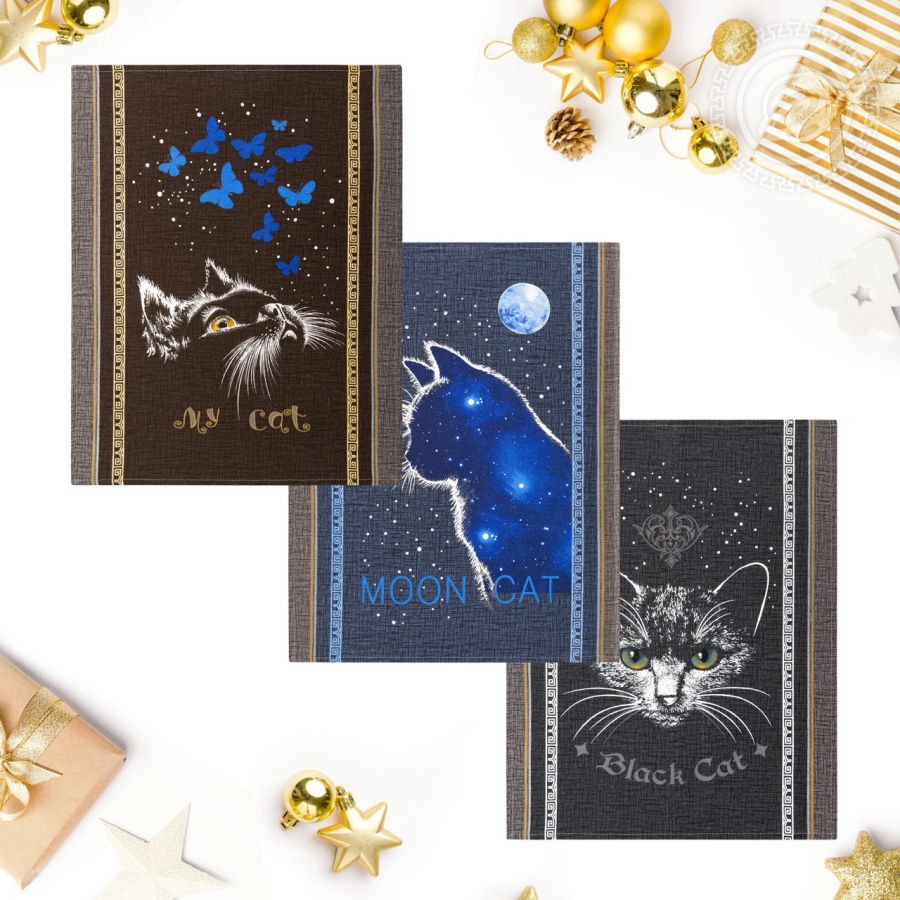 С учетом особенностей дизайна комплектация наборов может быть разной (микс). Эксклюзивный дизайн «Лунный кот» погружает в атмосферу тайн и загадок. На темном фоне черный кот – волшебный герой, который появляется в ночи с восходом Луны. Новогодний рисунок выполнен в интересной стилистике с сочетанием темно-коричневого и темно-синего цветов. На каждом полотенце из рогожки – мордочка кота с яркими глазами. «Лунный кот» - это образ мистики и волшебства в интерьере.