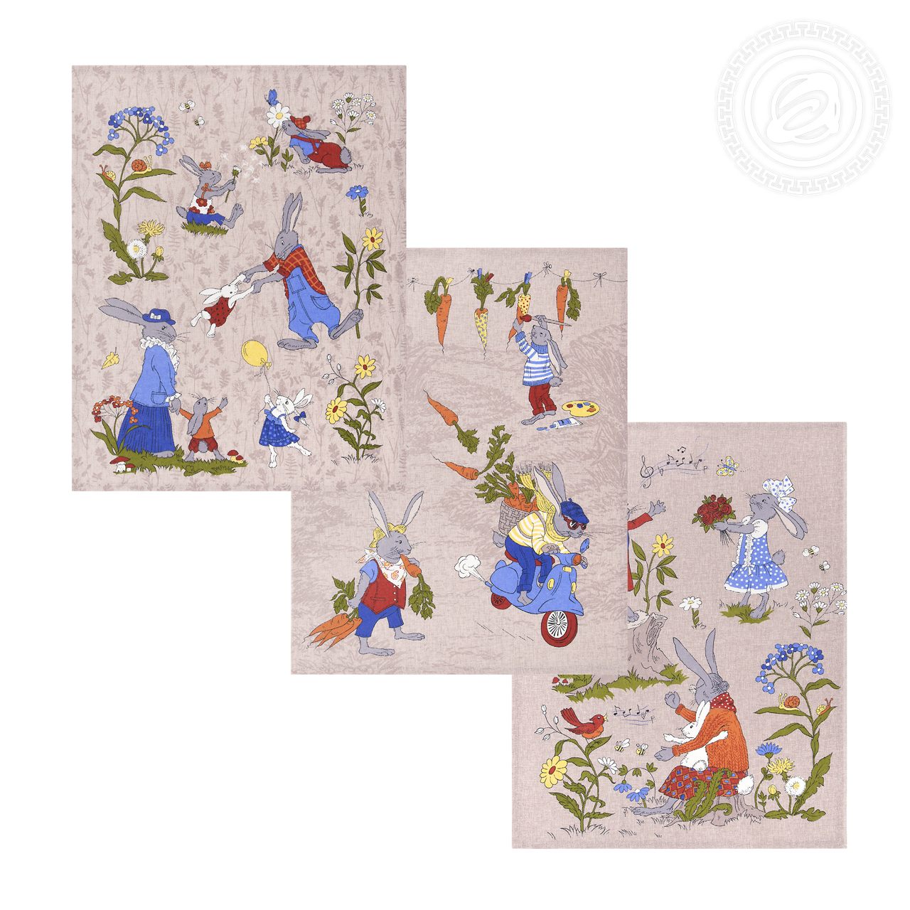 С учетом особенностей рисунка комплектация наборов может быть разной (микс). «Морковкино» - красивый и забавный дизайн на полотенцах из рогожки. Перед нами будто фотографии-зарисовки из семейного альбома зайцев. Вот папа кружит сынишку, мама ведет зайчонка в школу, лапочка-дочка бегает по траве с воздушным шариком, а вот бабушка рассказывает малышу добрую сказку. Семейный рисунок с символом 2023 создает новогоднее настроение и дарит радость.