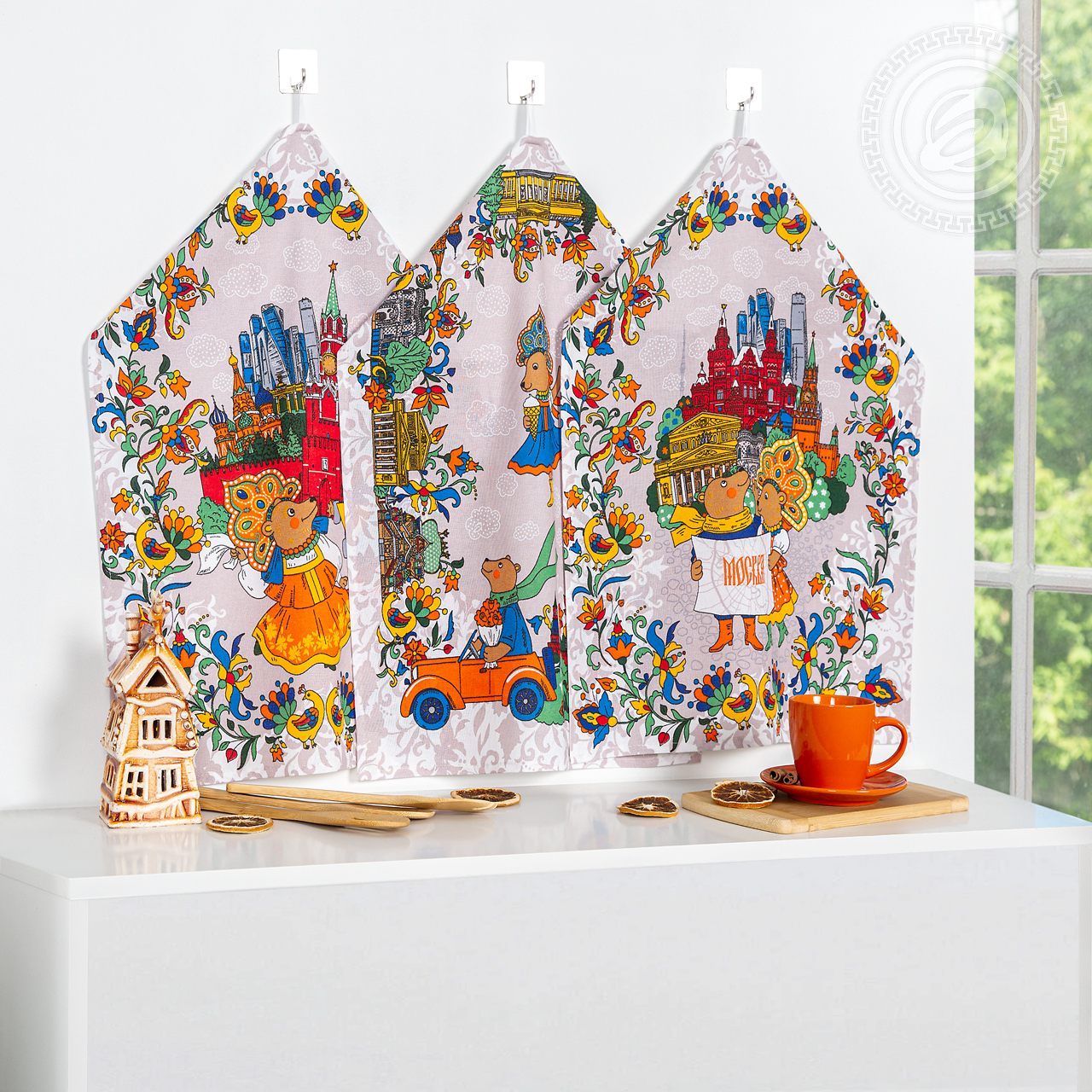«А я иду, шагаю по Москве», – эта знаменитая фраза хорошо подходит к дизайну «Московские мишки». Наши герои гуляют по столице, любуются достопримечательностями, наслаждаются летней погодой, залихватски танцуют и едят вкусное мороженое. Яркие герои одеты в русские наряды и окружены знаковыми местами: Красная площадь, Большой театр, Триумфальная арка и другие. Если вы мечтаете посетить Москву или хотите сохранить воспоминания о незабываемой поездке, то набор полотенец из рогожки с мишками точно для Вас! Это необычный русский сувенир, который принесет уют на кухню и поможет запечатлеть дорогие сердцу моменты.
