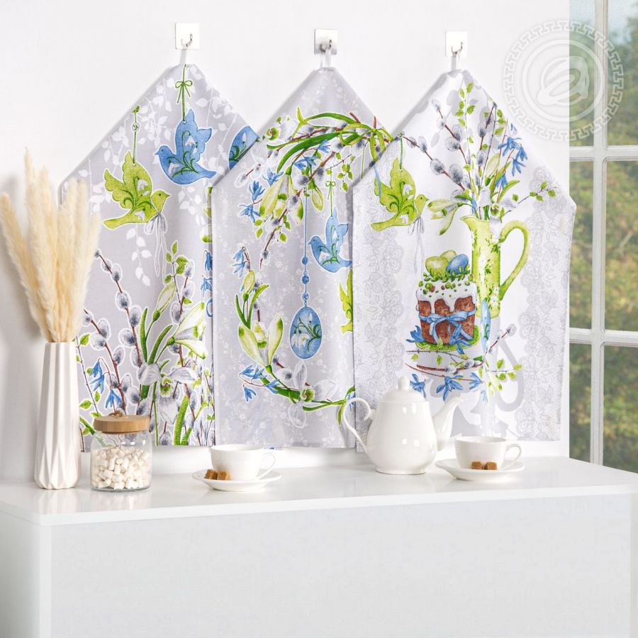 Кухонные полотенца «Пасха» из рогожки украсят светлый весенний праздник. Они выполнены в пастельной гамме оттенков и дополнены легкой и очаровательной композицией с пасхальными мотивами. Изящные пташки, мягкие узоры, веточки вербы создают атмосферу весеннего тепла и уюта. Это подарок к Светлой Пасхе, который подарит чувство радости и умиротворения.