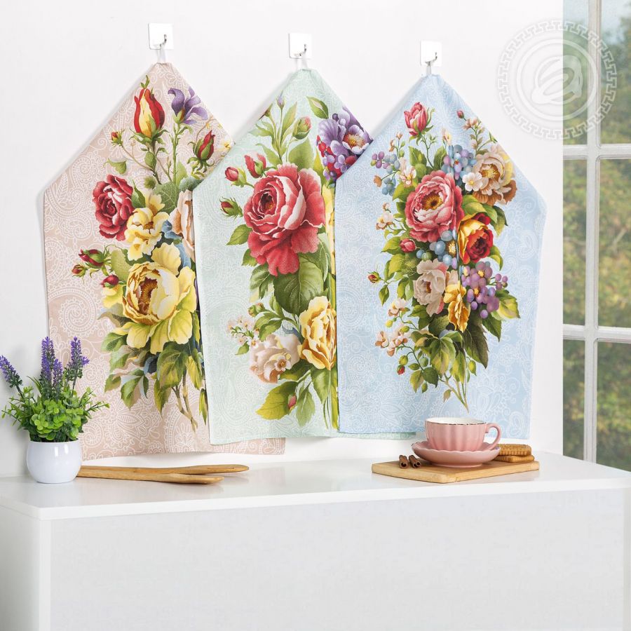 Вы любите пионы? Представляем вам весенне-летнюю композицию с цветочным узором. На кухонных полотенцах из рогожки живописный принт с изящными пионами. Для них выбрана нежная гамма оттенков и легкое обрамление в виде утонченных ажурных завитков. Маленькое произведение искусства для Вашей кухни!