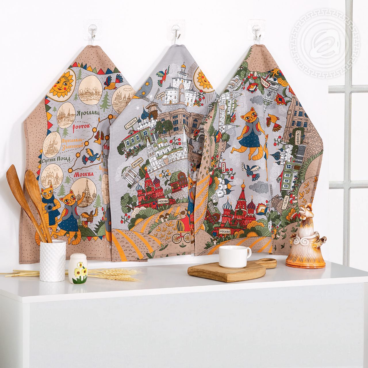 С учетом особенностей рисунка комплектация наборов может быть разной (микс). Вы любите путешествовать? Искать живописные места и делать памятные фотографии? Тогда для вас оригинальные сувенирные полотенца из рогожки «По золотому кольцу»! Каждое из полотенец – это отдельная картина с невероятно красивыми видами и милыми персонажами. Здесь котики-туристы, которые любуются каждым городом Золотого кольца России и делают снимки. А в центре карта с городами и их знаковыми местами. Полотенца из рогожки с эксклюзивным дизайном станут чудесным подарком для каждого!