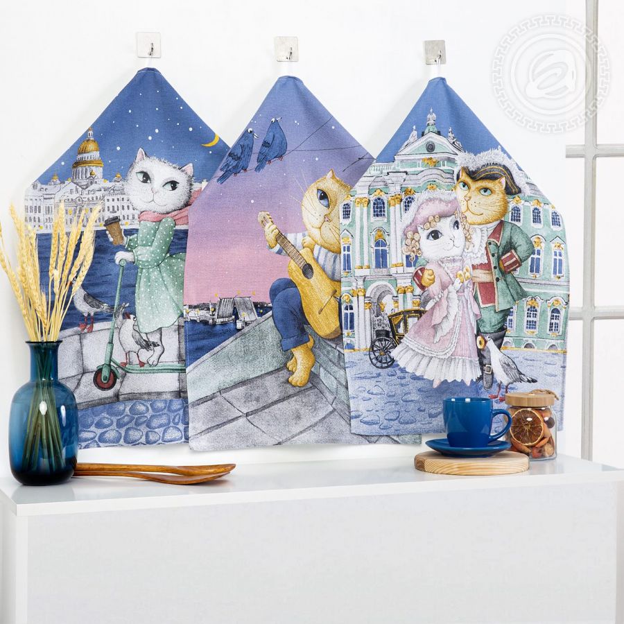 Приглашаем в путешествие по улицам Санкт-Петербурга! Наши сувенирные полотенца из рогожки украшены невероятными видами любимого города. Вот живописная набережная, по которой на самокате стремительно катится юная леди. А вот величественный Зимний дворец, у которого гуляют наши питерские коты. А чуть дальше красивые крыши, на которых сидят голуби и играют романтики-котики. «Променад» – набор полотенец, который станет стильным и оригинальным подарком для всех туристов.