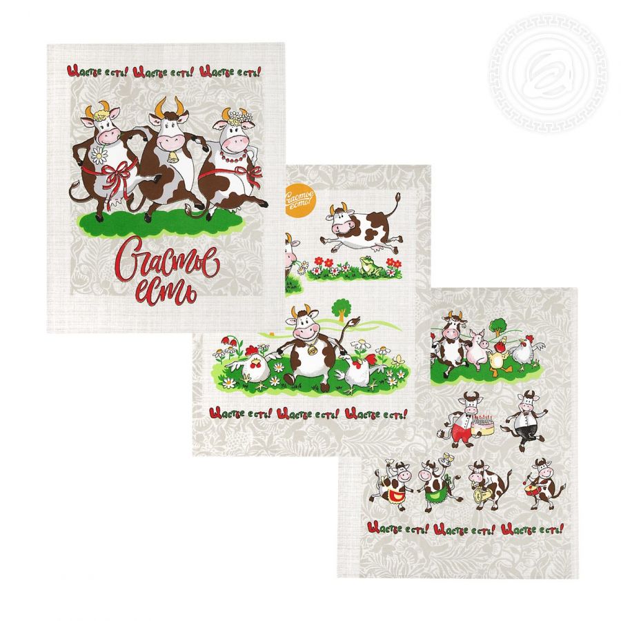 Кухонные полотенца из рогожки «Счастье есть» не просто незаменимый предмет обихода. Это яркий и стильный аксессуар с авторским дизайном. Разудалая компания буренок и бычков веселится и танцует, играет с цыплятами, водит хороводы с милейшими овечками и другими зверятами. Они радуются жизни и заряжают позитивом всех вокруг.