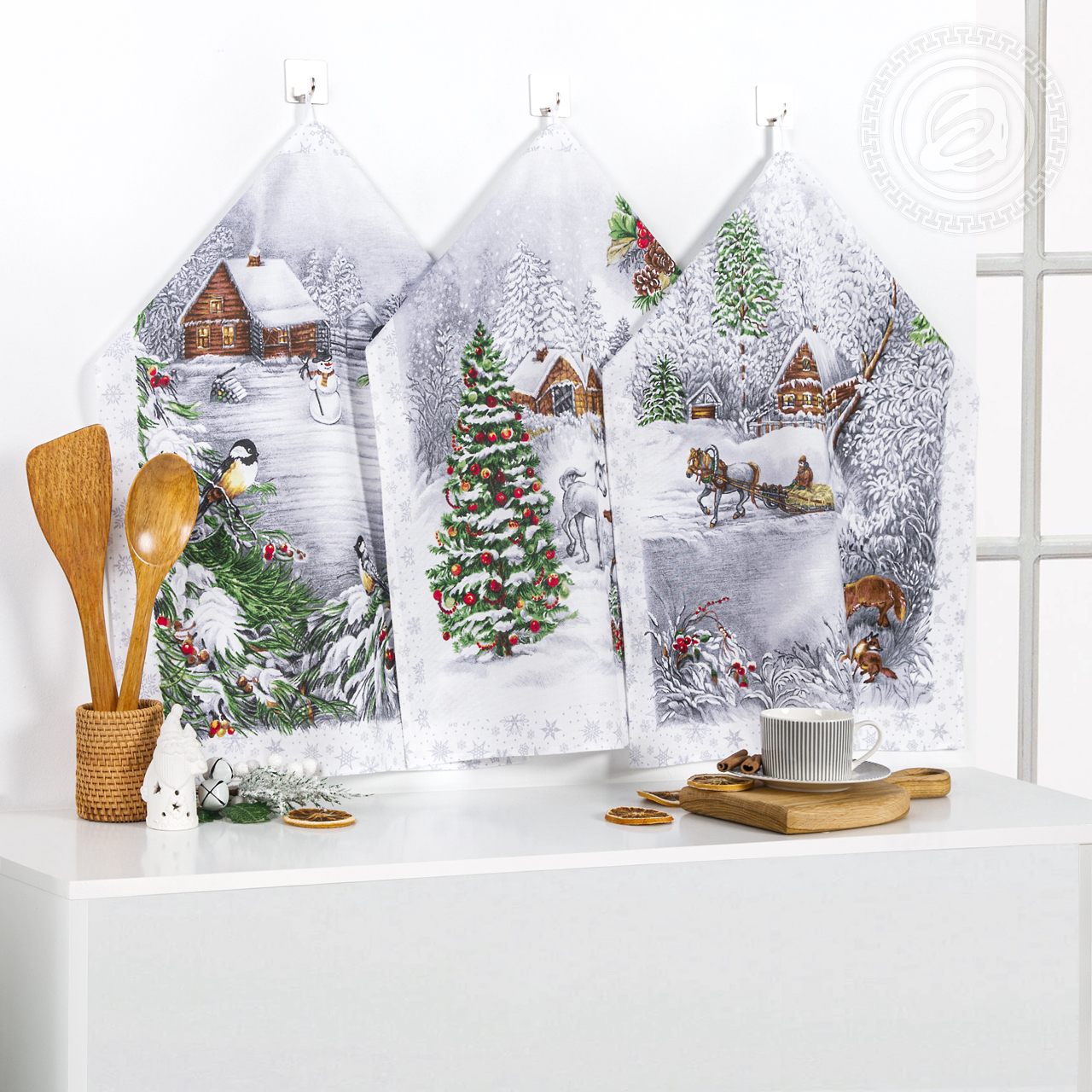 «Однажды в студеную зимнюю пору», – при взгляде на новогодние полотенца из рогожки вспоминается строка стихотворения Н.Некрасова. Перед нами деревенский пейзаж с маленькими и уютными улочками, большими сугробами, нарядной ёлочкой и деревянными избами. Любуешься авторским рисунком и как будто чувствуешь и легкий морозец, и хруст снега. Это чудесный акцент в интерьере кухни, который дарит чувство праздника и приятной ностальгии.
