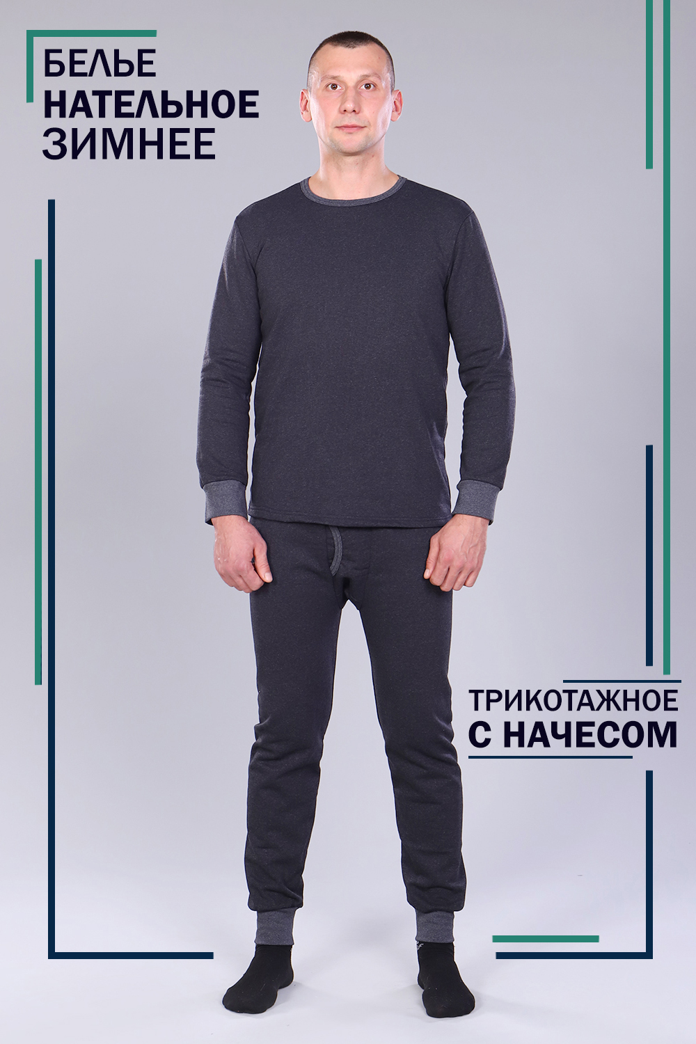Костюм состоит из кальсон и лонгслива с длинным рукавом, по низу обработанных трикотажными манжетами. Мужское белье из ткани футер с небольшим начёсом, предназначено в качестве утепляющего нижнего белья под одежду. Прекрасно подходит для утепления под одежду.