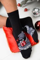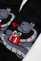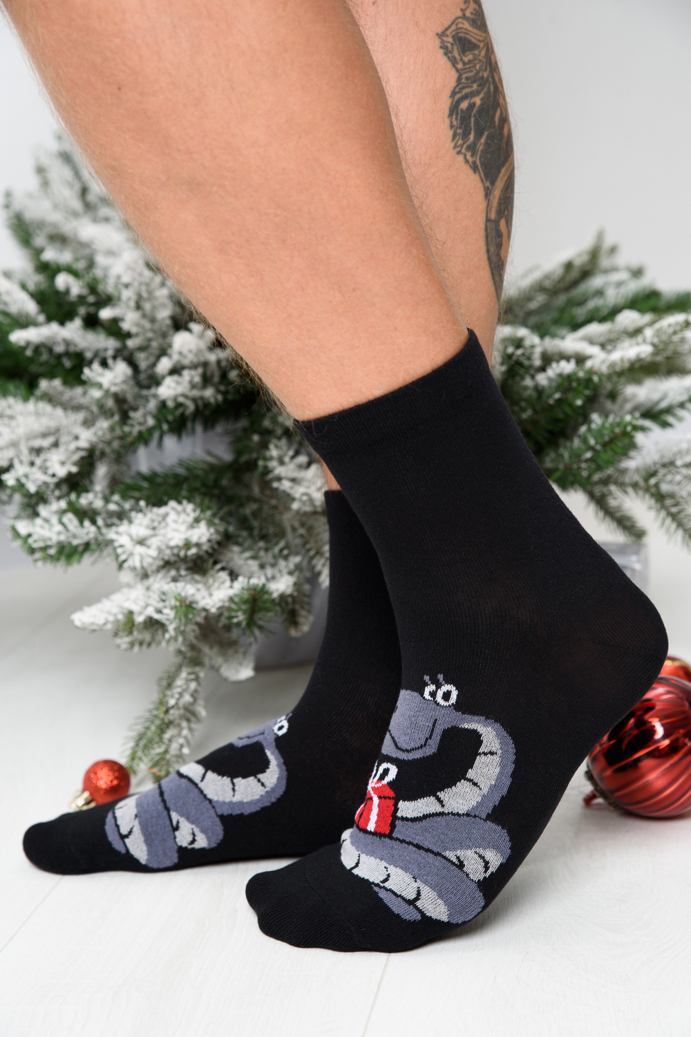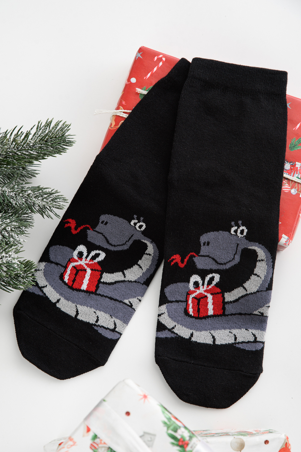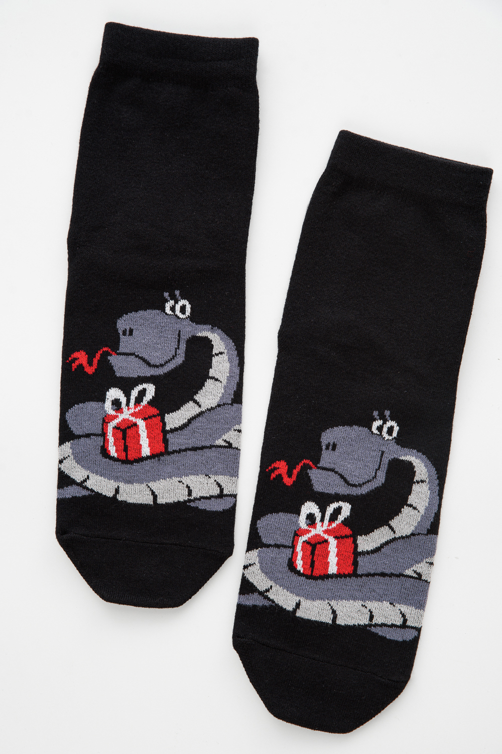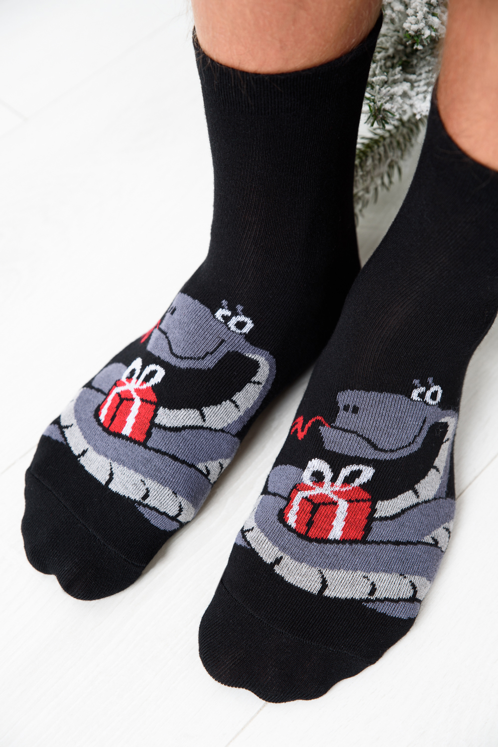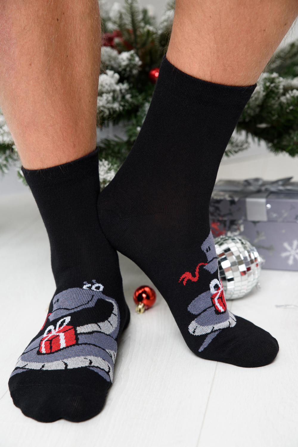 Оригинальные мужские новогодние носки. В комплекте 1 пара. На основной части носка изображение символа будущего года Змеи.