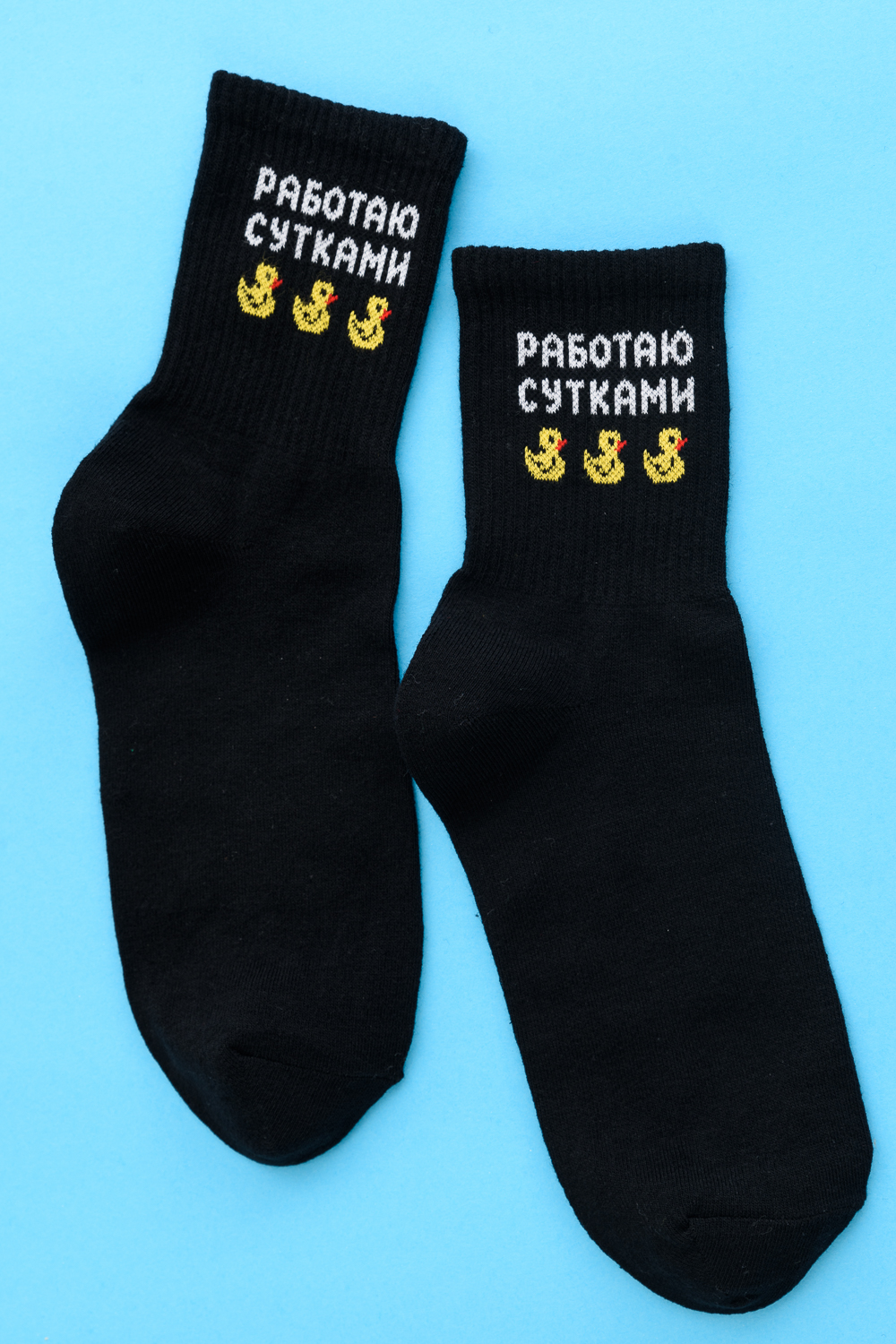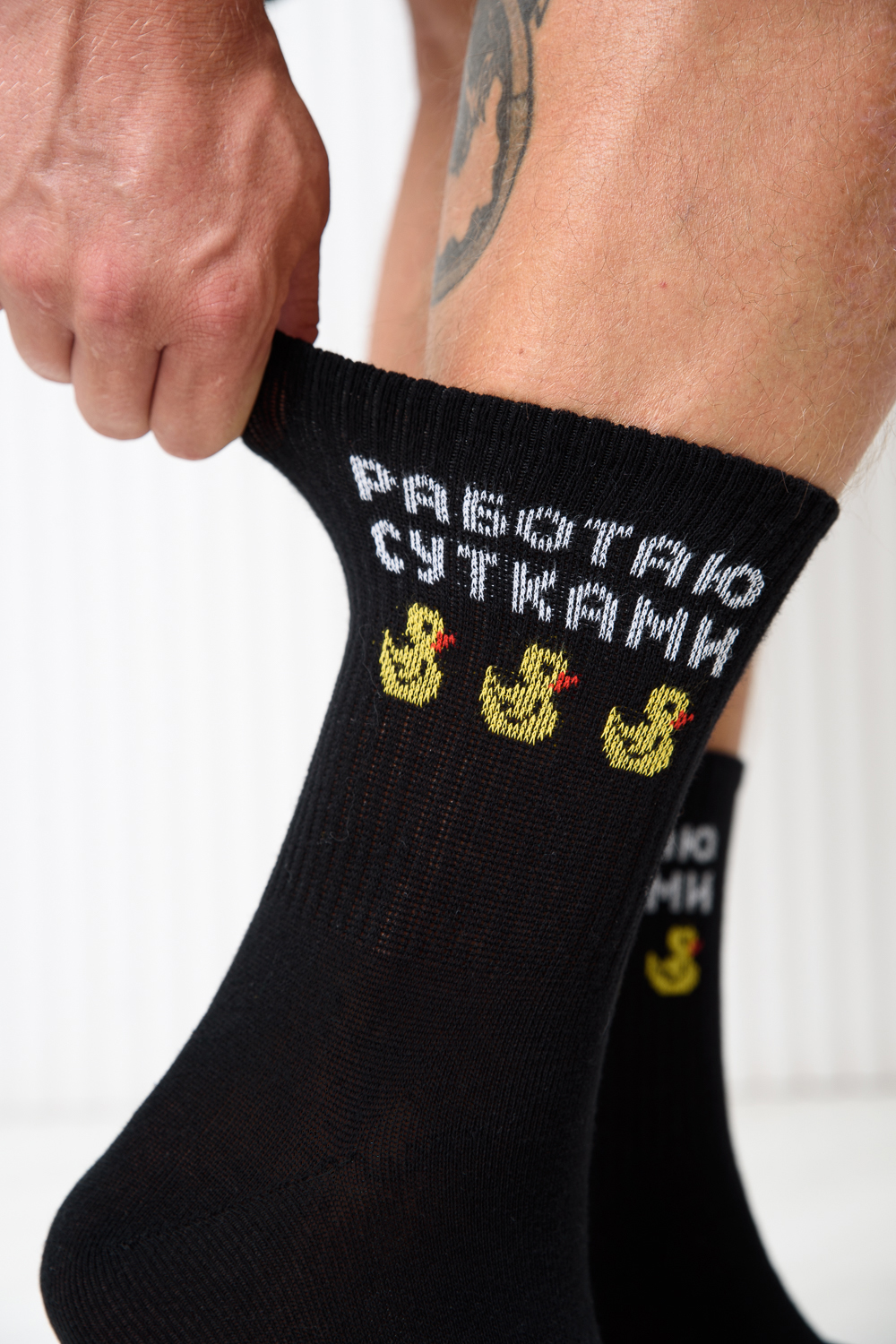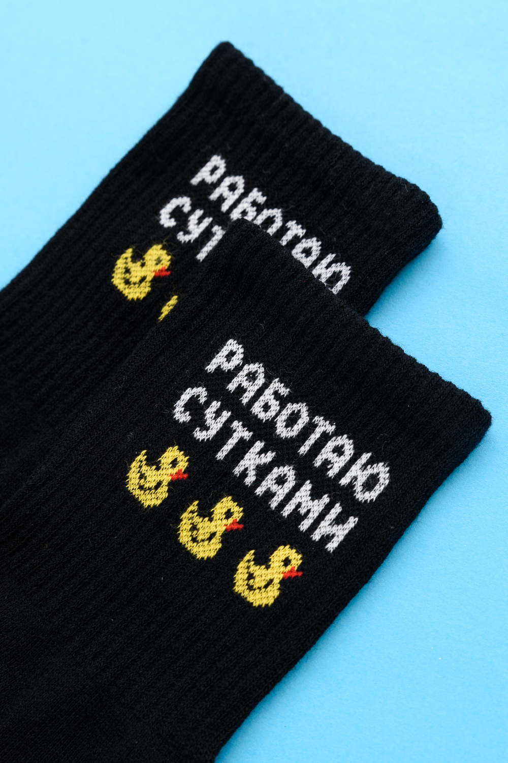 Оригинальные носки с изображением милых уточек на резинке. Носки высокие, резинка по все верхней части носка, надпись "Работаю сутками".