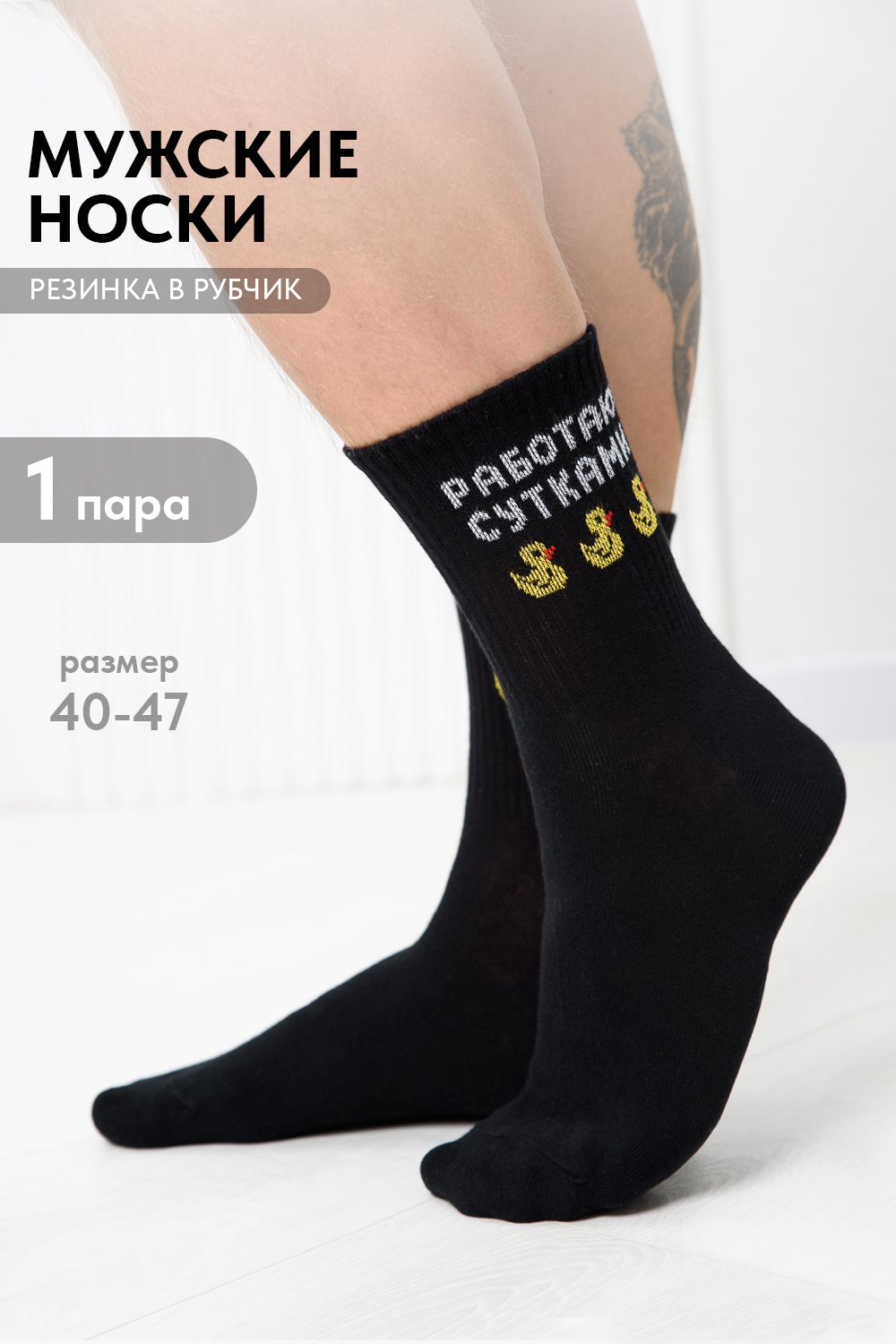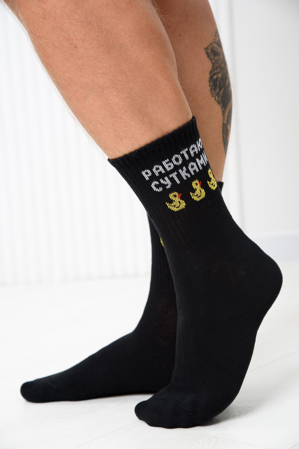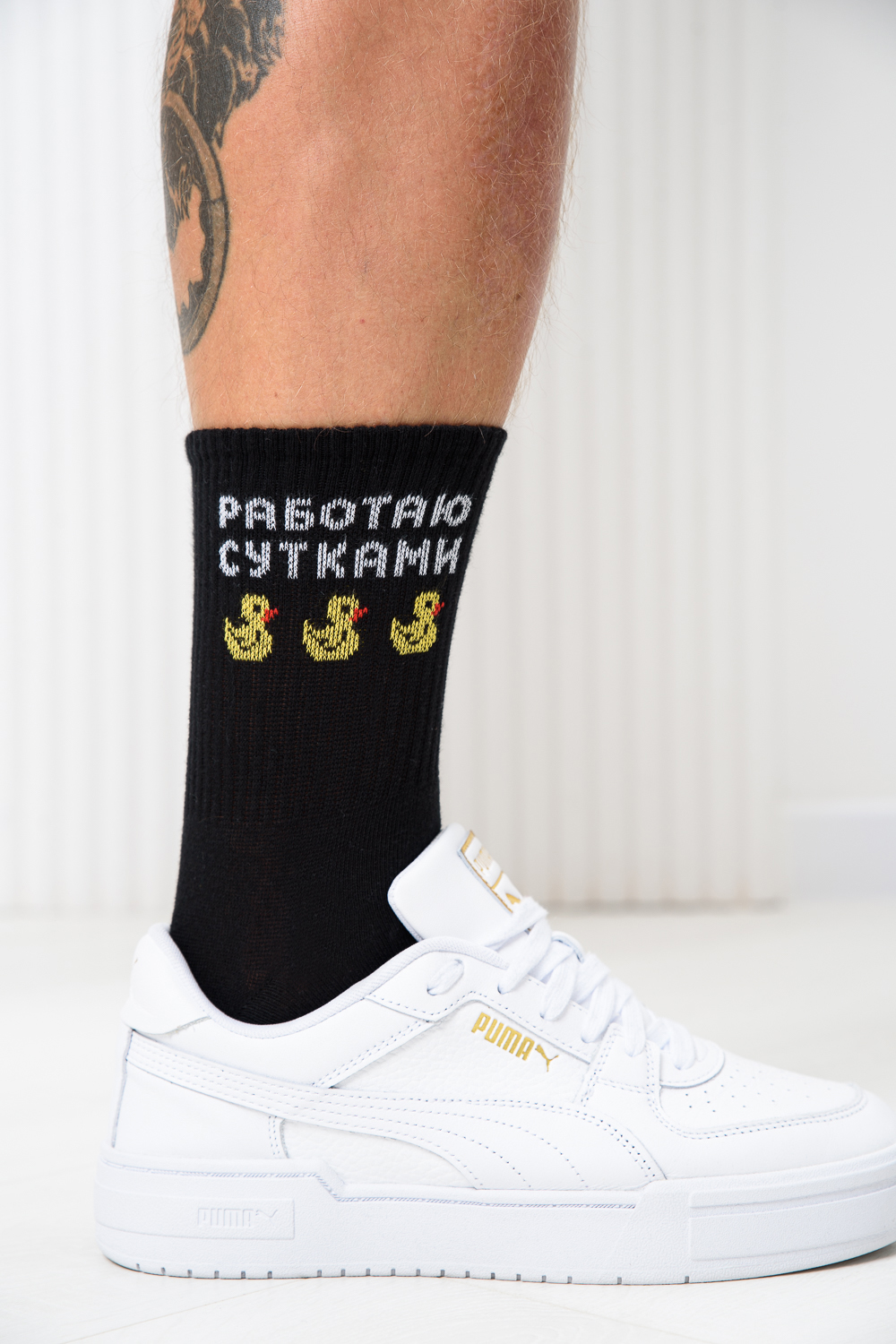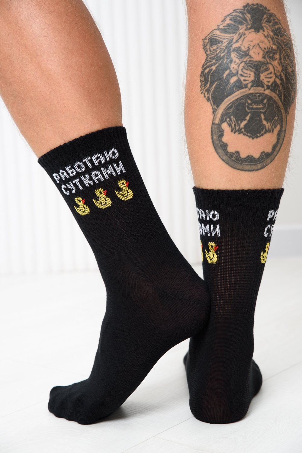 Оригинальные носки с изображением милых уточек на резинке. Носки высокие, резинка по все верхней части носка, надпись "Работаю сутками".