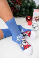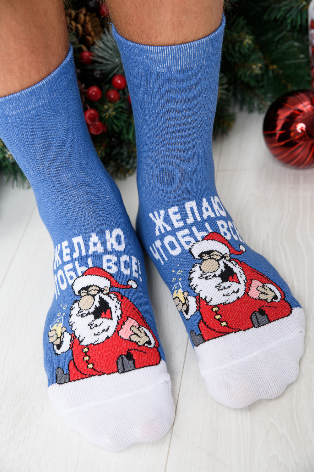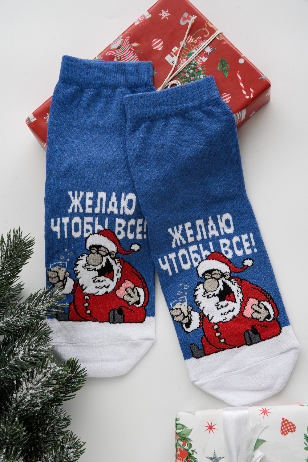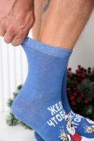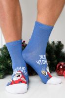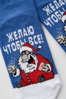 Оригинальные мужские новогодние носки. В комплекте 1 пара. На основной части носка изображение Санта Клауса и надпись "Желаю чтобы все". Оригинальная расцветка делает носки отличный подарком на Новый год.