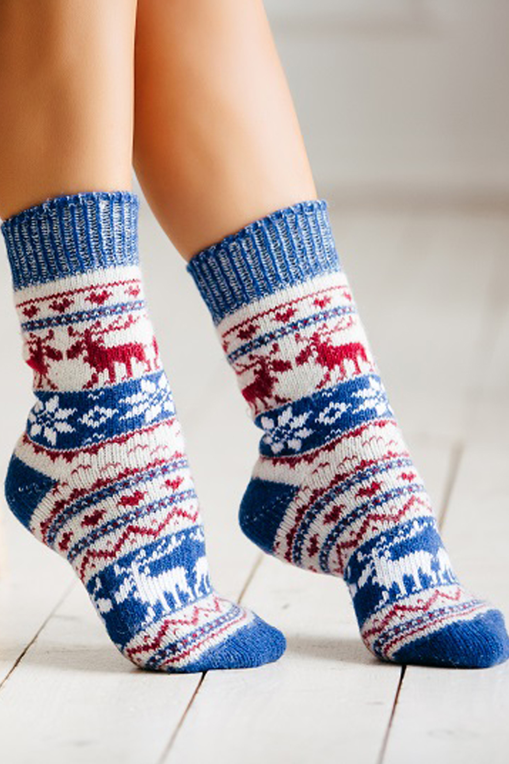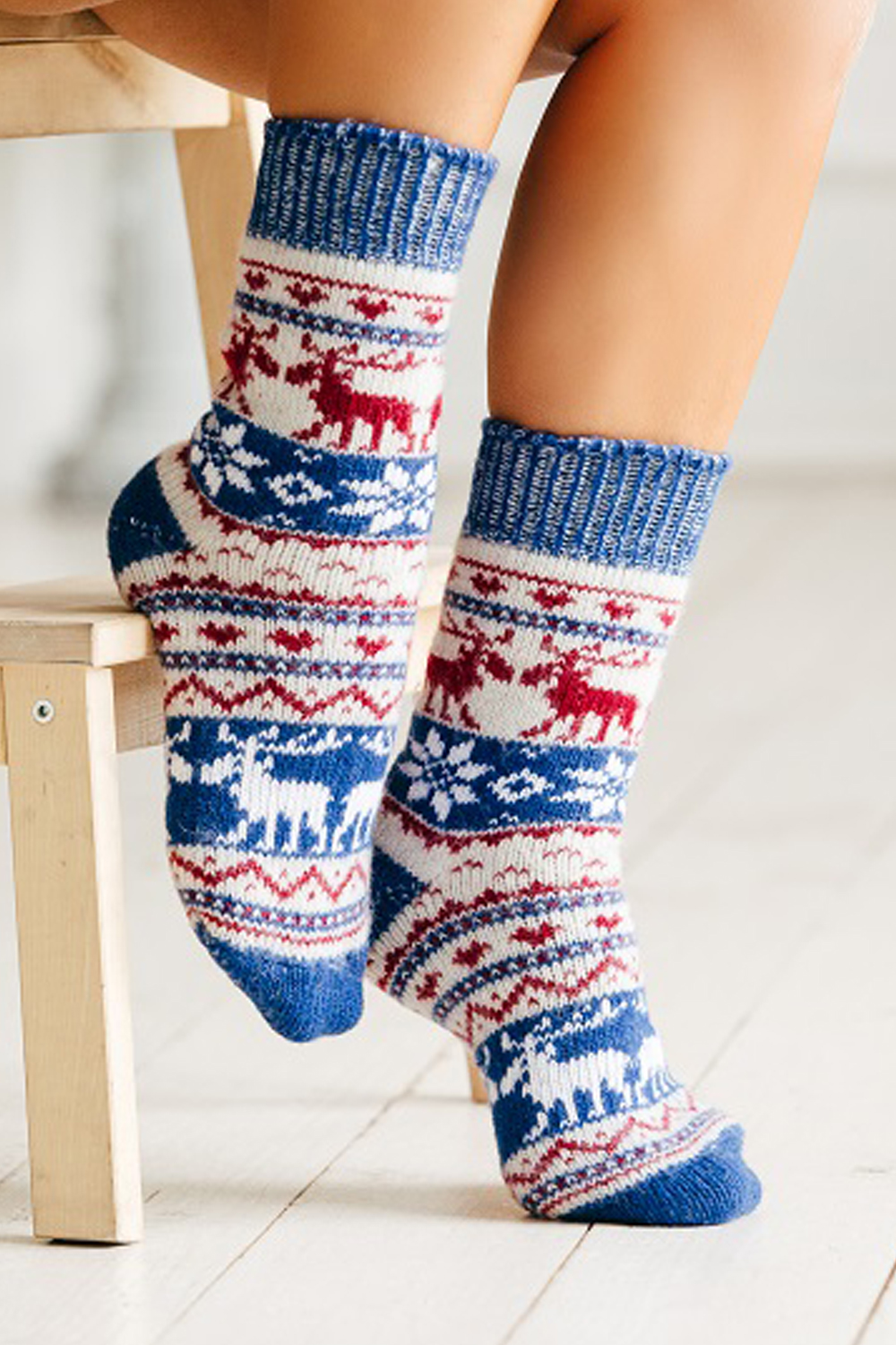 Здоровье человека идёт от ног, поэтому важно держать ноги в тепле не только зимой, но и межсезонье. Теплые вязаные носки с натуральной шерстью в составе согреют и подарят ощущение комфорта. Зимние носки мягкие и неколючие. Они плотно облегают ногу, но резинка не давит, удобны на каждый день, сохраняют яркость цвета и первоначальную форму после многочисленных стирок. Носки долговечны, они будут согревать вас несколько зимних сезонов. Шерстяные носки станут спасением в самые сильные морозы. Ногам будет комфортно даже при температуре до -40°С. Шерсть имеет уникальную способность быстро согревать и длительное время поддерживать правильную терморегуляцию. Она хорошо пропускает воздух и позволяет коже дышать. Также быстро отводит влагу, оставаясь при этом сухой. Шерстяные носки отлично тянутся, благодаря чему не сковывают движений. Благодаря полиамидным нитям имеют повышенную прочность изделия от истираний и разрывов, что значительно увеличивает продолжительность их службы. Шерстяные носки достаточно плотные, при этом мягкие, не раздражают, не вызывают зуда и не колются. Имеют широкую резинку и связаны с учетом анатомической формы ступни и голеностопа. В составе натуральной шерсти находятся природные соединения и ланолин, обладающие антисептическим эффектом. Это позволяет им оставаться свежими даже после нескольких дней ношения. Носочки с очаровательным зимним рисунком идеально подойдут для уютной новогодней фотосессии, для себя или в подарок близким на Новый год и другие праздники. Теплые носки станут прекрасной покупкой на зимний сезон. Подходят для занятия спортом: под коньки, лыжные и треккинговые ботинки. Они согревающие, поэтому незаменимы для рыбалки, охоты или во время прогулок на свежем воздухе. Теплые вязаные носки будут отличным подарком маме, бабушке, жене, подруге или коллеге. Особенно оценят данный подарок пожилые бабушки в холодные осенние и зимние вечера на даче или дома, кто имеет малоподвижную работу или часто находится на сквозняках.