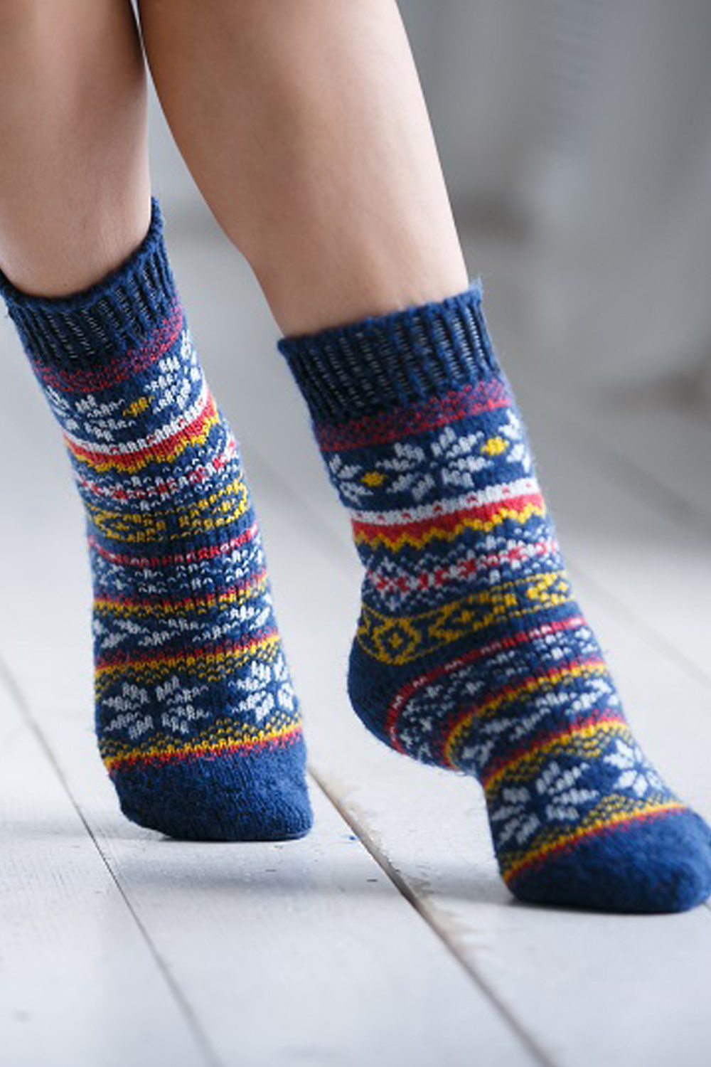 Здоровье человека идёт от ног, поэтому важно держать ноги в тепле не только зимой, но и межсезонье. Теплые вязаные носки с натуральной шерстью в составе согреют и подарят ощущение комфорта. Зимние носки мягкие и неколючие. Они плотно облегают ногу, но резинка не давит, удобны на каждый день, сохраняют яркость цвета и первоначальную форму после многочисленных стирок. Носки долговечны, они будут согревать вас несколько зимних сезонов. Шерстяные носки станут спасением в самые сильные морозы. Ногам будет комфортно даже при температуре до -40°С. Шерсть имеет уникальную способность быстро согревать и длительное время поддерживать правильную терморегуляцию. Она хорошо пропускает воздух и позволяет коже дышать. Также быстро отводит влагу, оставаясь при этом сухой. Шерстяные носки отлично тянутся, благодаря чему не сковывают движений. Благодаря полиамидным нитям имеют повышенную прочность изделия от истираний и разрывов, что значительно увеличивает продолжительность их службы. Шерстяные носки достаточно плотные, при этом мягкие, не раздражают, не вызывают зуда и не колются. Имеют широкую резинку и связаны с учетом анатомической формы ступни и голеностопа. В составе натуральной шерсти находятся природные соединения и ланолин, обладающие антисептическим эффектом. Это позволяет им оставаться свежими даже после нескольких дней ношения. Носочки с очаровательным зимним рисунком идеально подойдут для уютной новогодней фотосессии, для себя или в подарок близким на Новый год и другие праздники. Теплые носки станут прекрасной покупкой на зимний сезон. Подходят для занятия спортом: под коньки, лыжные и треккинговые ботинки. Они согревающие, поэтому незаменимы для рыбалки, охоты или во время прогулок на свежем воздухе. Теплые вязаные носки будут отличным подарком маме, бабушке, жене, подруге или коллеге. Особенно оценят данный подарок пожилые бабушки в холодные осенние и зимние вечера на даче или дома, кто имеет малоподвижную работу или часто находится на сквозняках.