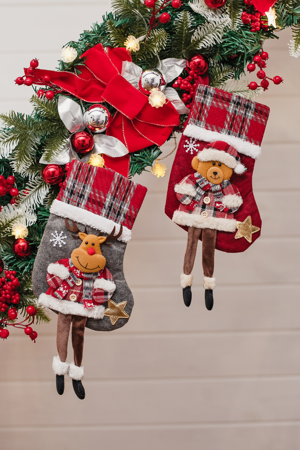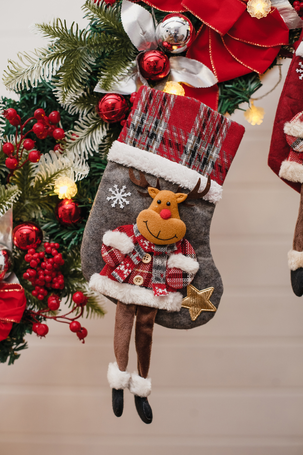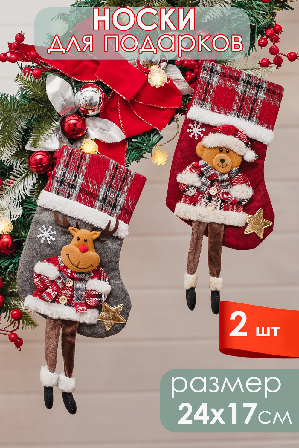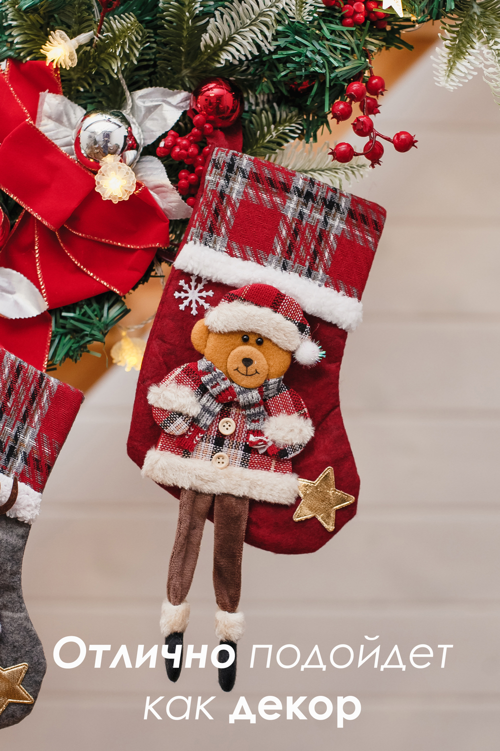 Подарочный носок?сапожок — это одновременно милый декор и удобная, экологичная упаковка для новогодних презентов. Корпус выполнен из плотной ткани. Аппликация — олень или мишка — вырезана и сшита из фетра, дополнена декоративной строчкой, помпонами и элементами, придающими лицам животных выразительность и объём. Главная фишка модели — висячие ножки. Ножки добавляют динамики при подвешивании и создают игривый акцент на камине, поручне или ёлке. Верхний край снабжён петлёй для подвеса. Это отличный выбор для семейной упаковки, корпоративных наборов и тематических подарков. Носок выглядит как самостоятельный подарок. Сапожек новогодний — не просто упаковка: он сам по себе становится частью подарка и может использоваться снова и снова.