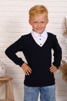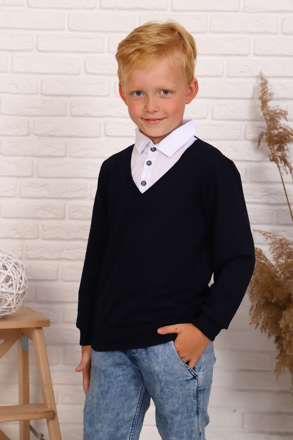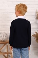 Джемпер для мальчиков младшего и старшего школьного возраста, из однотонного трикотажного полотна футер с лайкрой, сорочечной ткани и кашкорсе. Джемпер прямого силуэта, имитация рубашки под толстовкой, с втачным рукавом, с центральной застежкой спереди на петли и пуговицы. Спинка и перед из футера с лайкрой на поясе из эластичной ткани кашкорсе. Рукав одношовный, длинный. Низ рукава на манжете из кашкорсе. Воротник стояче-отложной рубашечный, выполнен из сорочечной ткани. По стойке и воротнику проложены отделочные строчки. Спереди кокетка из сорочечной ткани с застежкой и обтачка из кашкорсе.