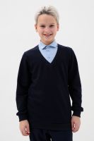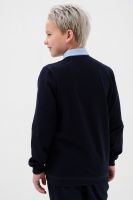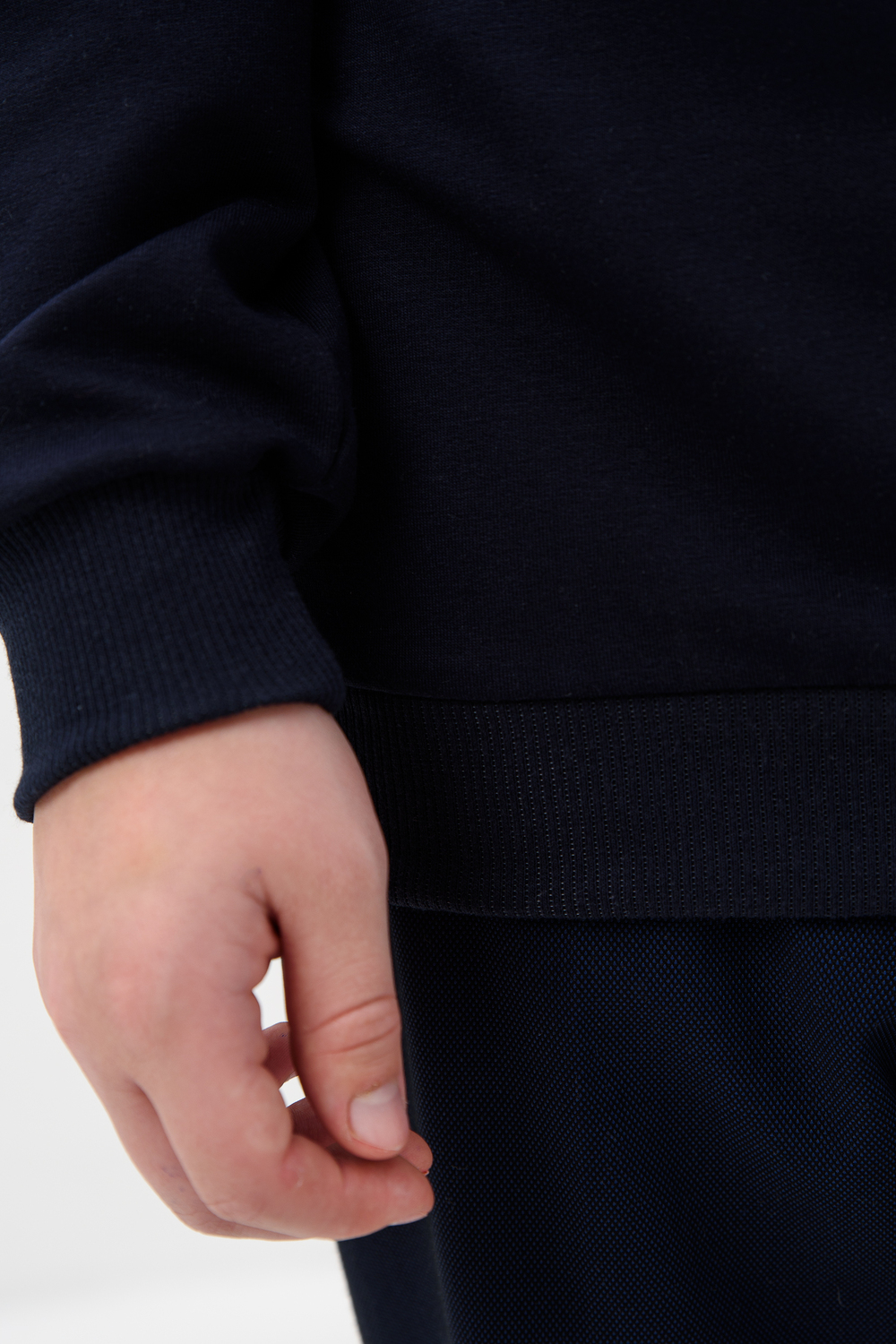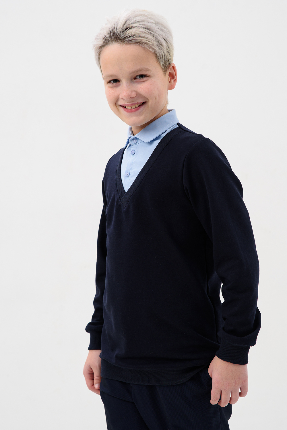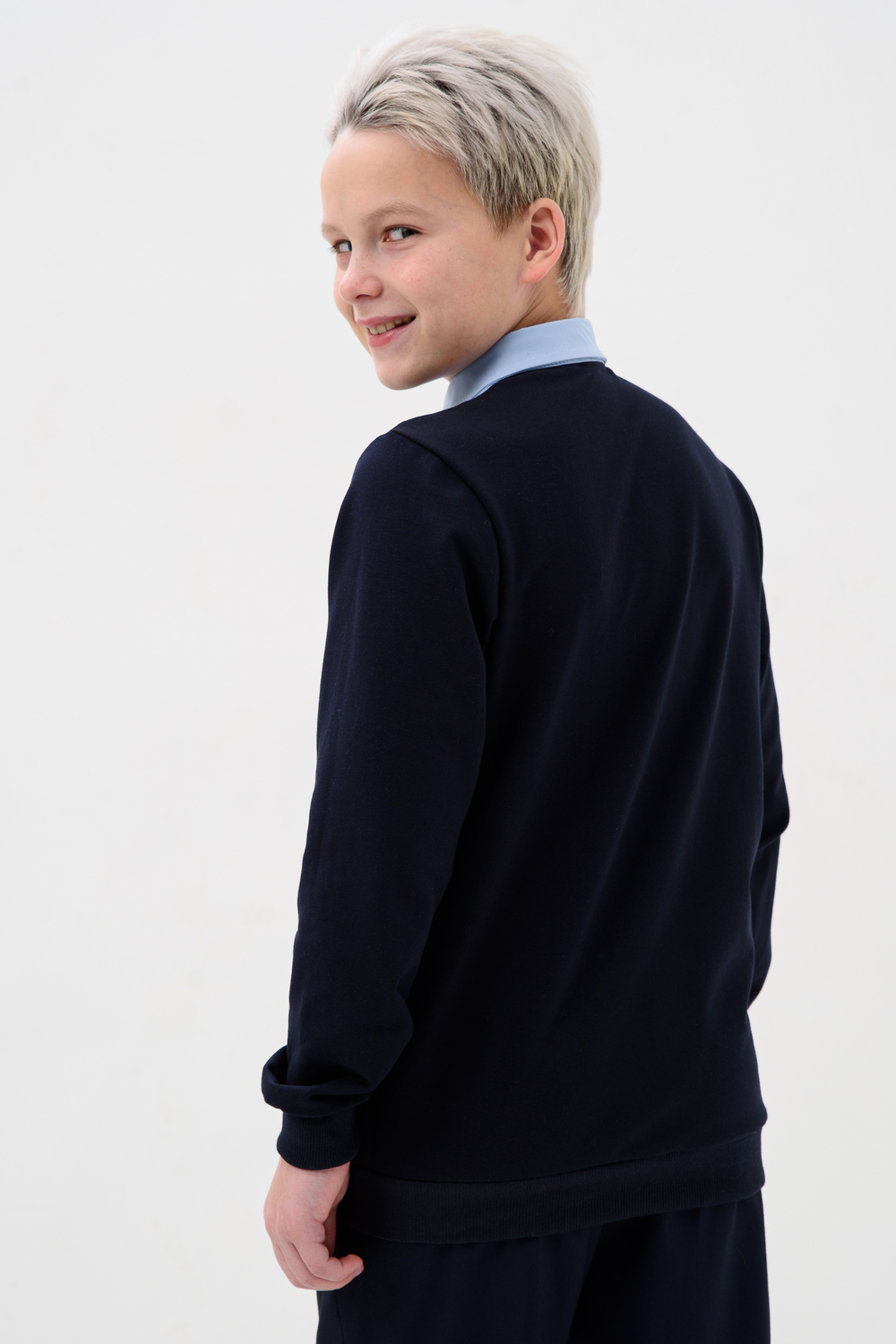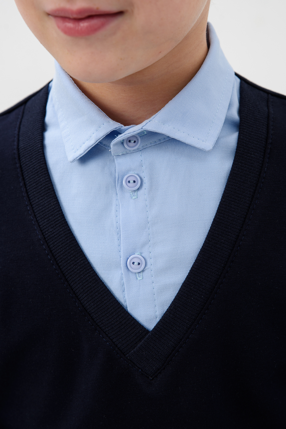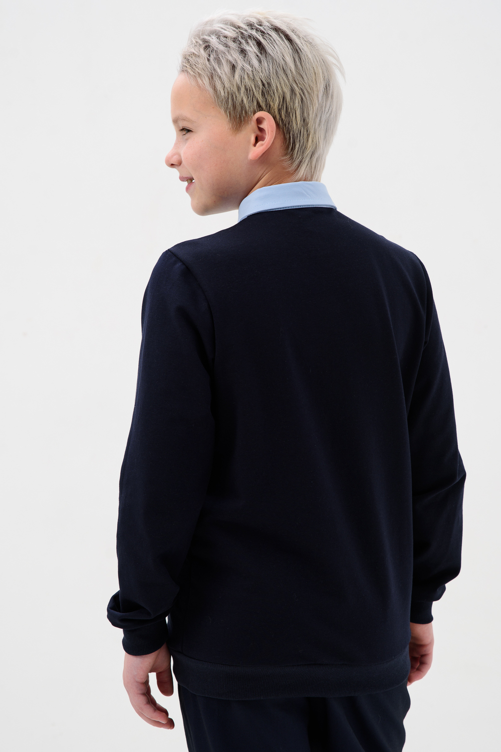 Джемпер для мальчиков младшего и старшего школьного возраста, из однотонного трикотажного полотна футер с лайкрой, сорочечной ткани и кашкорсе. Джемпер прямого силуэта, имитация рубашки под толстовкой, с втачным рукавом, с центральной застежкой спереди на петли и пуговицы. Спинка и перед из футера с лайкрой на поясе из эластичной ткани кашкорсе. Рукав одношовный, длинный. Низ рукава на манжете из кашкорсе. Воротник стояче-отложной рубашечный, выполнен из сорочечной ткани. По стойке и воротнику проложены отделочные строчки. Спереди кокетка из сорочечной ткани с застежкой и обтачка из кашкорсе.