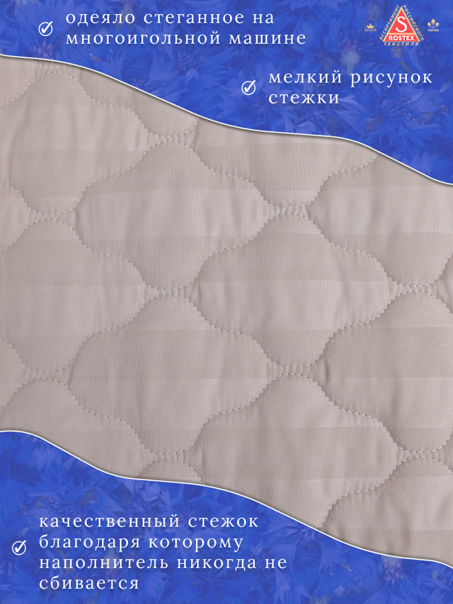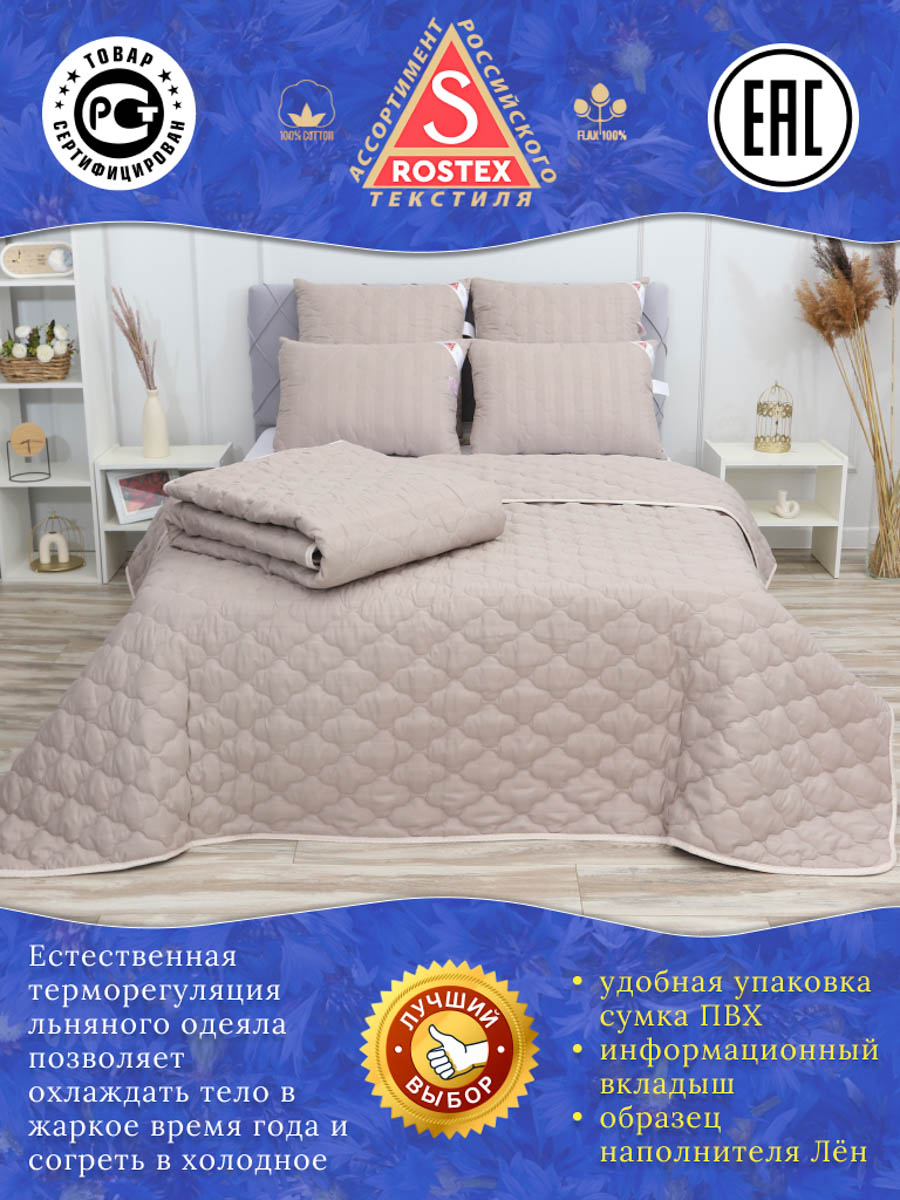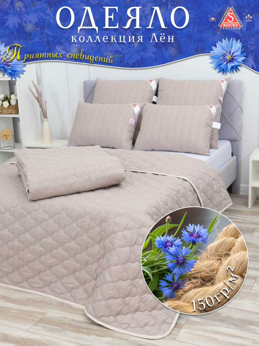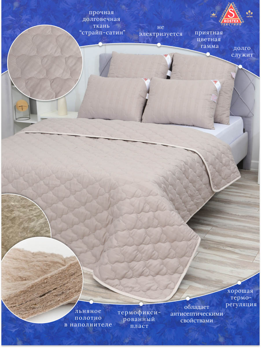Одеяло Лён, стёганное на многоигольной машине из высококачественной ткани страйп-сатин, наполнитель натуральное термоскреплённое волокно лён пласт. Льняное волокно это плотный однородный наполнитель, не портится со временем, хорошо держит форму, гипоаллергенный, обладает антисептическими свойствами и хорошей терморегуляцией, не боится моли, долго служит. Естественная терморегуляция волокон позволяет охладить тело в жаркое время года и согреть в холодное.