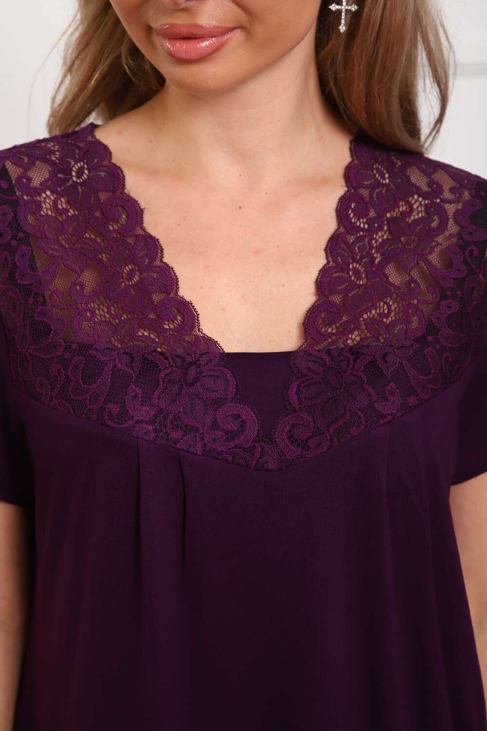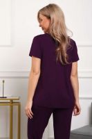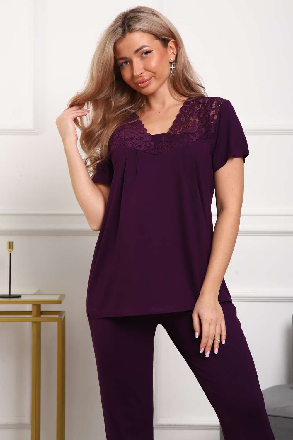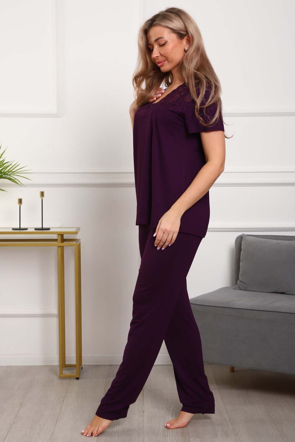 Пижама женская из вискозы. Состоит из туники и брюк. Верх прямого силуэта, чуть расклешённый к низу, ниже середины бедра. Рукав короткий. Горловина V-образной формы, отделана кружевом. Низ прямой. Брюки прямые, зауженные к низу. Пояс цельнокроеный, на естественном месте.