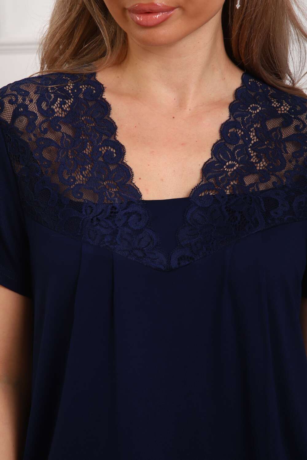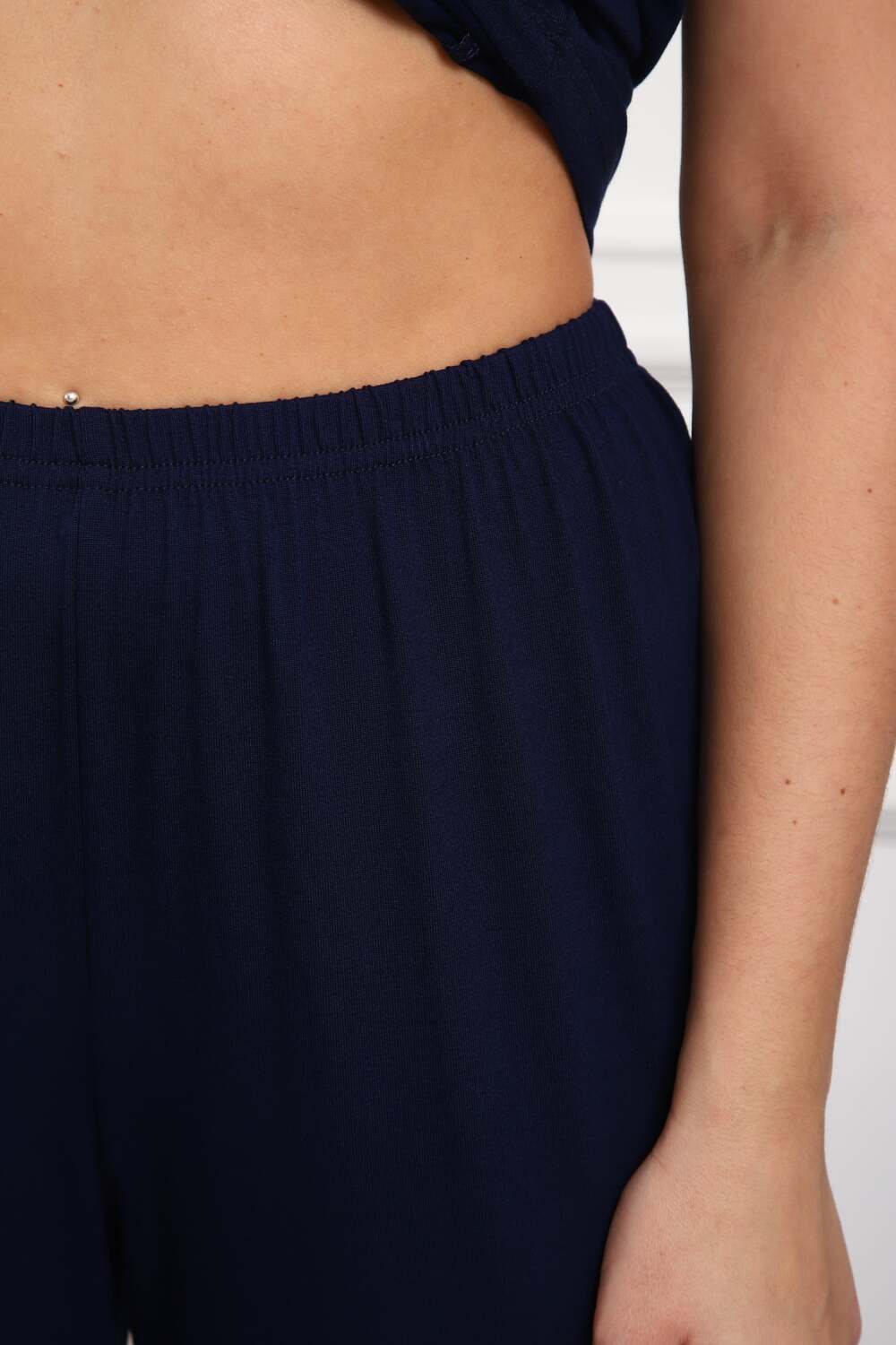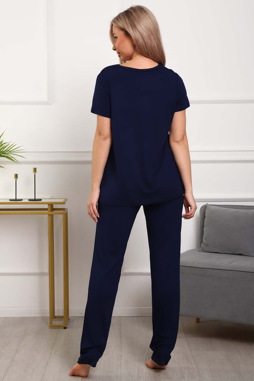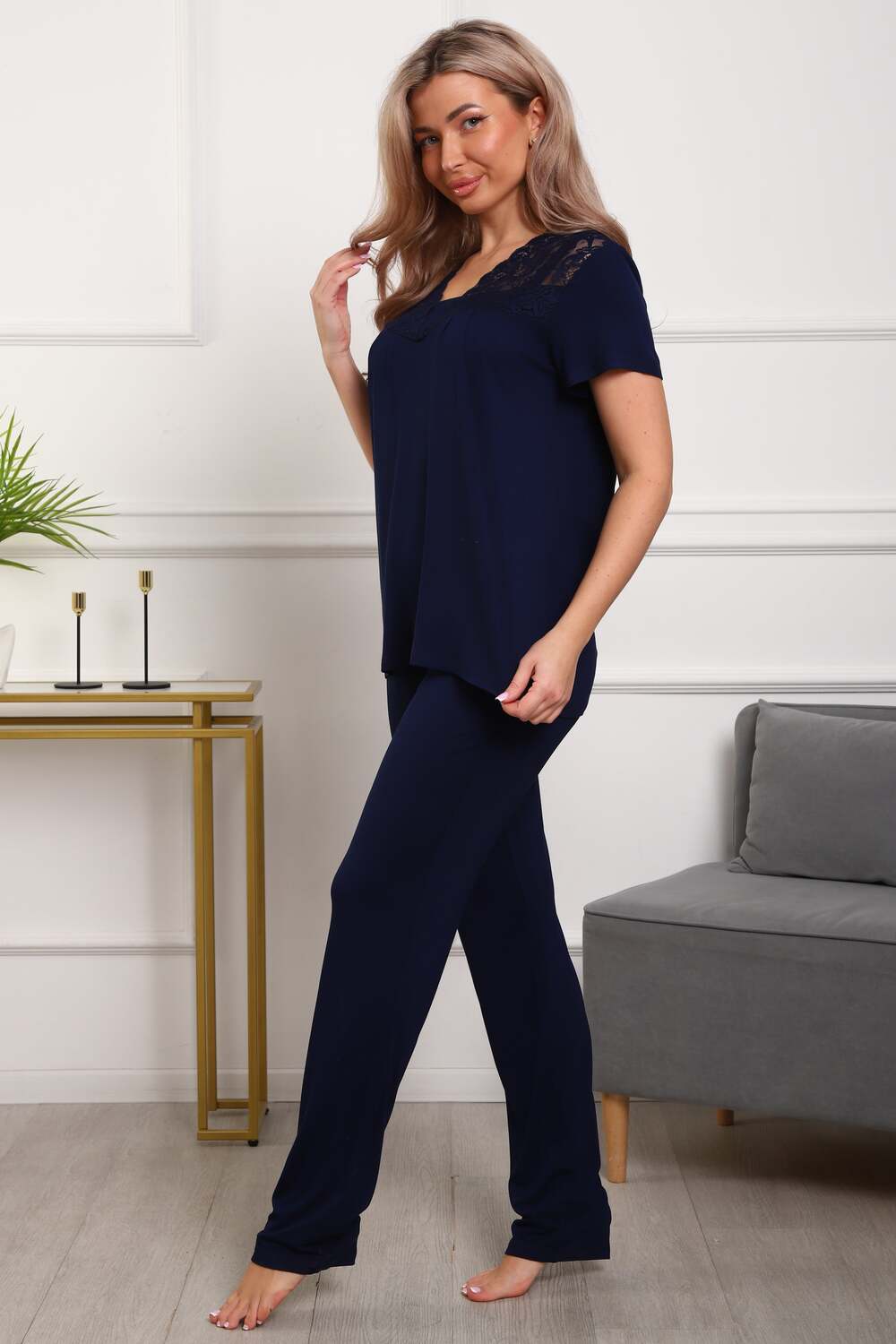 Пижама женская из вискозы. Состоит из туники и брюк. Верх прямого силуэта, чуть расклешённый к низу, ниже середины бедра. Рукав короткий. Горловина V-образной формы, отделана кружевом. Низ прямой. Брюки прямые, зауженные к низу. Пояс цельнокроеный, на естественном месте.