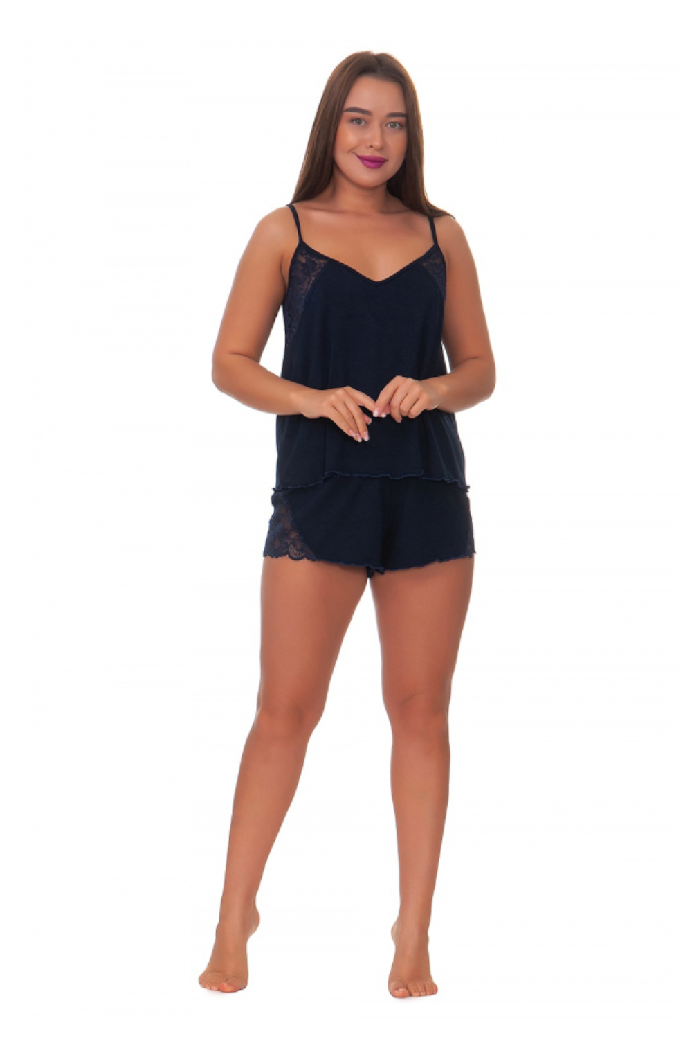 Пижама женская: топ на брительках и шорты с гипюровыми вставками.