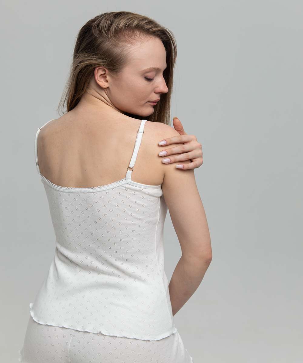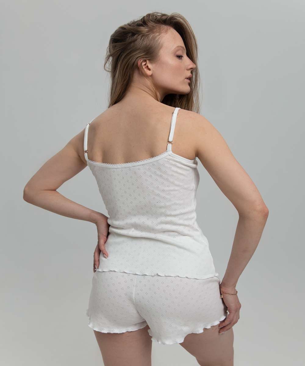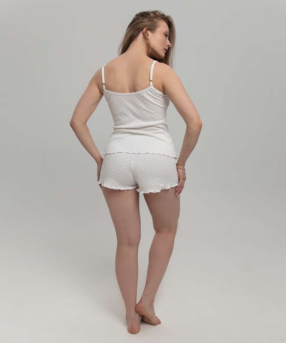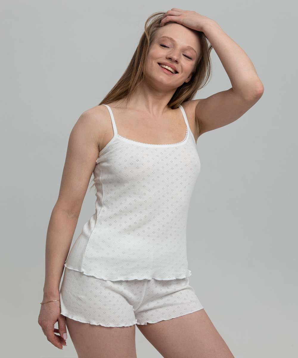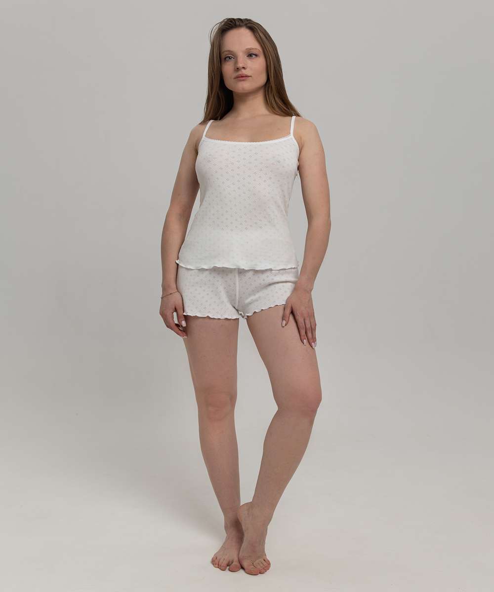 Удобная и милая пижамка из майки на регулируемых бретельках и коротких шортиков. Комплект выполнен из экологически чистого хлопкового полотна специальной эластичной вязки с ажурным рисунком (тип ткани рибана, 100% хлопок). Изделие безупречно садится по фигуре, обработка срезов на краеобметочной машине придает пижаме милый образ. Полочка и спинка отделаны ажурной резинкой, которая не только украшает топ, но и сохраняет от растяжения. Мягкая, удобная, практичная!