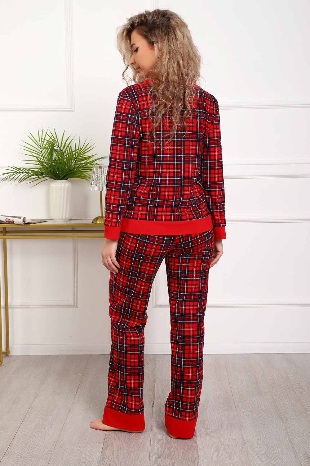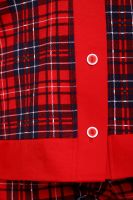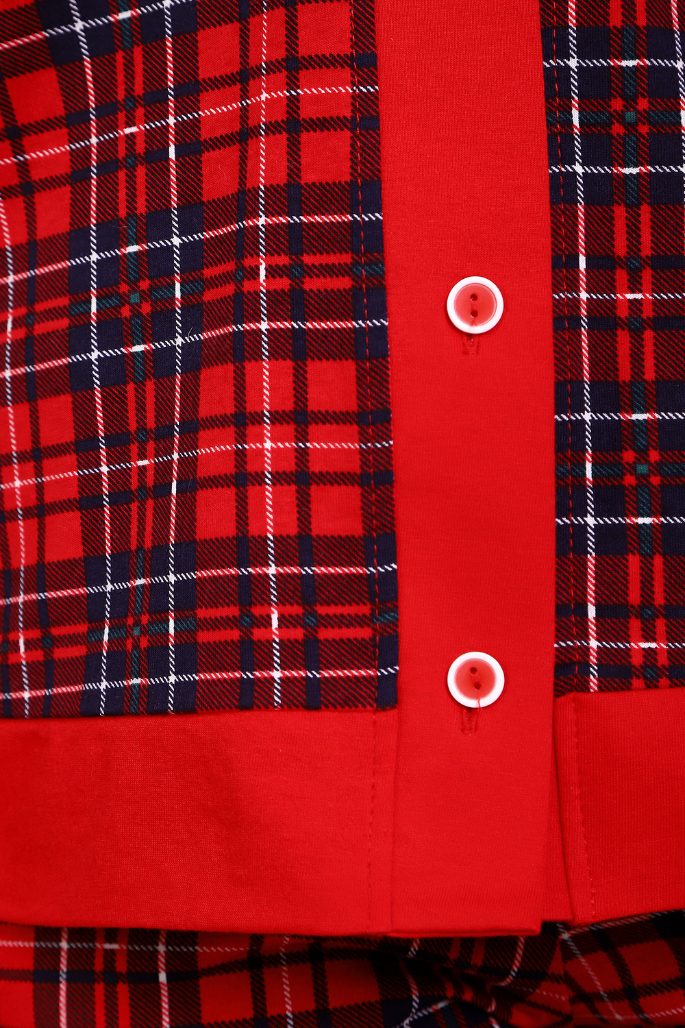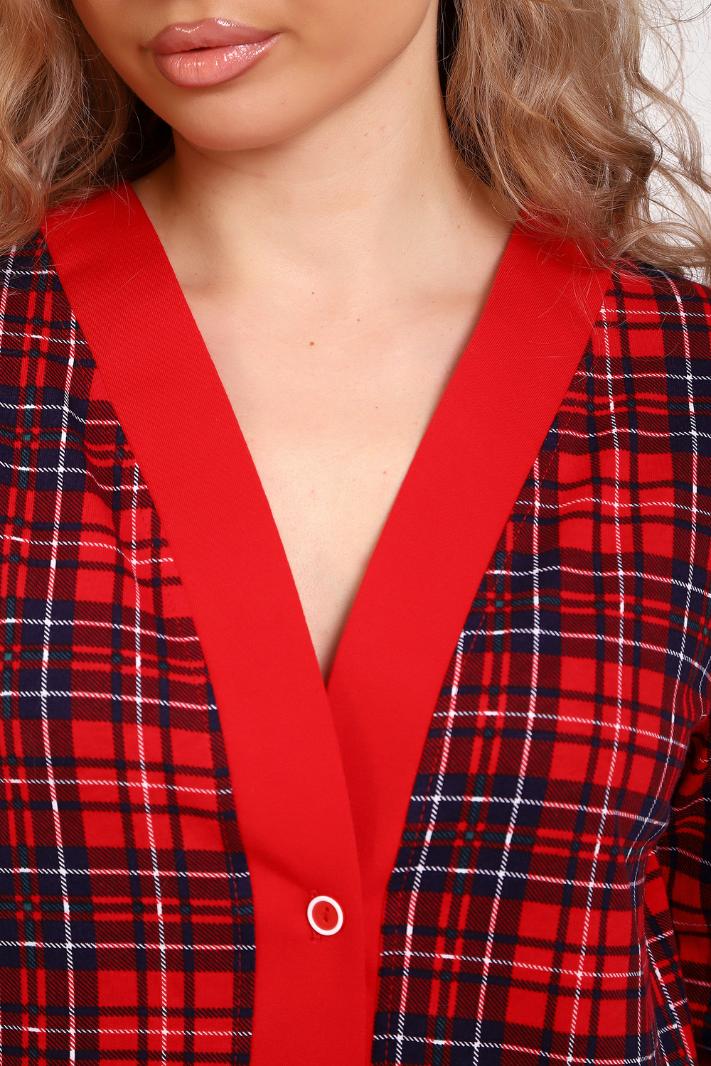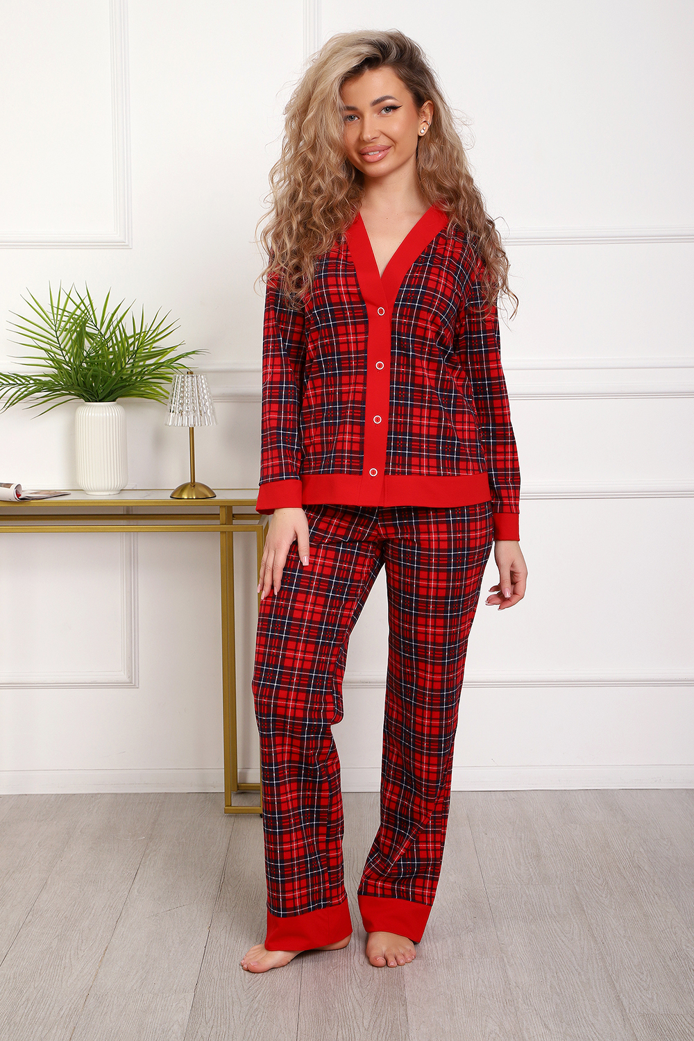 Пижама с брюками представлена в двух расцветках: лёгкий белый цвет с красными сердечками и классическая клетка на красном. Кофта с длинным рукавом с манжетами, низ изделия и застежка обработаны контрастной обтачкой. Кофта с застёжкой на пуговицы, с элегантным V-образным вырезом. брюки с "ленинградскими" боковыми карманами, притачной пояс, низ брюк обработан контрастными манжетами.