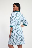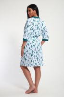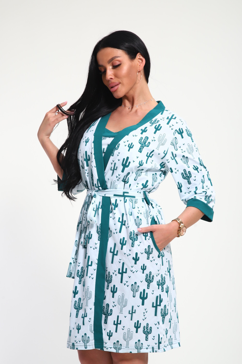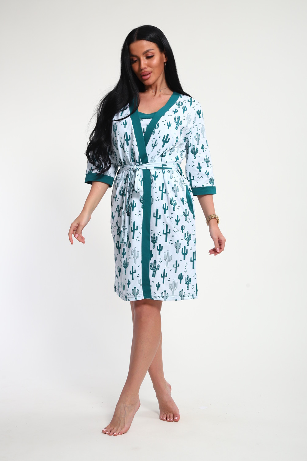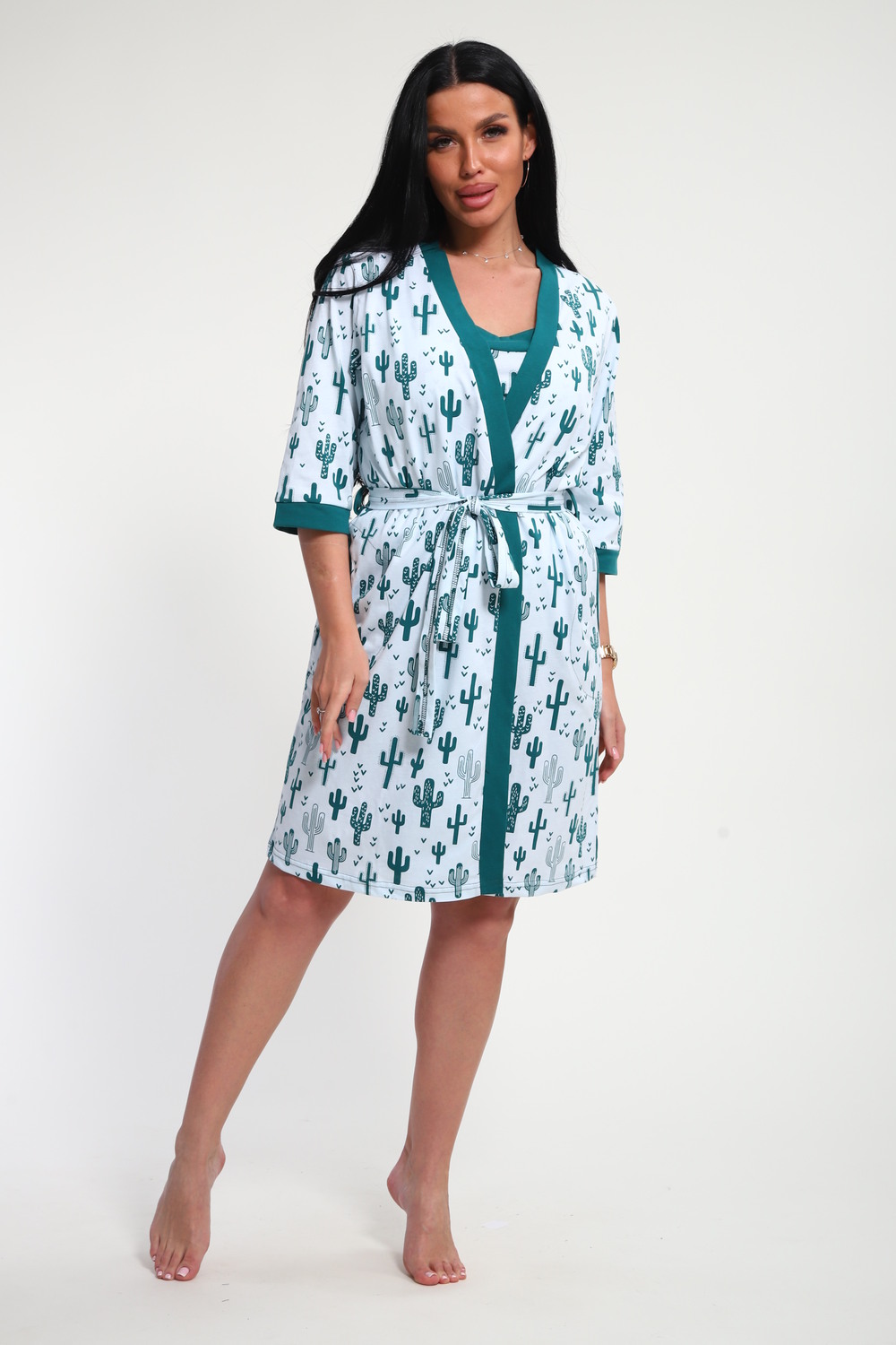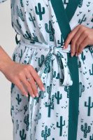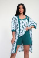 Пижамный костюм из кулирки халат + майка + шорты. Запашной халат с поясом, рукава чуть ниже локтей. Однотонная майка на узких лямках, цветочные вставки. Короткие шорты.
