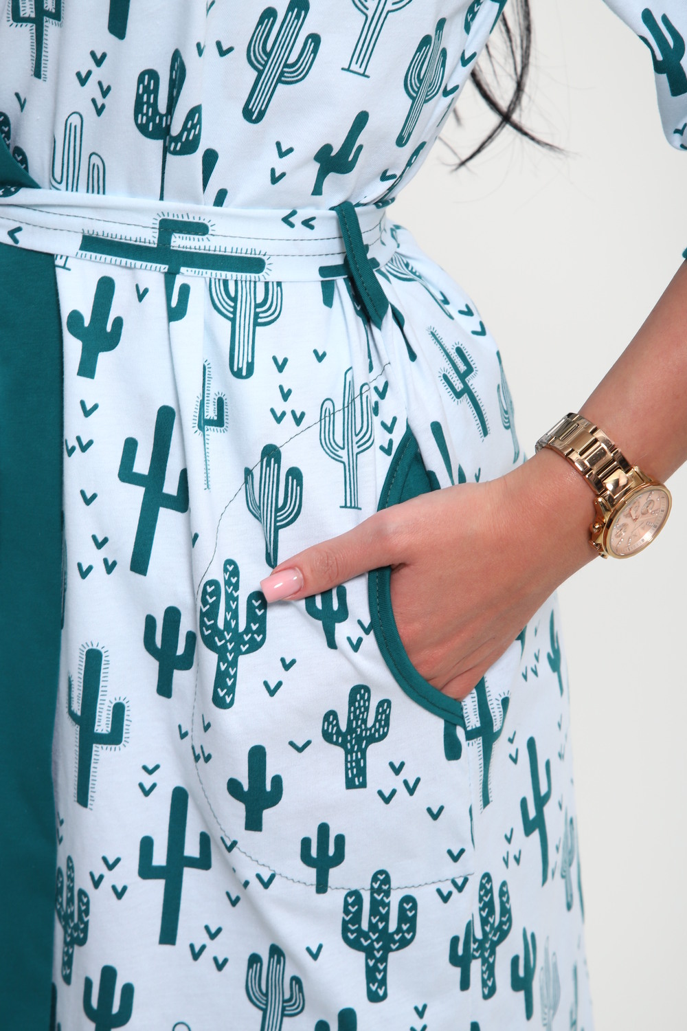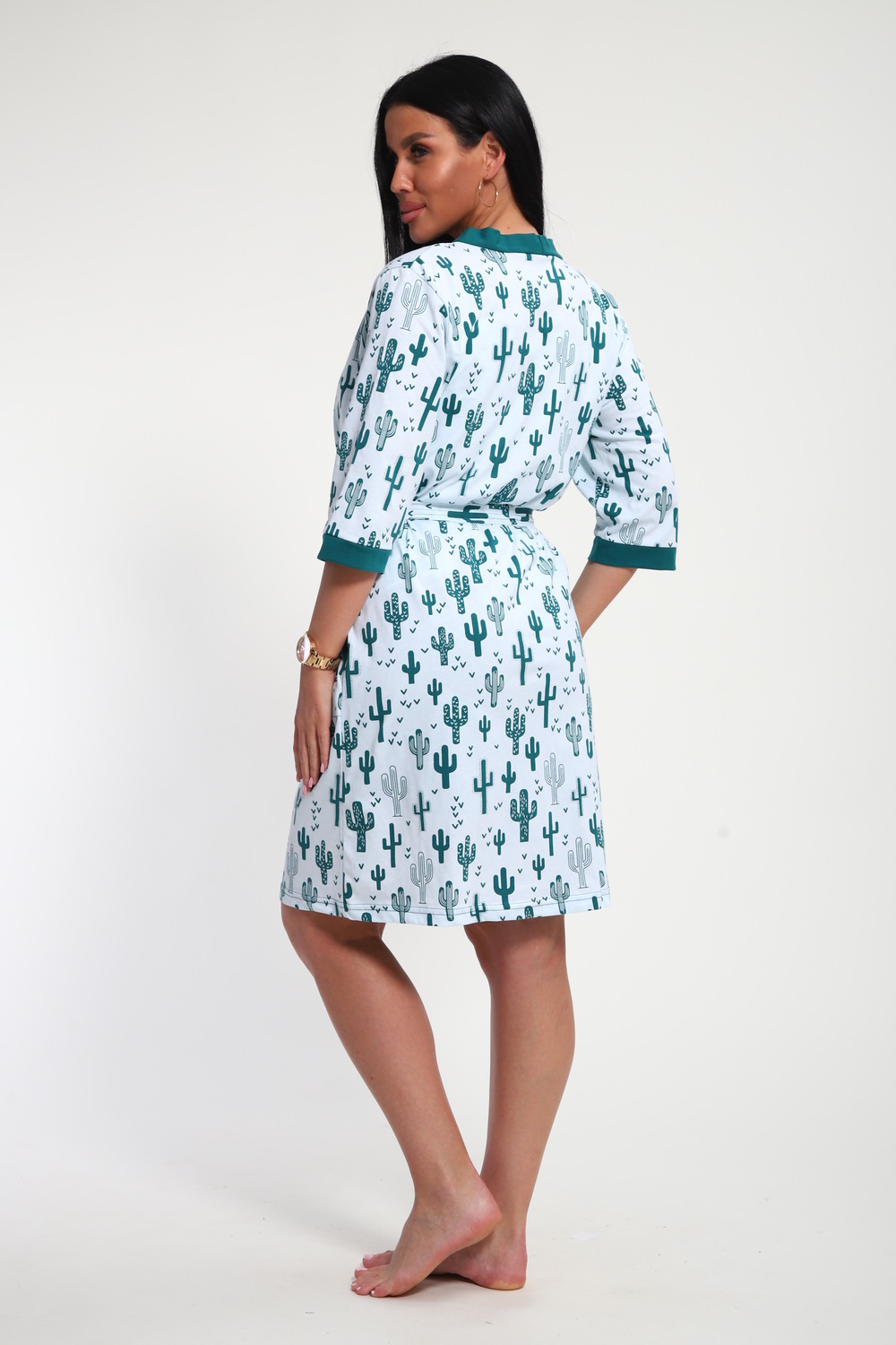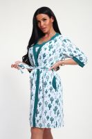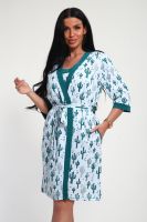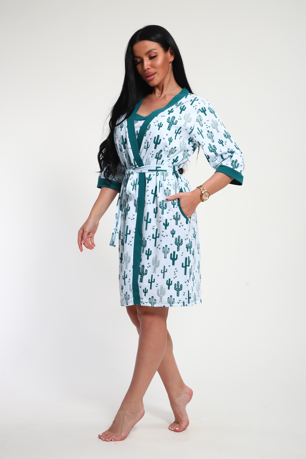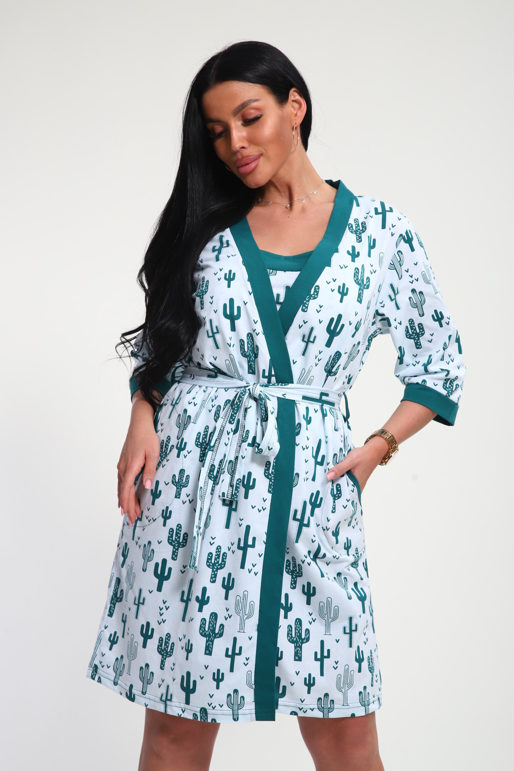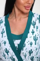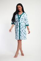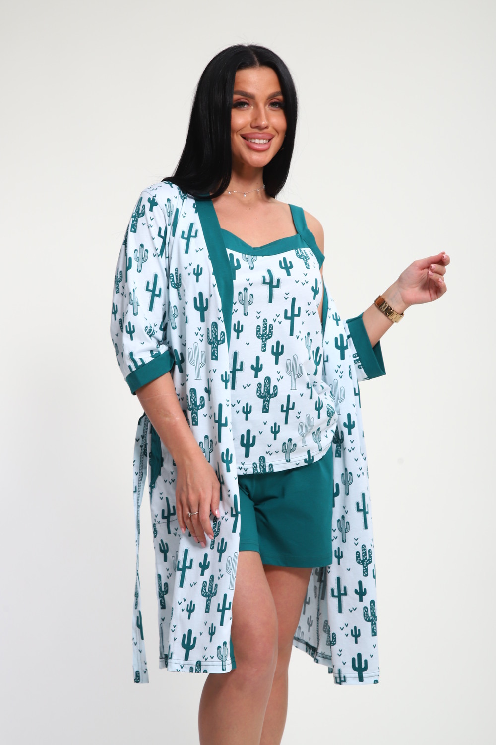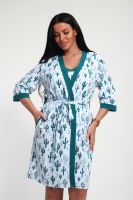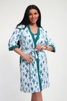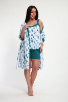 Пижамный костюм из кулирки халат + майка + шорты. Запашной халат с поясом, рукава чуть ниже локтей. Однотонная майка на узких лямках, цветочные вставки. Короткие шорты.