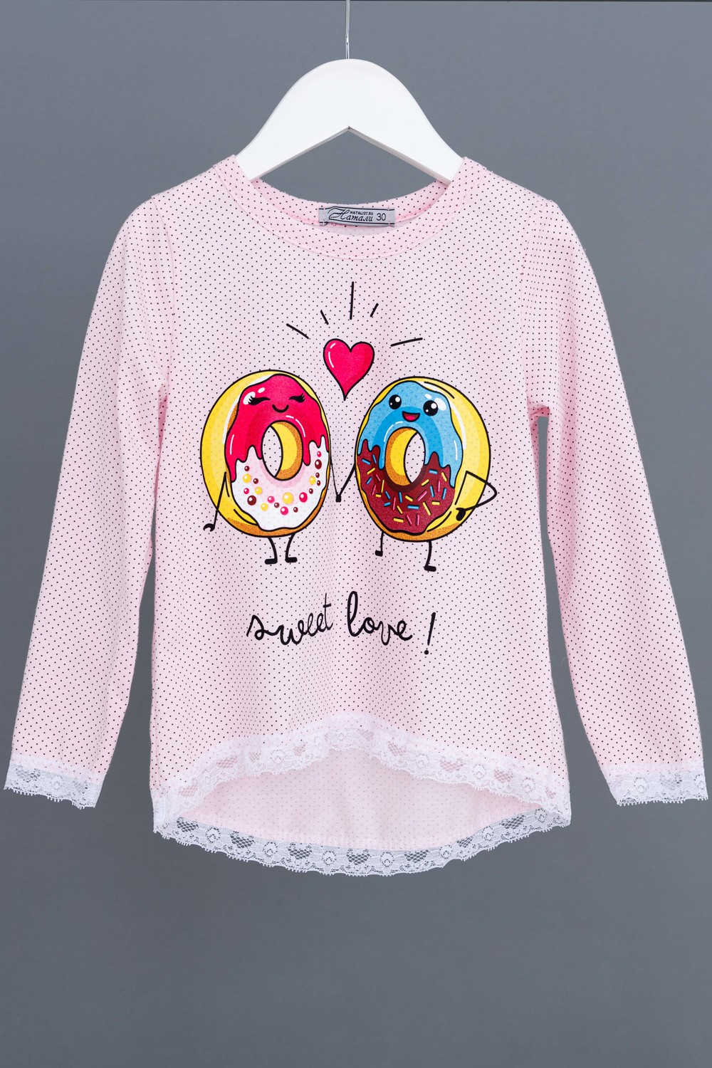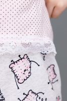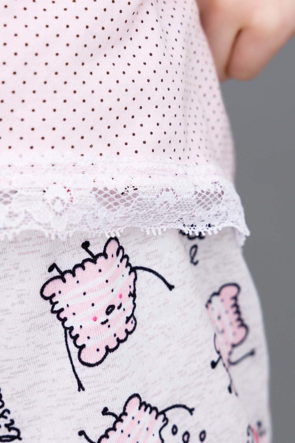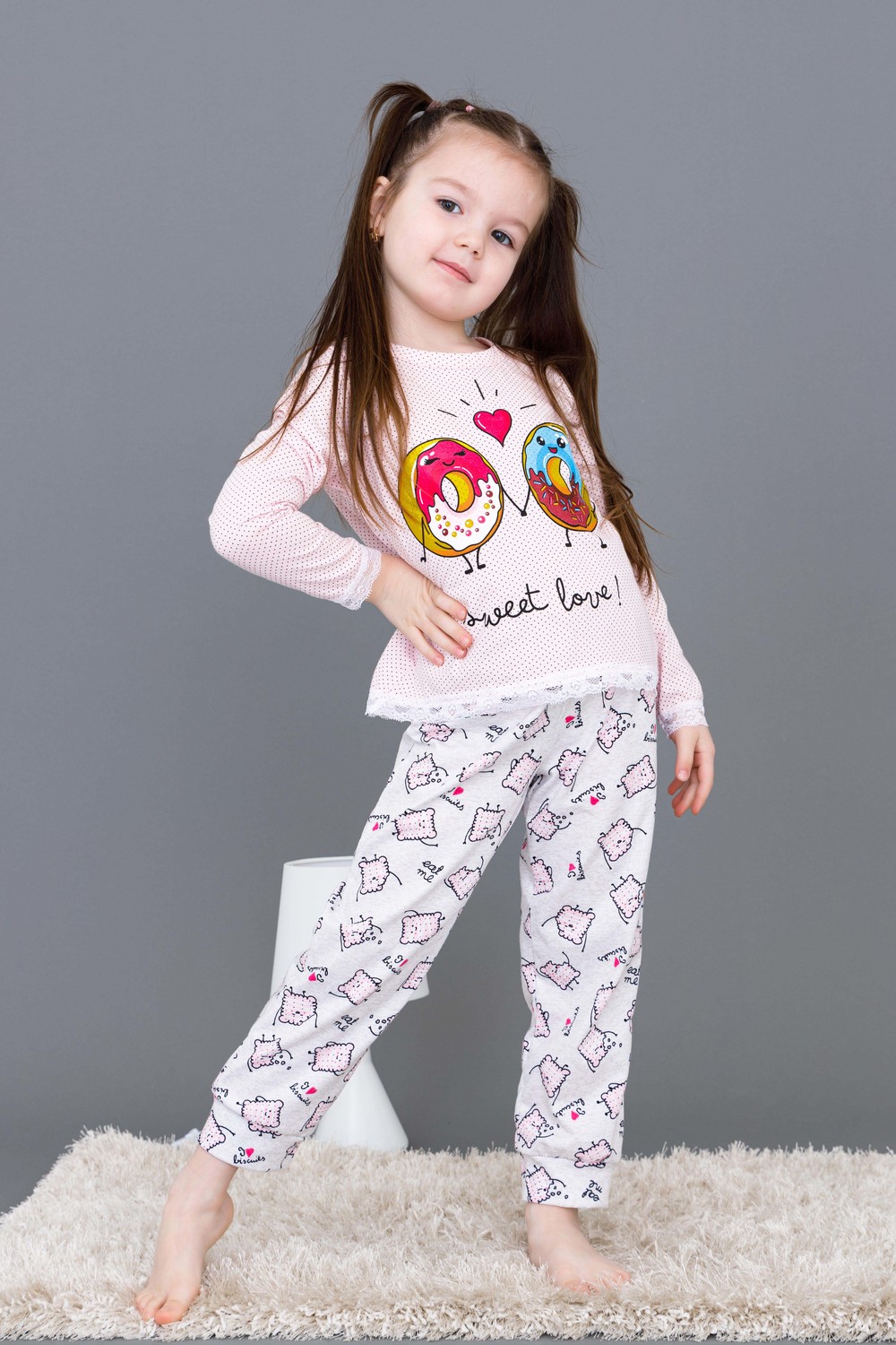 Пижамка детская со сладкой печатью! Изготовлена из гипоаллергенного трикотажа, хлопок не электризуется и обеспечивает циркуляцию воздуха. Пижама свободного кроя, не ограничивает движения. Кофта с длинными рукавами, низки и рукава отделаны мягким кружевом. Штанишки на манжете. На примере пижамы 50506 можно увидеть как выглядит маленький размер. Размерная сетка обеих пижам идентична.