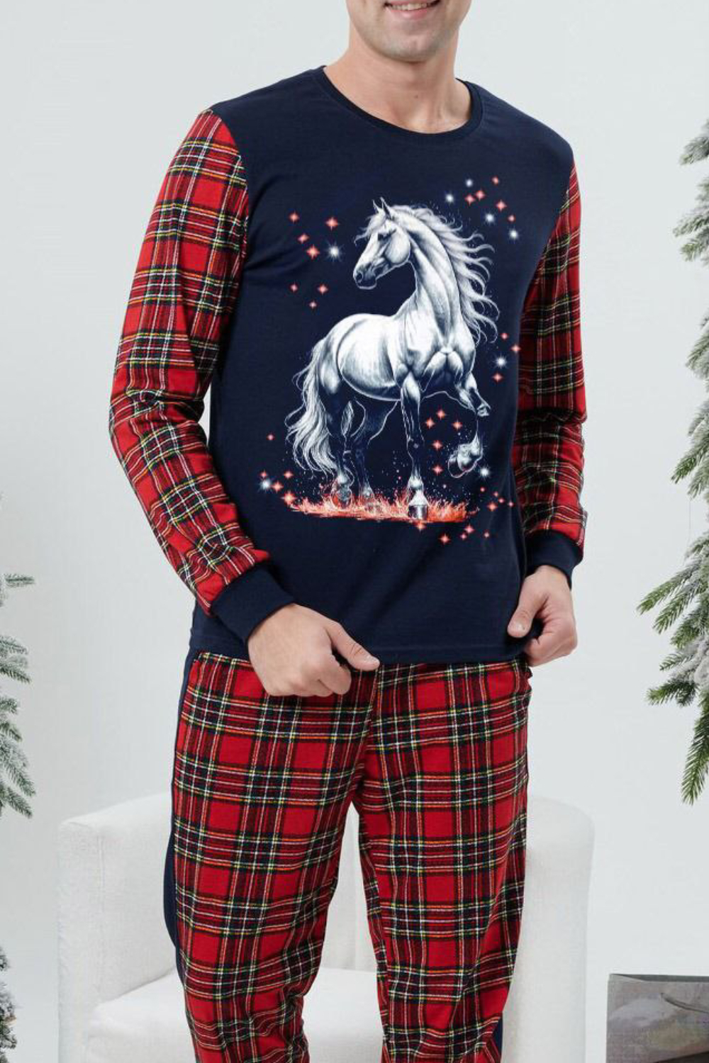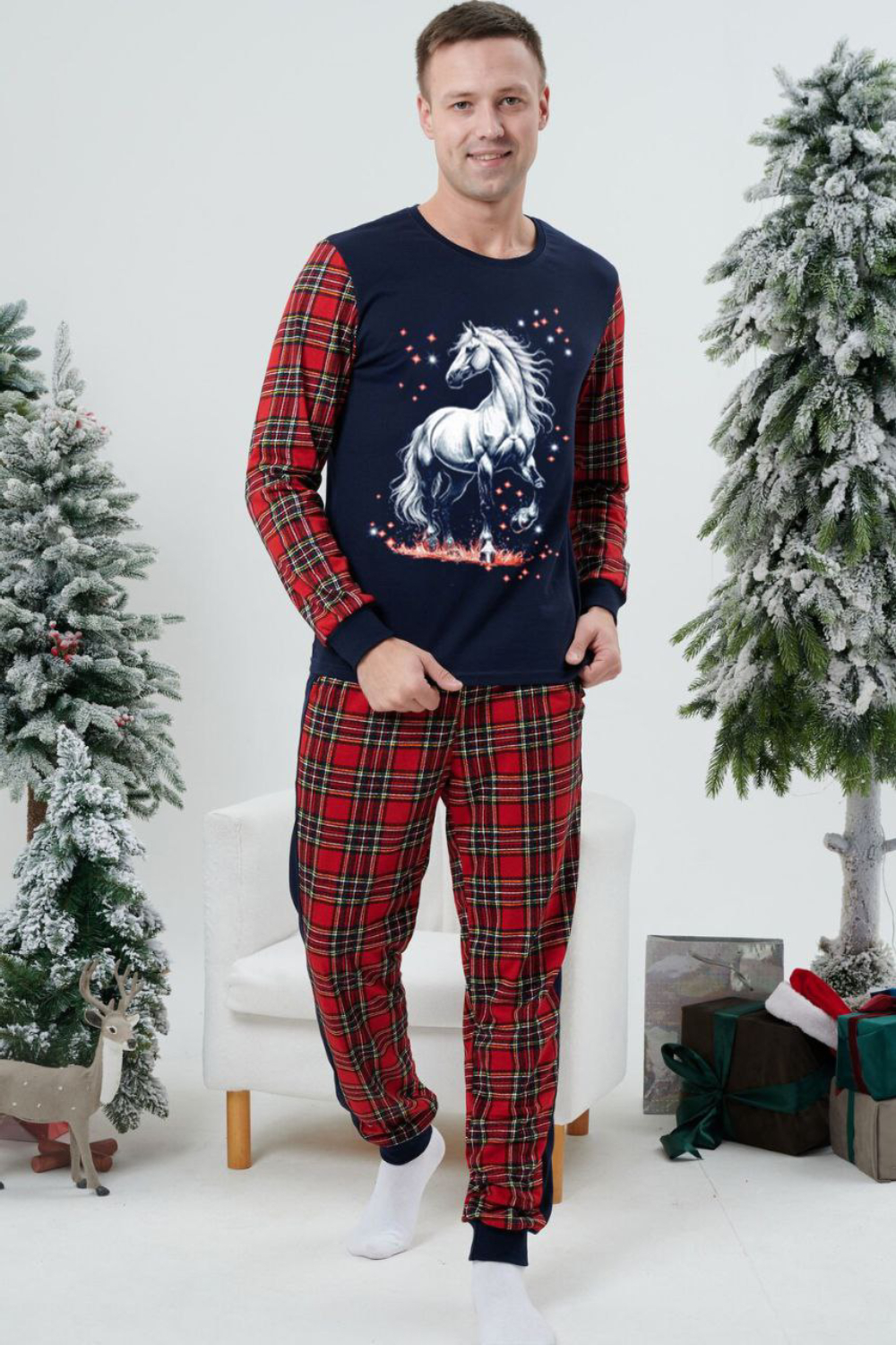Пижама мужская свободного силуэта состоит из кофты и брюк. На полочке принт. Брюки на манжете. В боковых швах карманы.