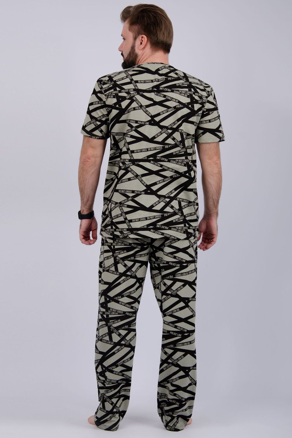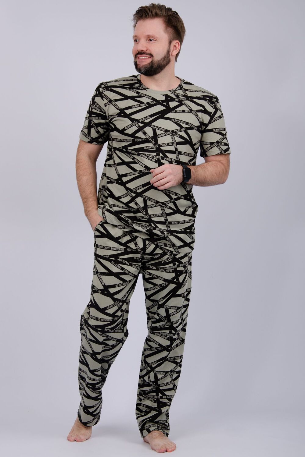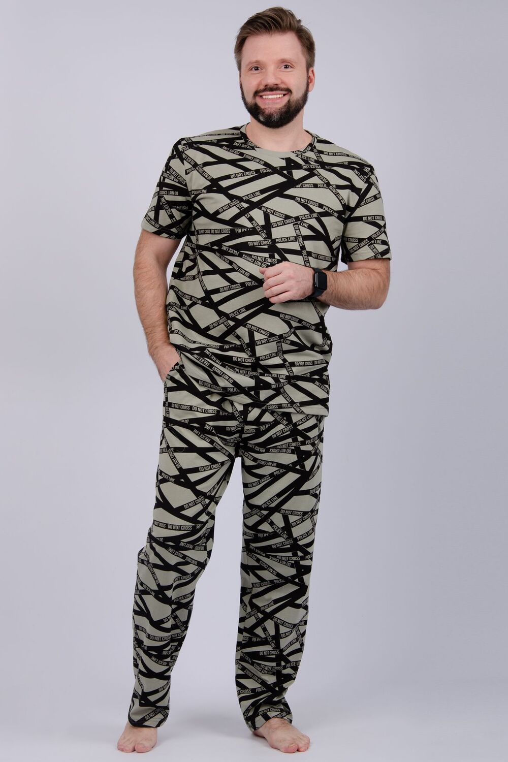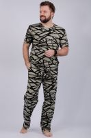Пижама мужская: футболка прямого кроя с короткими рукавами, брюки прямые, с карманами в боковых швах.