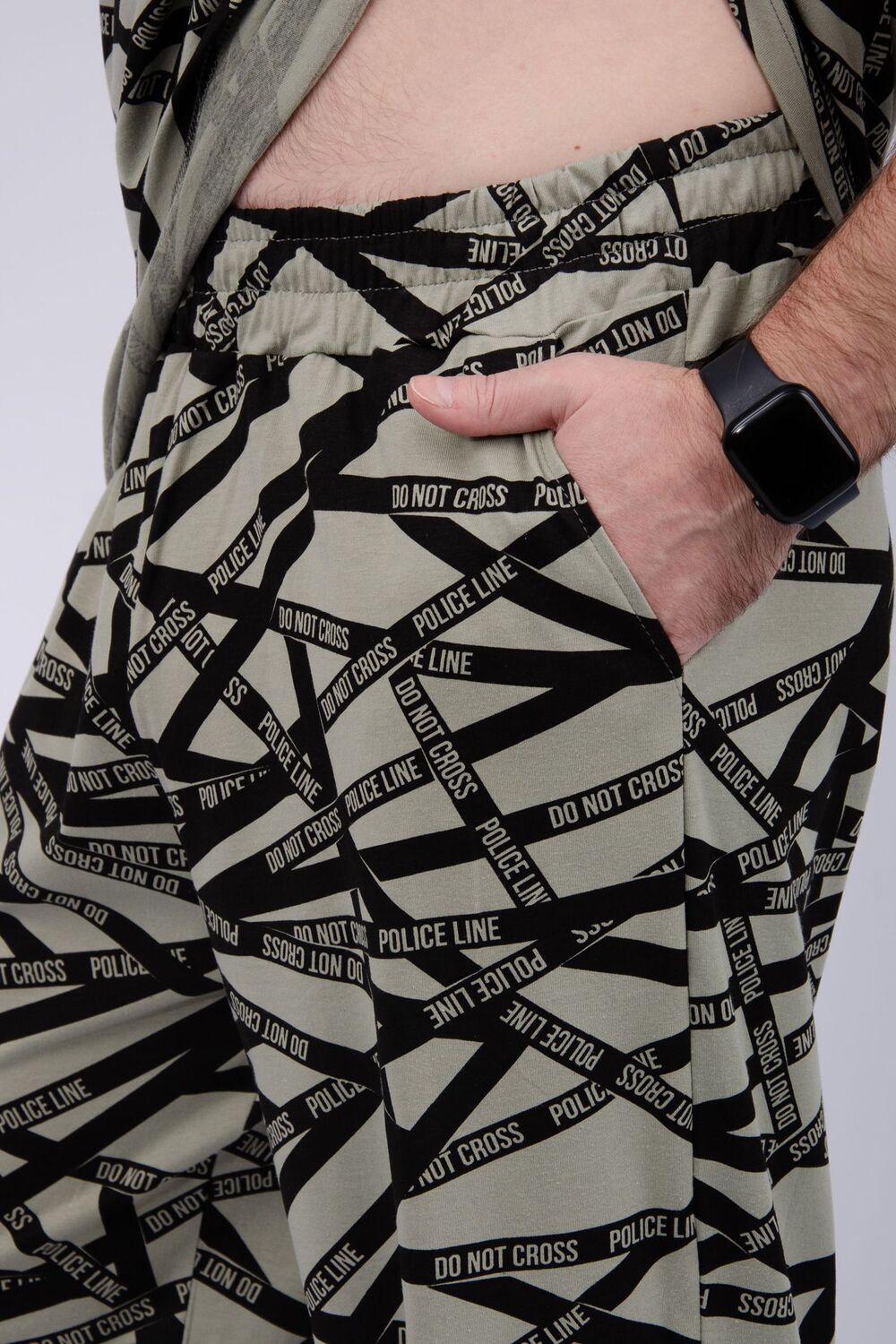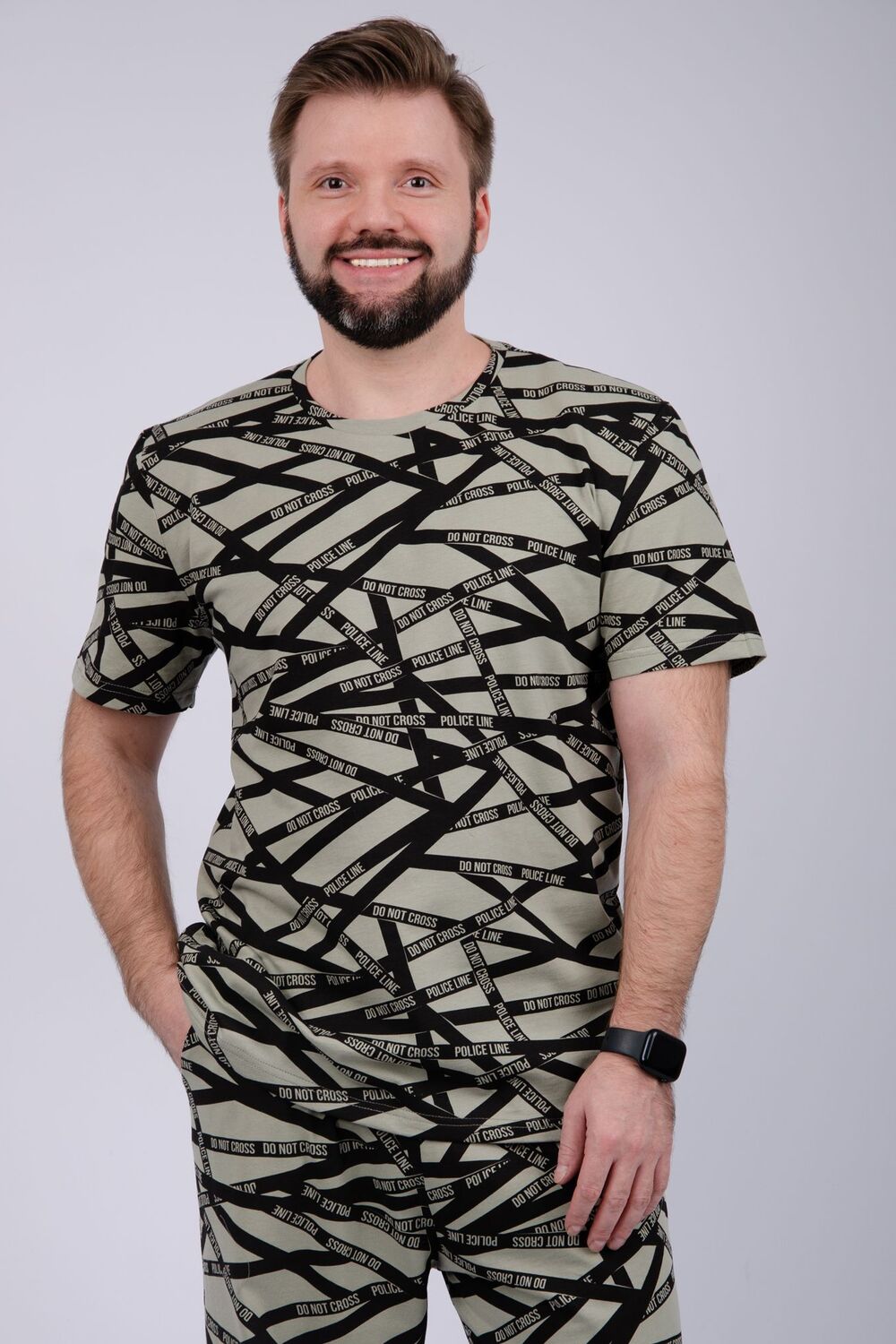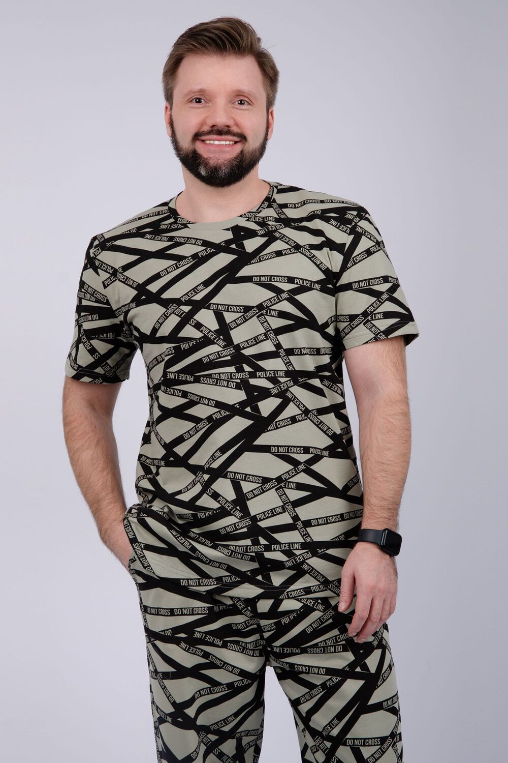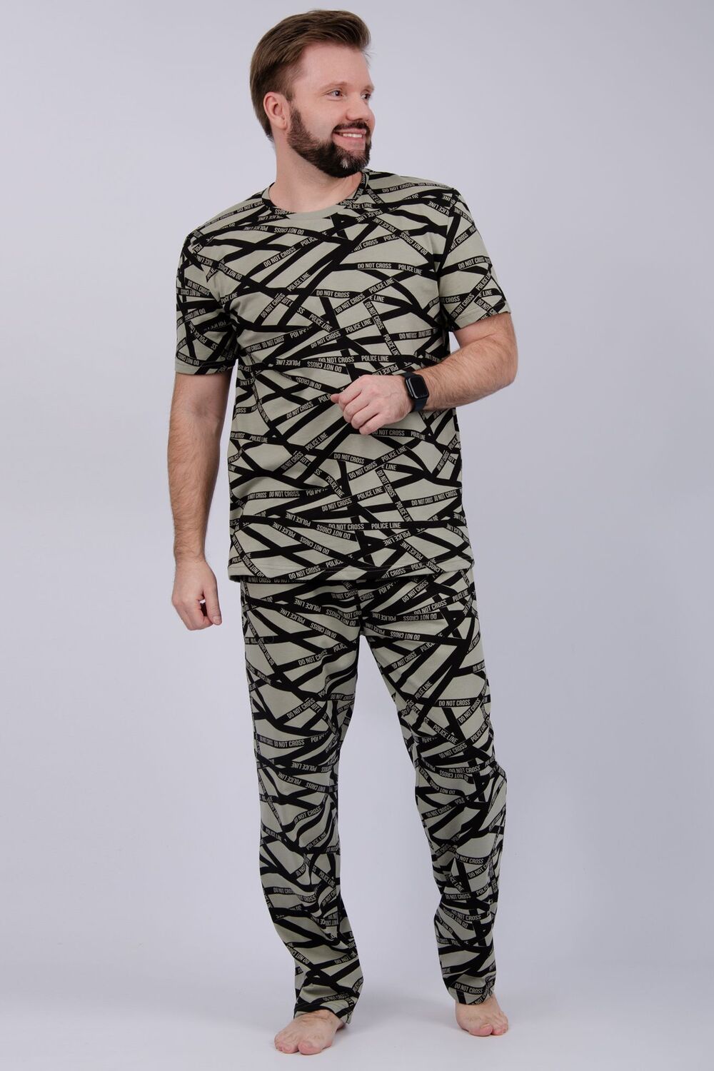Пижама мужская: футболка прямого кроя с короткими рукавами, брюки прямые, с карманами в боковых швах.
