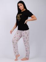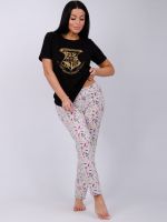 Пижама женская со штанами изготовлена из мягкой ткани (100 % хлопка), которая обладает дышащими и влаговпитывающими свойствами, идеально подходит для сна, обеспечивает максимальную практичность и воздухопроницаемость, облегчая сон даже в самые жаркие и холодные ночи. Женский домашний костюм состоит из стильной тонкой ночной футболки с коротким рукавом и легких брюк, которые создают комфортный домашний уют дома. Милая женская пижамка украшена принтом. Пижама женская яркая и в тоже время нежная, идеальна для беременных, будущих мам или в роддом, ведь в этой пижаме для беременных удобно весь день. Носить можно в любое время года: осенью или даже зимой под согревающим одеялом.