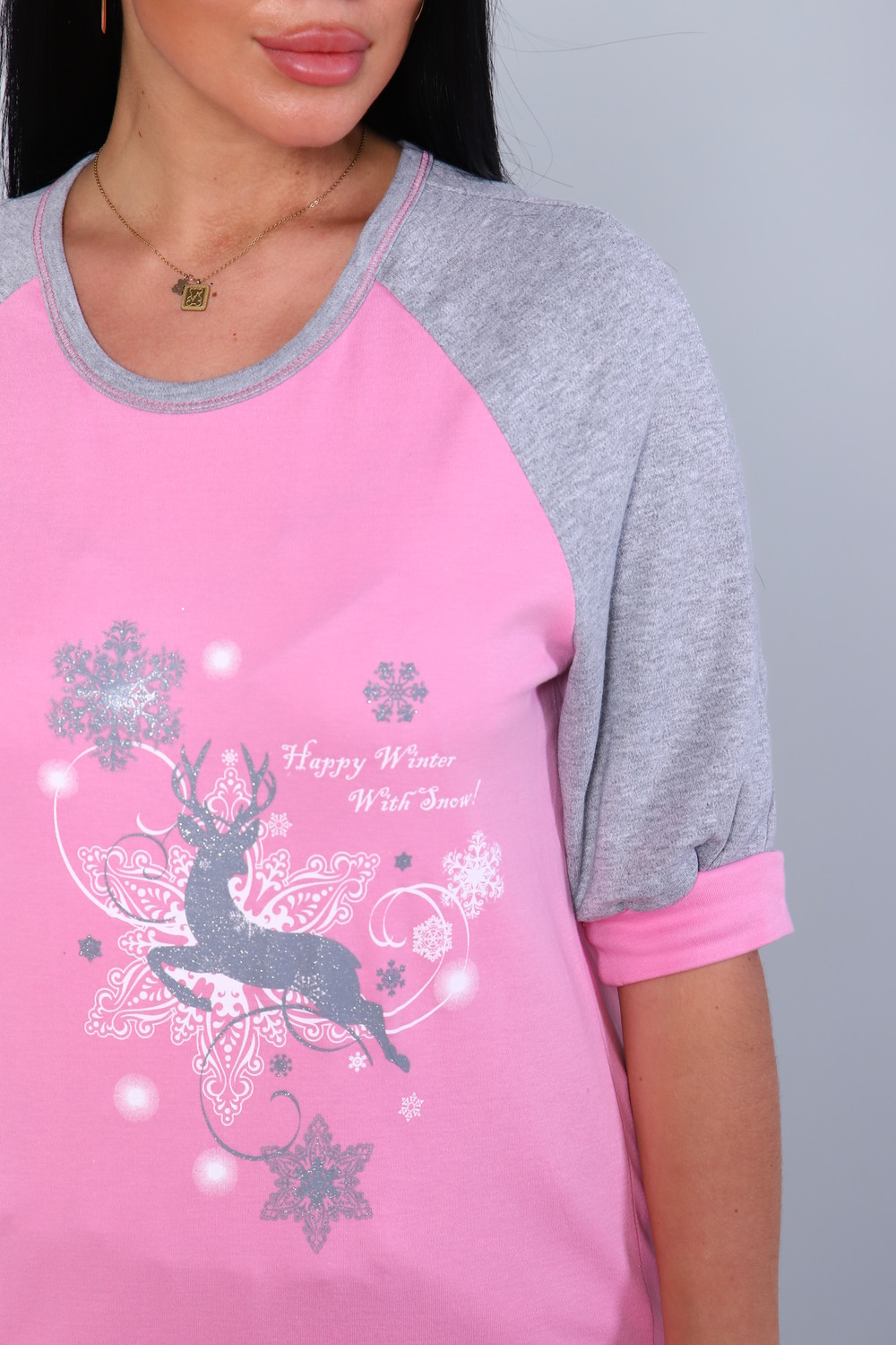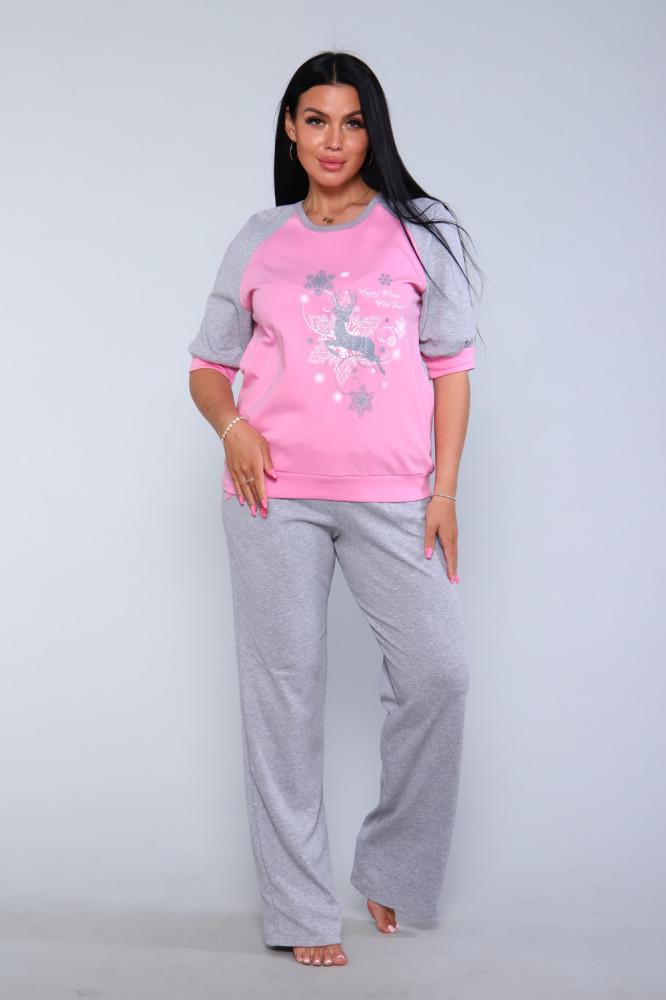 Яркая пижама с длинными брюками свободного силуэта. Кофта с укороченным рукавом реглпан на манжете и декоративной, глянцевой печатью в стиле шелкографии с добавлением глитерра. Брюки на резинке имеют отделку кантом на карманах.