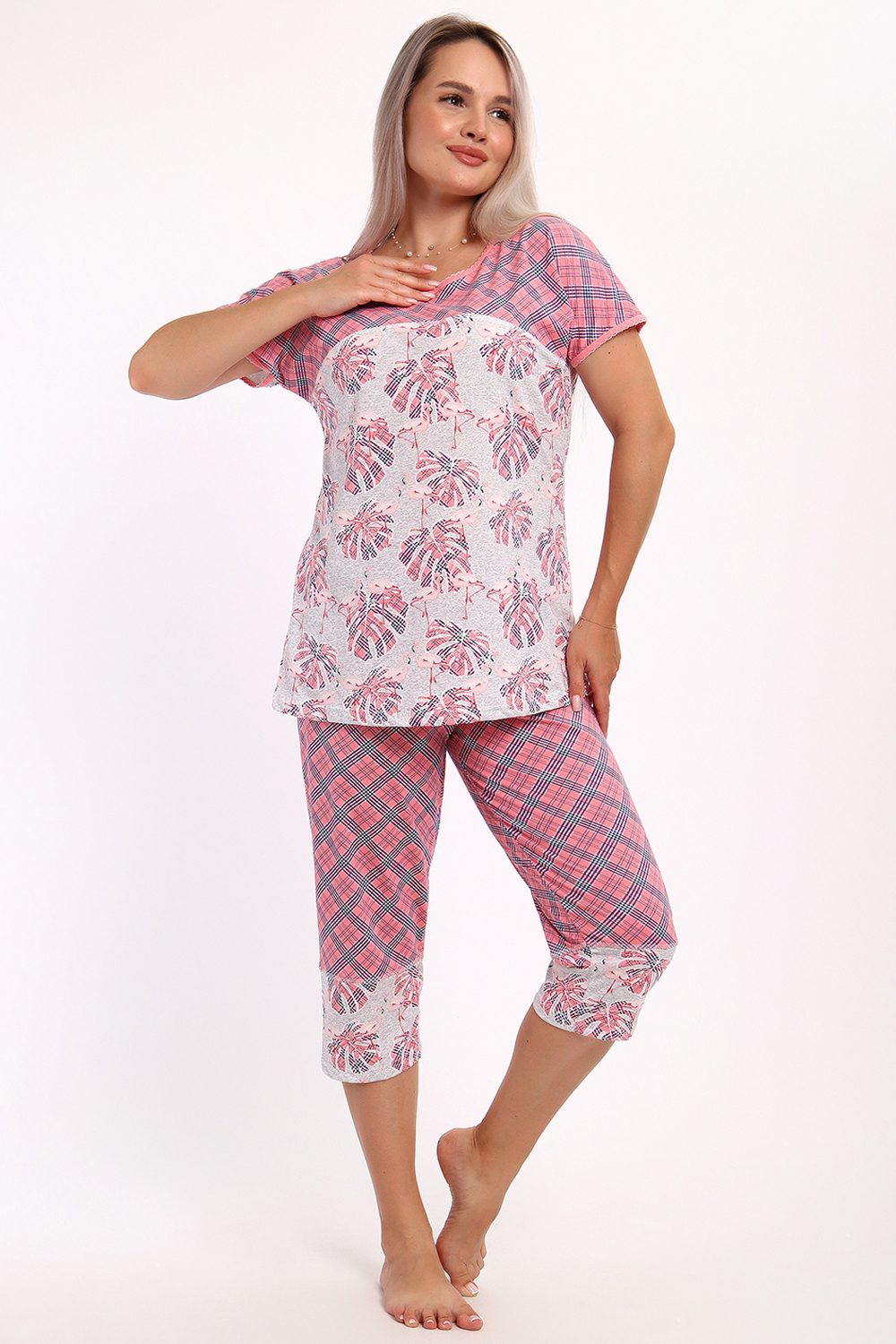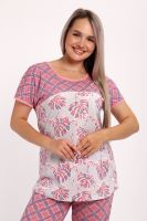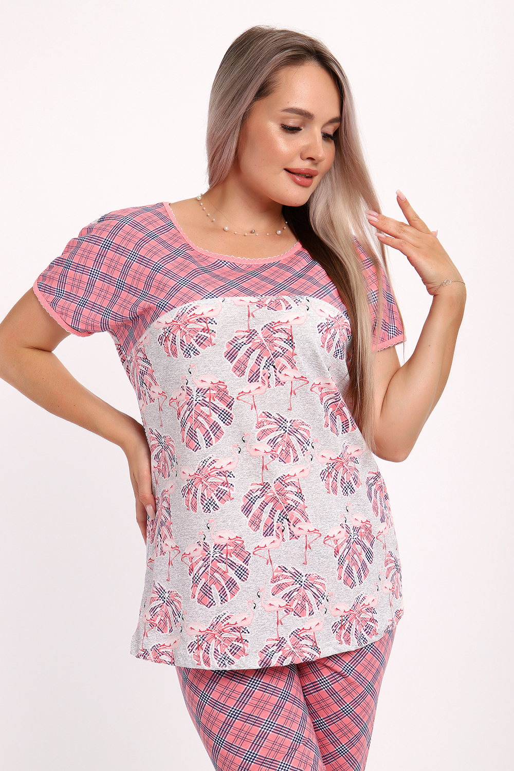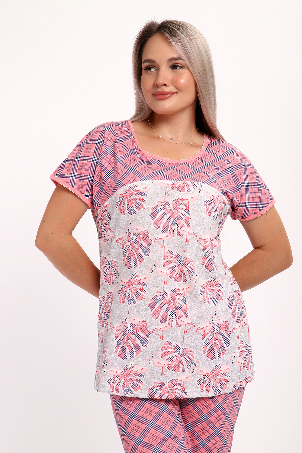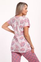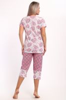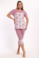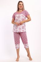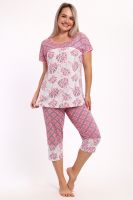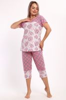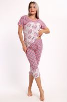 Кофта свободного покроя со спущенной проймой, бейка по горловине и пройме обработана мережкой, бриджи комбинированные снизу
