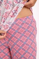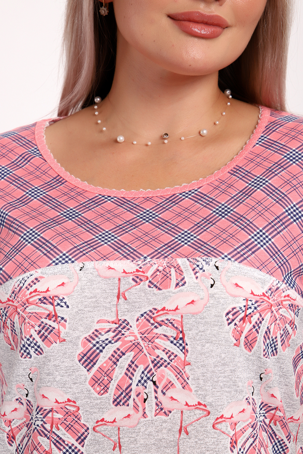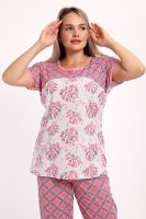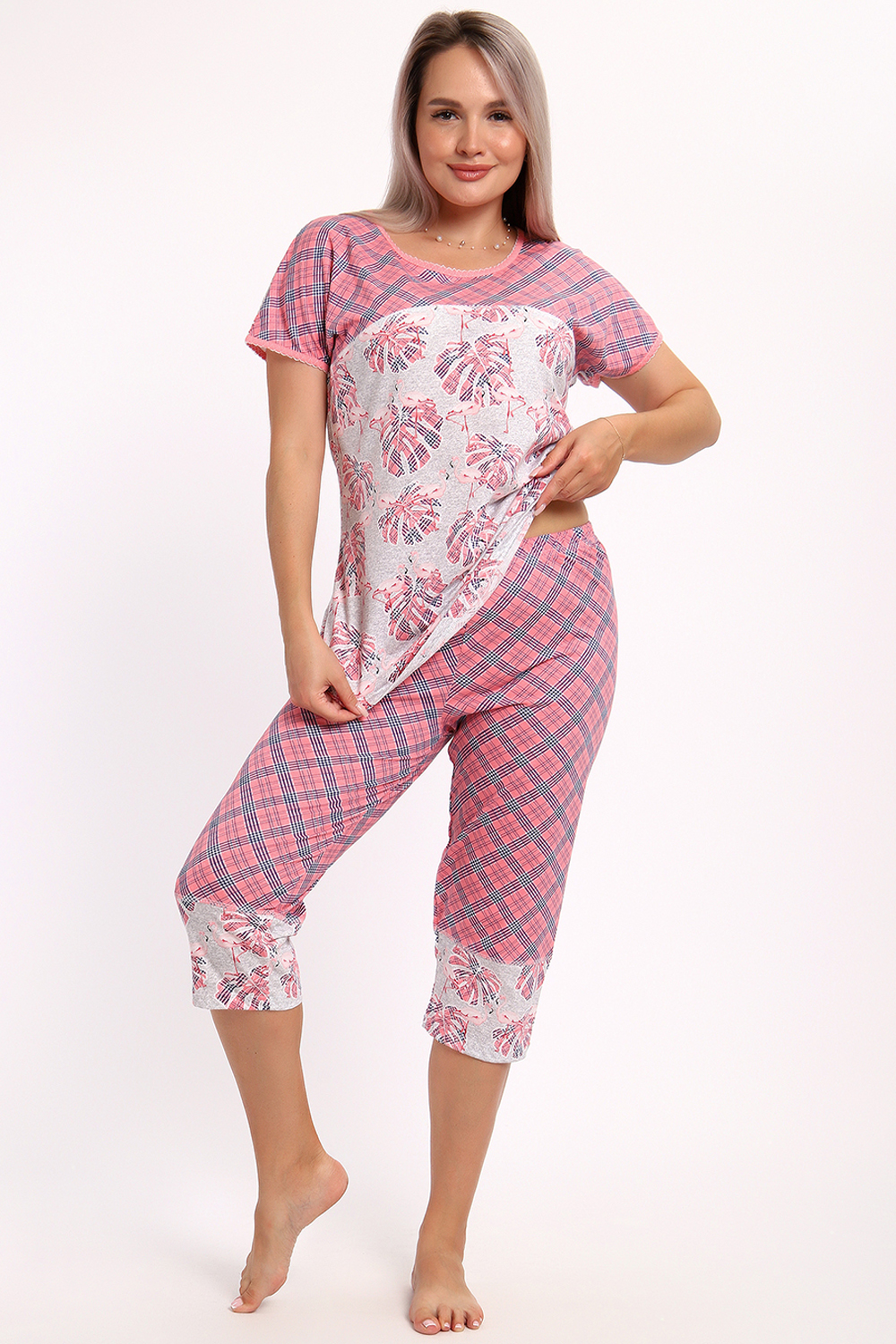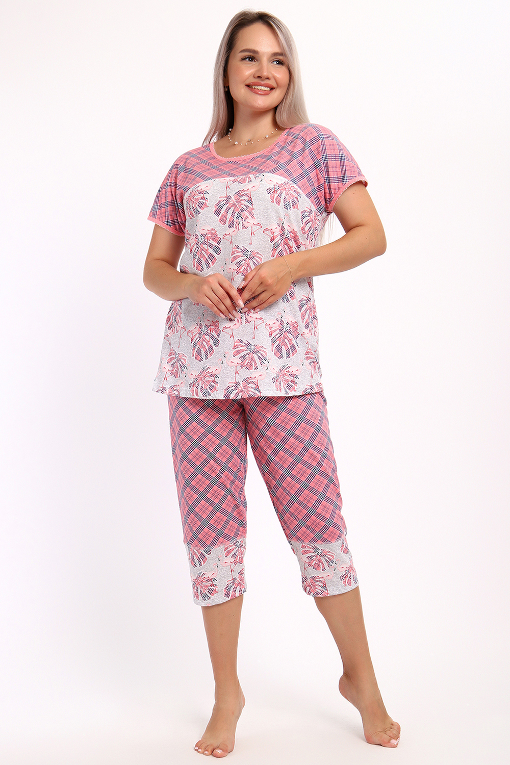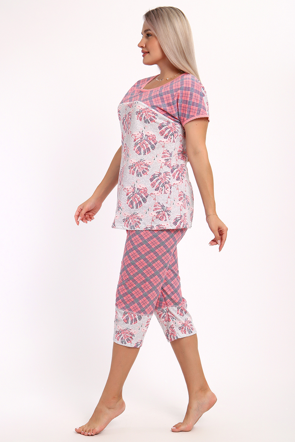 Кофта свободного покроя со спущенной проймой, бейка по горловине и пройме обработана мережкой, бриджи комбинированные снизу