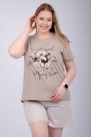 Пижама женская состоит из футболки с коротким рукавом и шортов. Футболка из однотонной кулирки с красивым принтом, шорты свободного покроя из ткани кулирка.