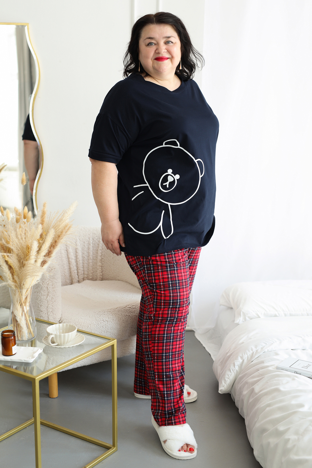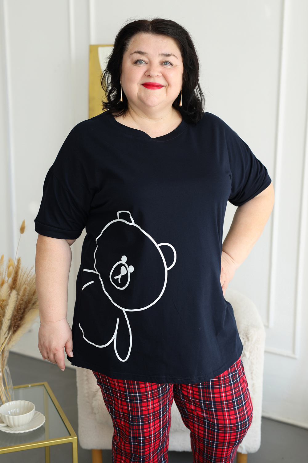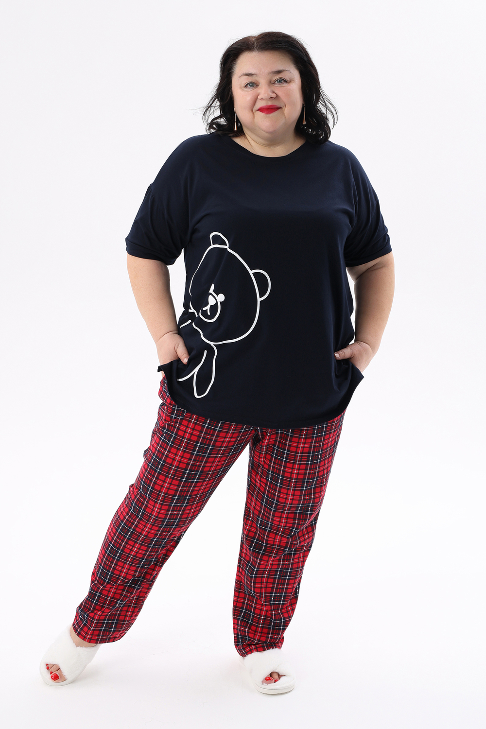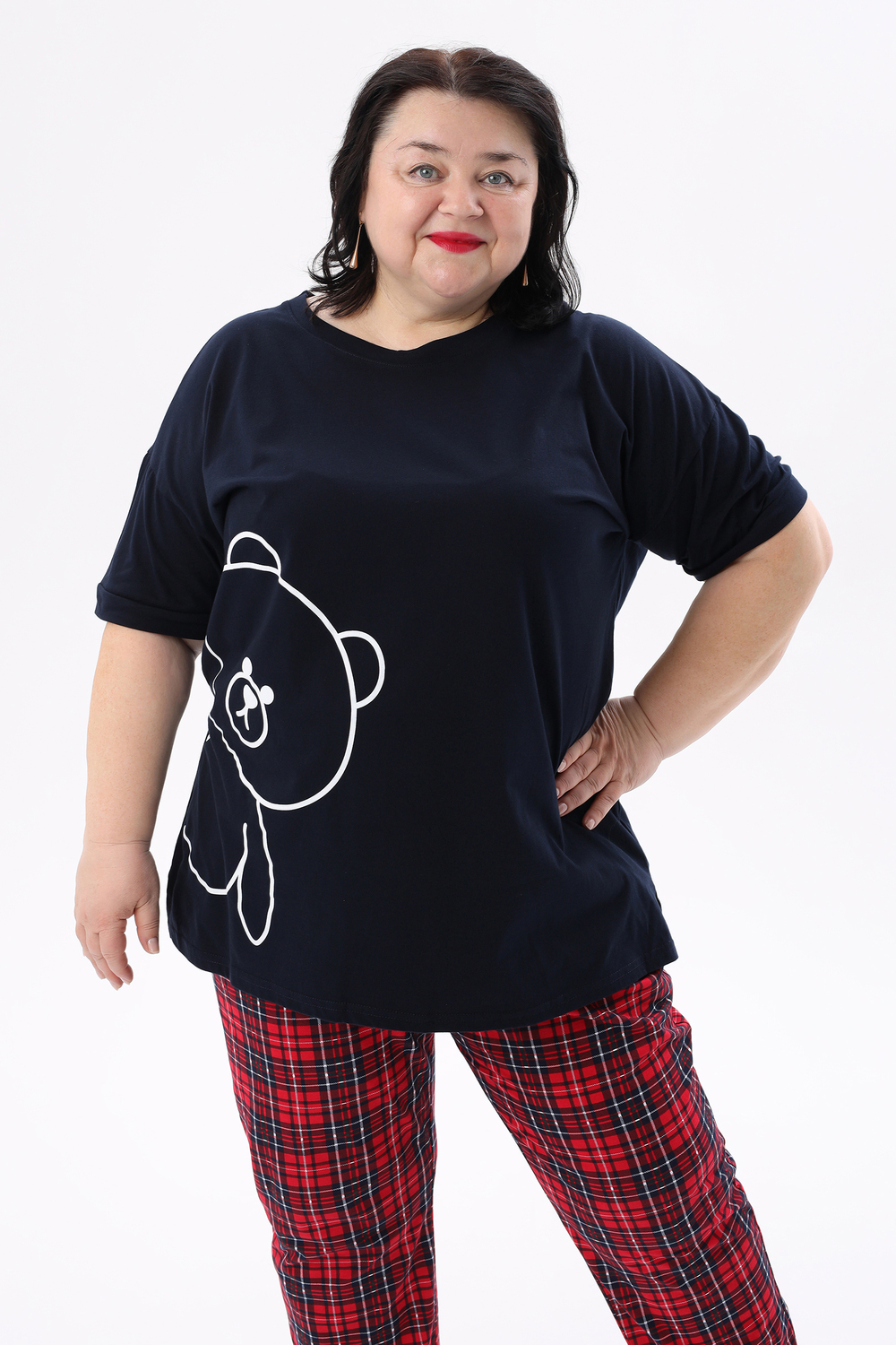 Представляем вам уютный и стильный домашний комплект от ВРазмере, созданный специально для комфортного отдыха. Пижама женская больших размеров порадует вас своей практичностью и привлекательным дизайном. Удлиненная футболка с милым принтом мишки и короткими рукавами создана для максимального комфорта, а свободные брюки в красную клетку на удобной резинке обеспечат свободу движений. Этот комплект станет идеальным выбором для женщин, ценящих уют и комфорт. Натуральный трикотаж из 100% хлопка приятен к телу и позволяет коже дышать, что особенно важно для чувствительной кожи. Пижама подходит для повседневного ношения дома, а также станет отличным подарком для любимых женщин. Благодаря универсальному дизайну, пижама подойдет как для высоких, так и для невысоких женщин. Стирка при температуре не более 40°C сохранит яркость красок и мягкость ткани. Побалуйте себя комфортом и стилем с пижамой DomTex!