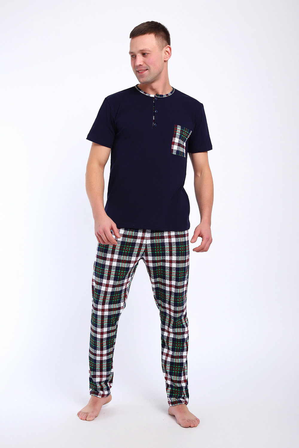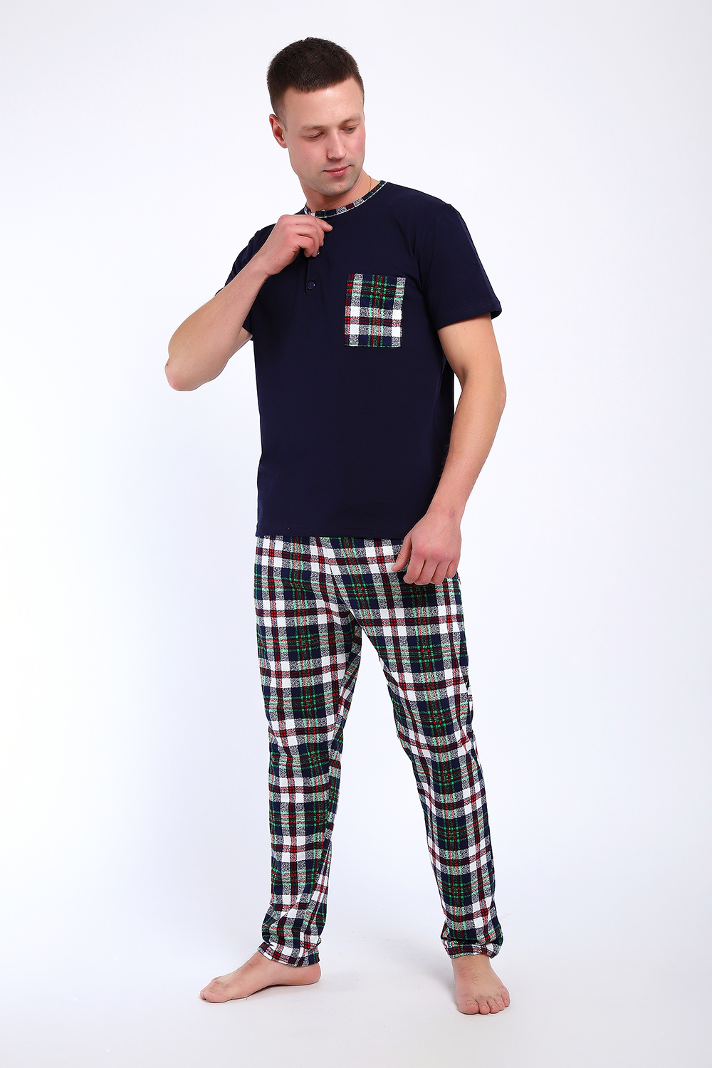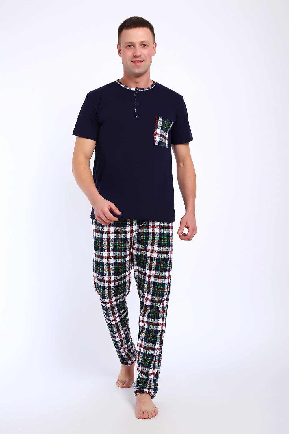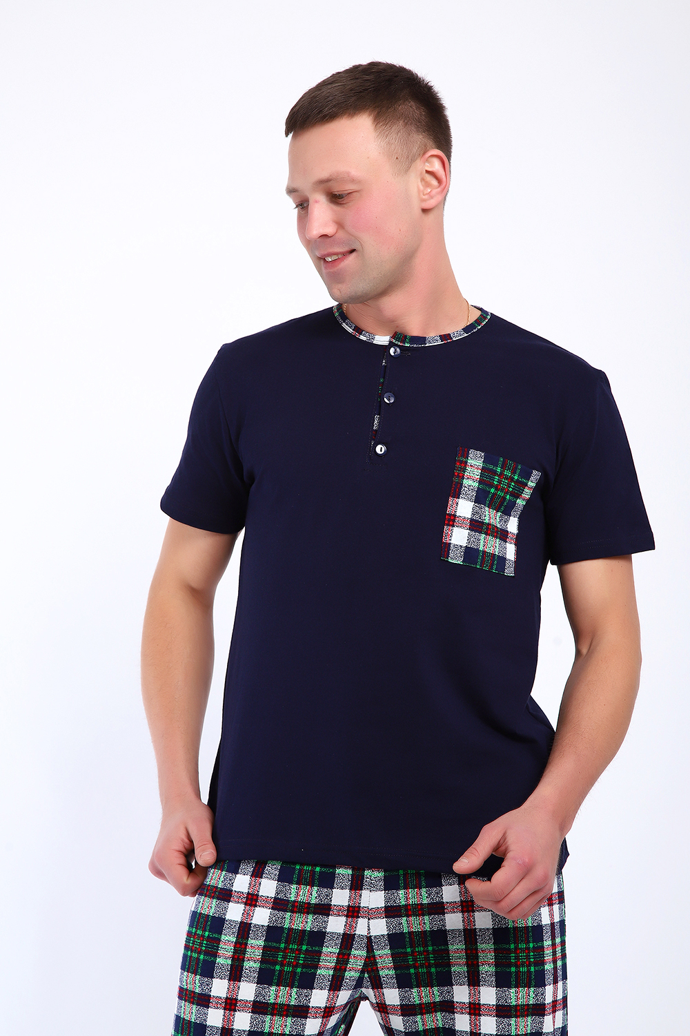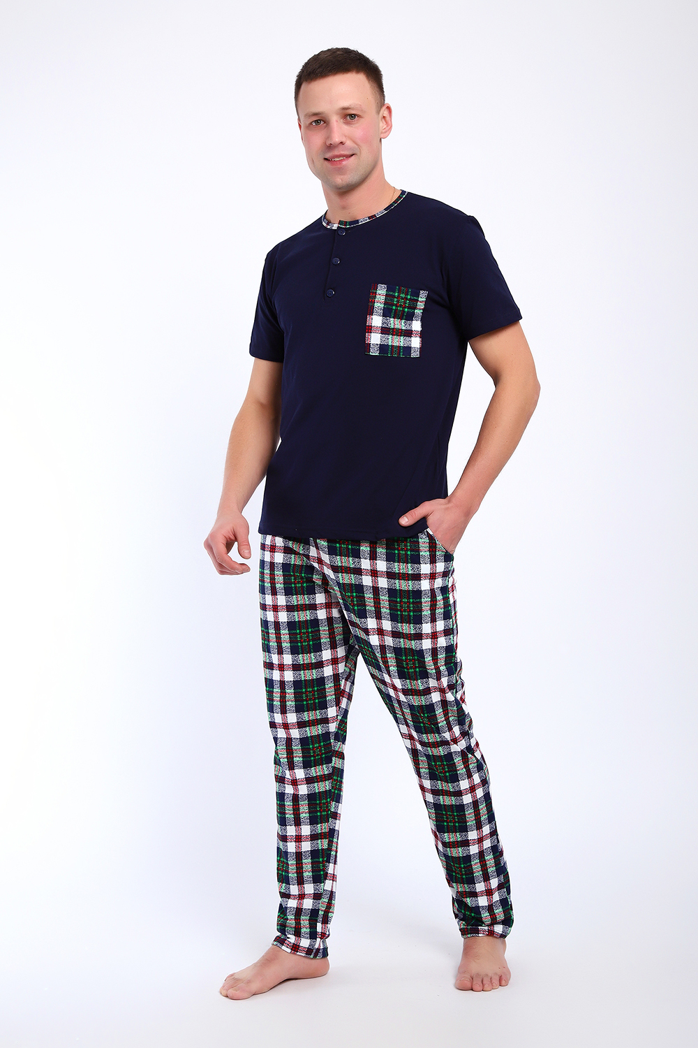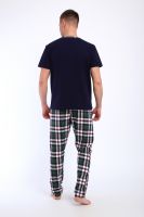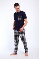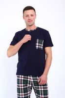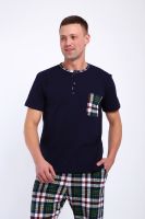 Мужской пижамный костюм футболка с брюками. Брюки полной длины слегка заужены к низу, с вместительными карманами по бокам. Футболка с коротким рукавом модель поло с пуговицами, на груди накладной кармашек.