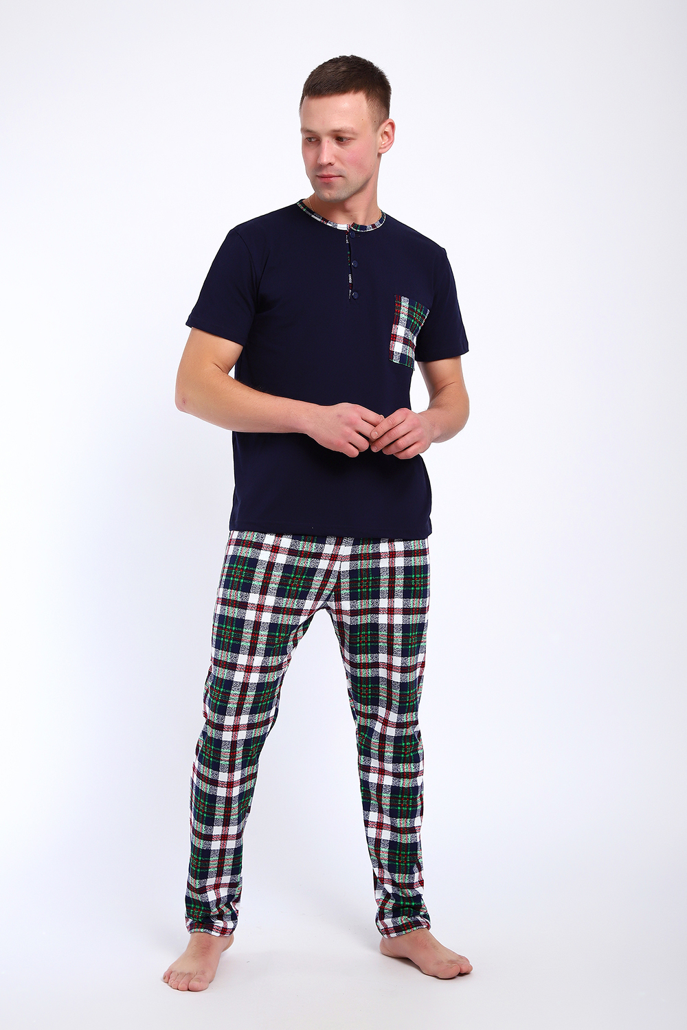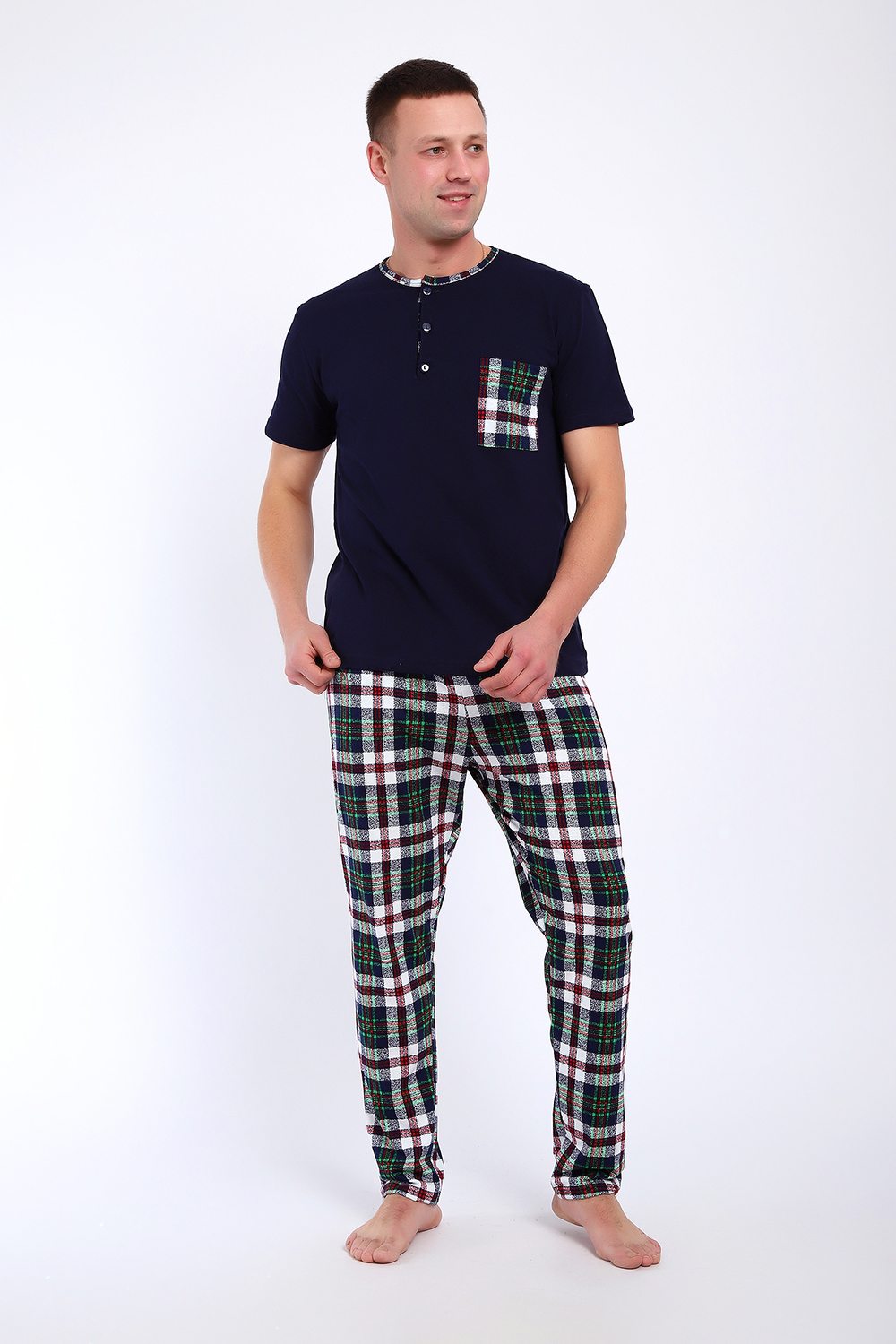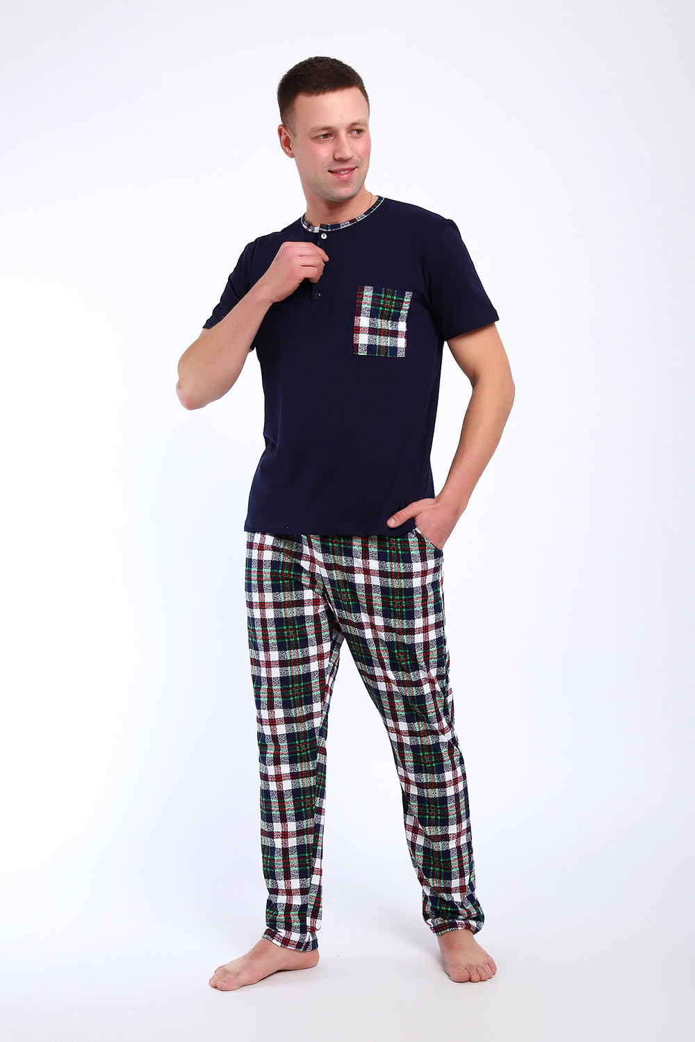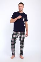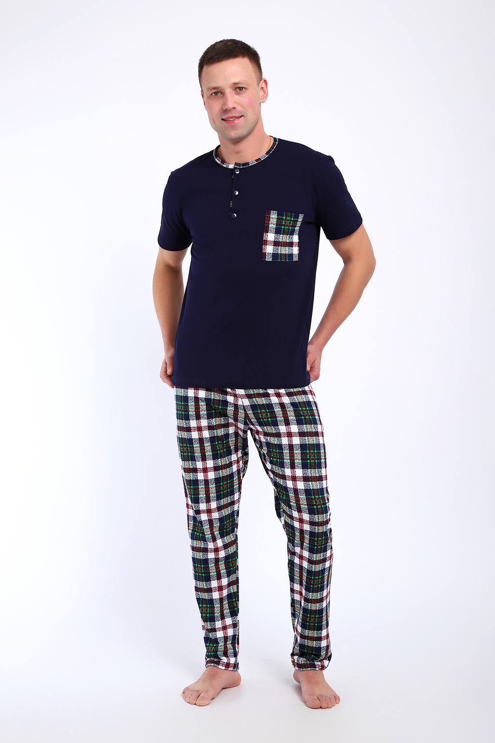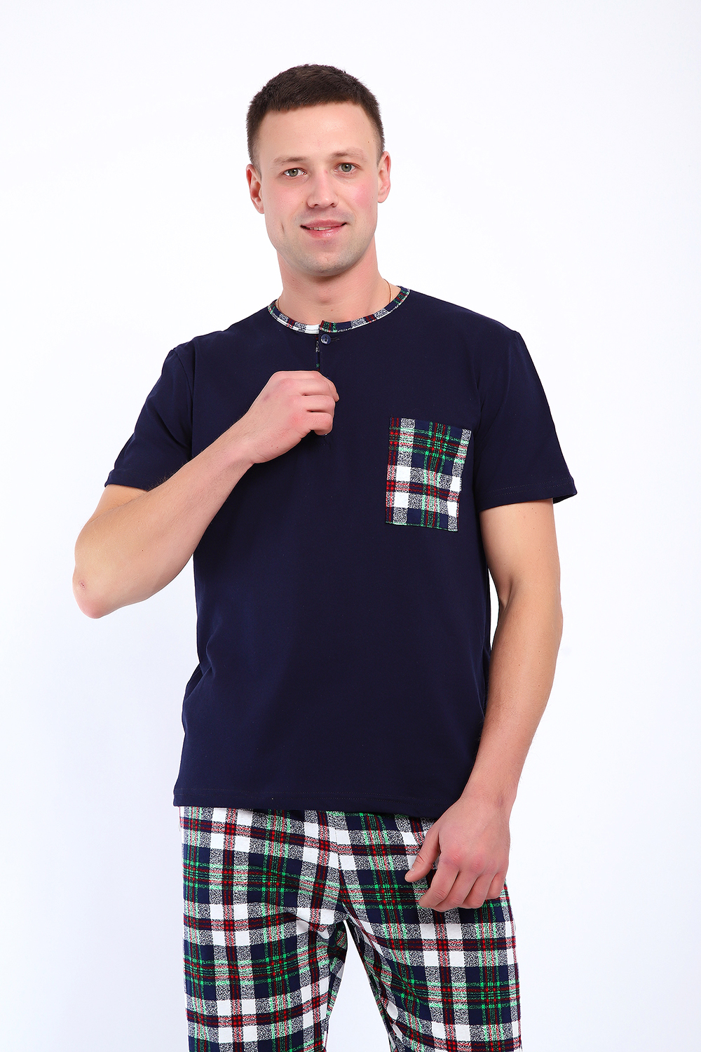 Мужской пижамный костюм футболка с брюками. Брюки полной длины слегка заужены к низу, с вместительными карманами по бокам. Футболка с коротким рукавом модель поло с пуговицами, на груди накладной кармашек.