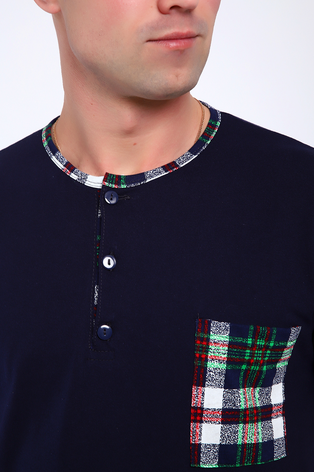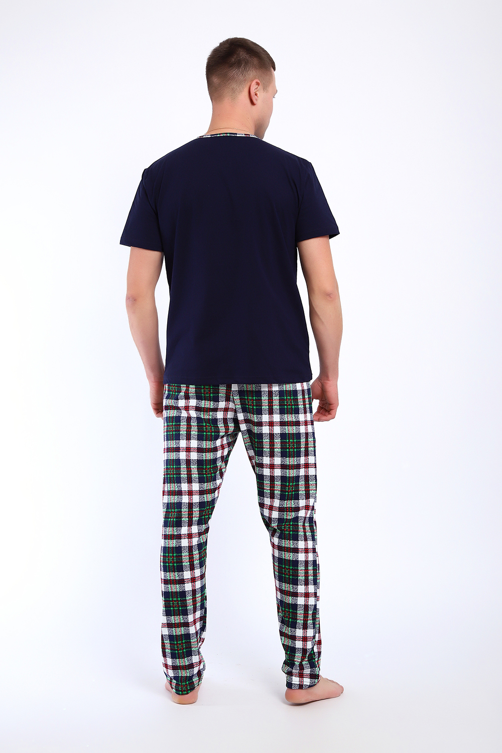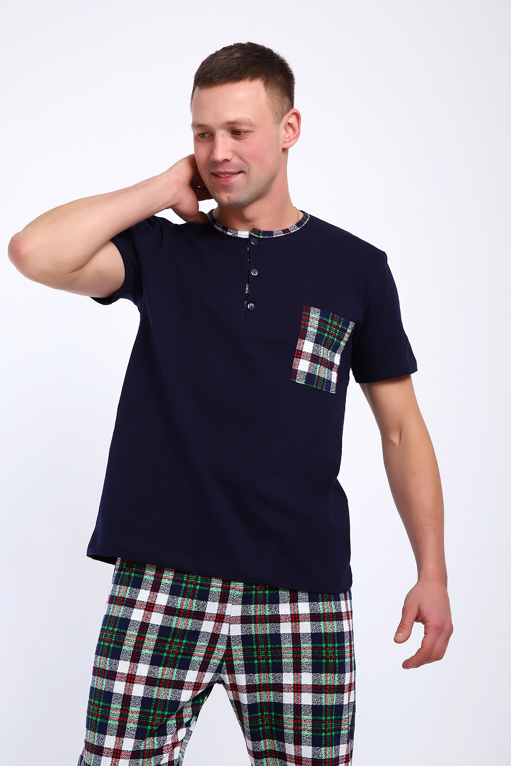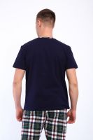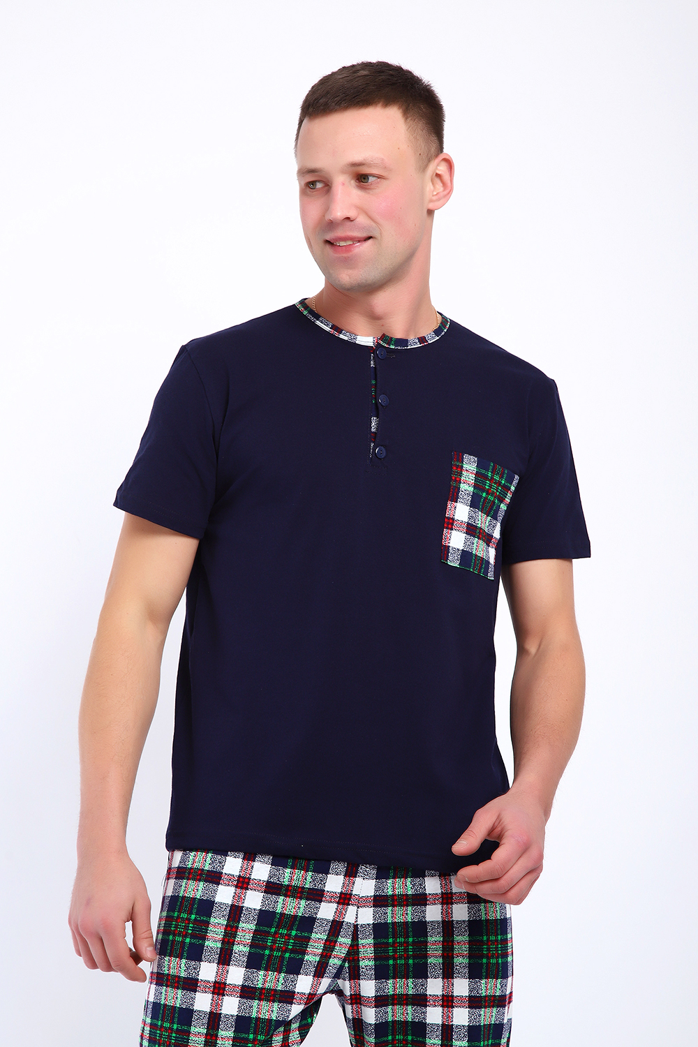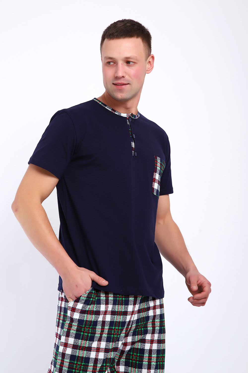 Мужской пижамный костюм футболка с брюками. Брюки полной длины слегка заужены к низу, с вместительными карманами по бокам. Футболка с коротким рукавом модель поло с пуговицами, на груди накладной кармашек.