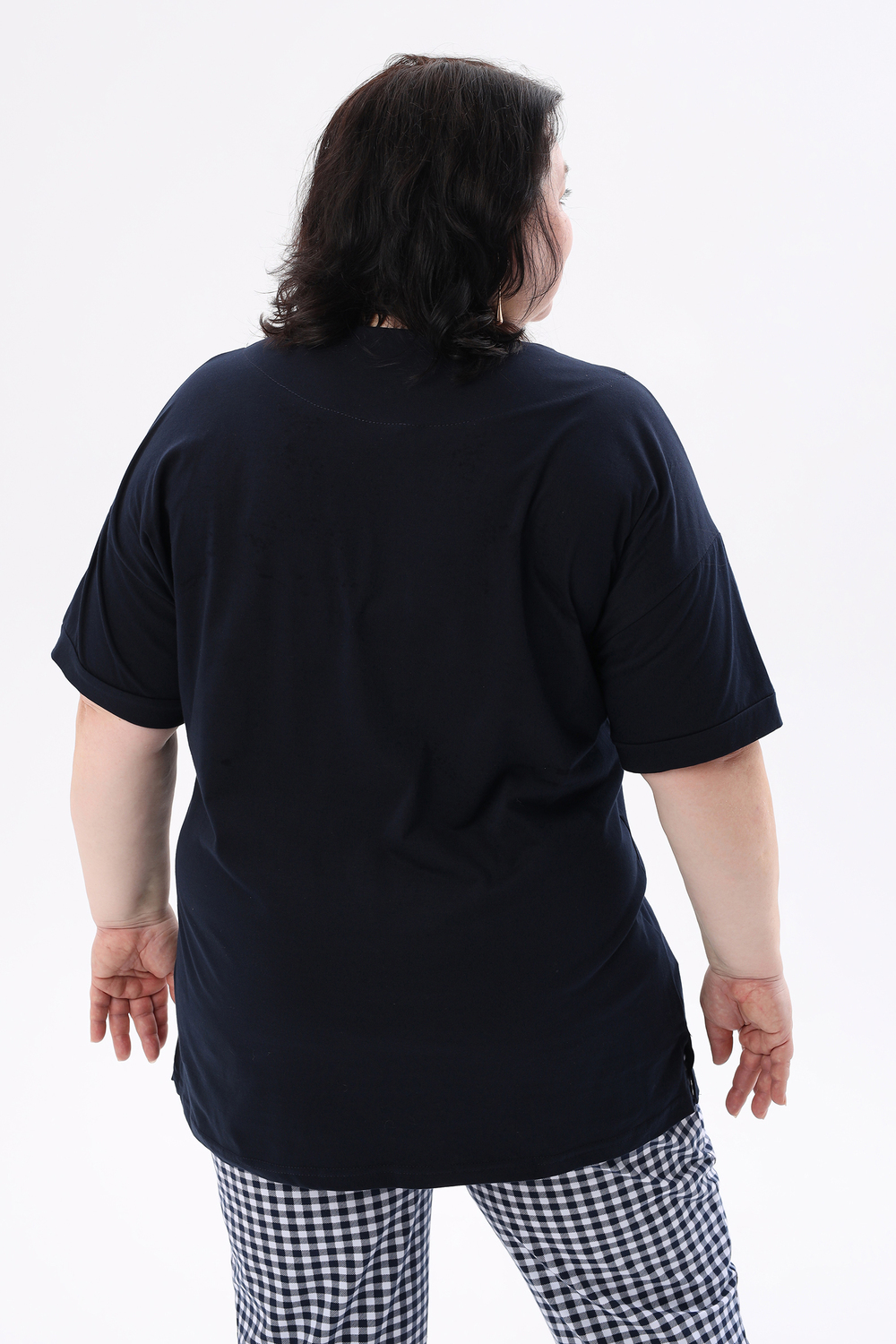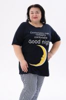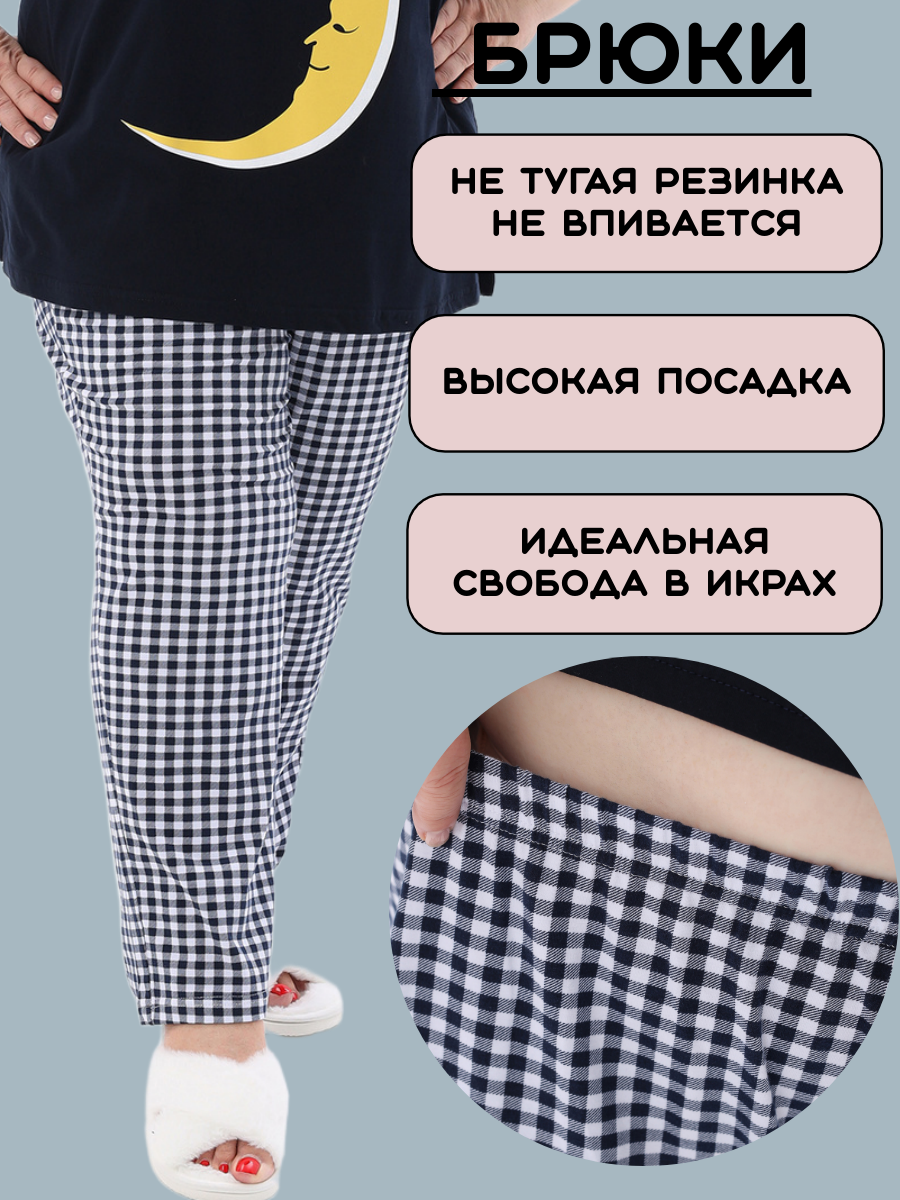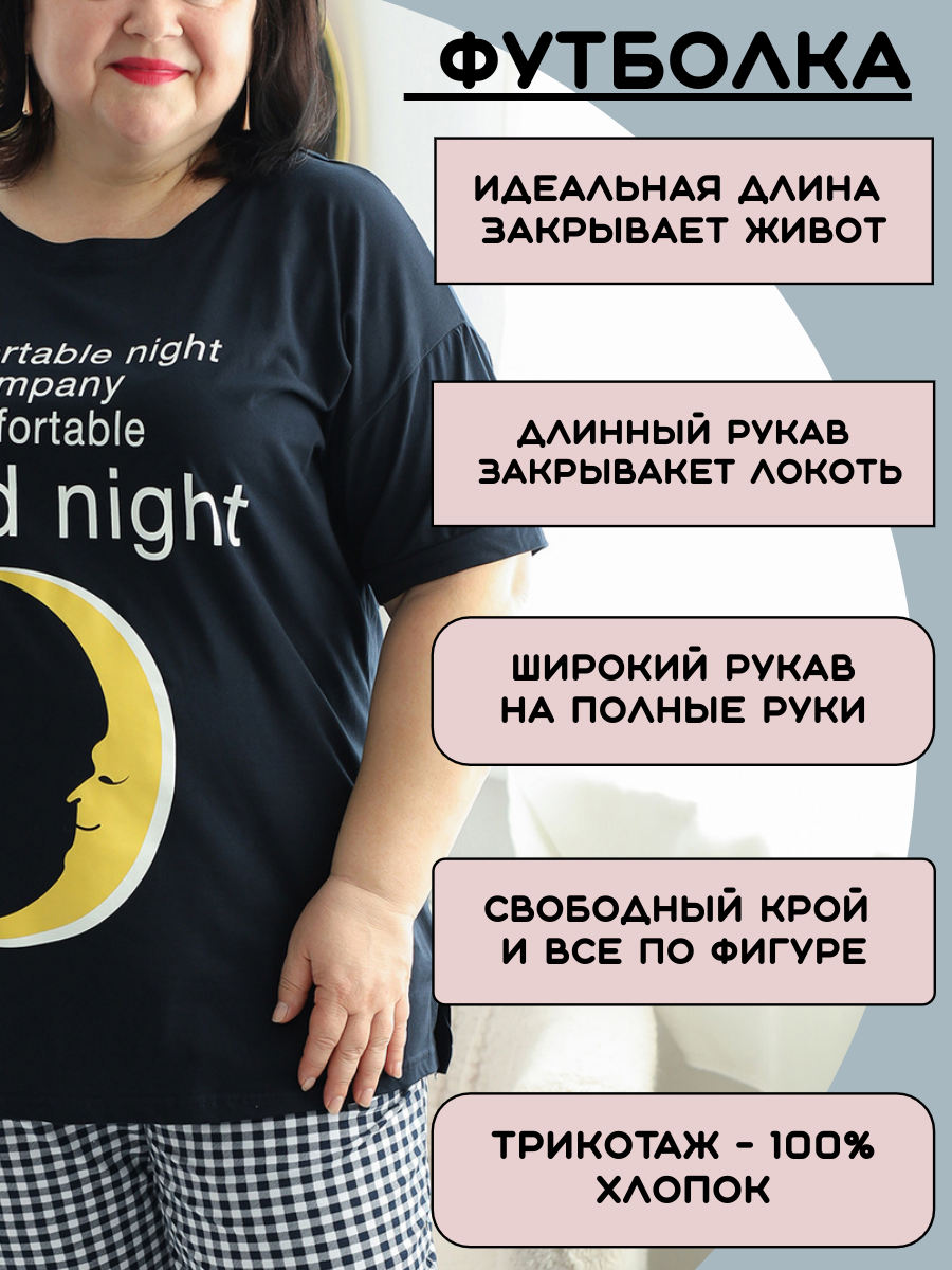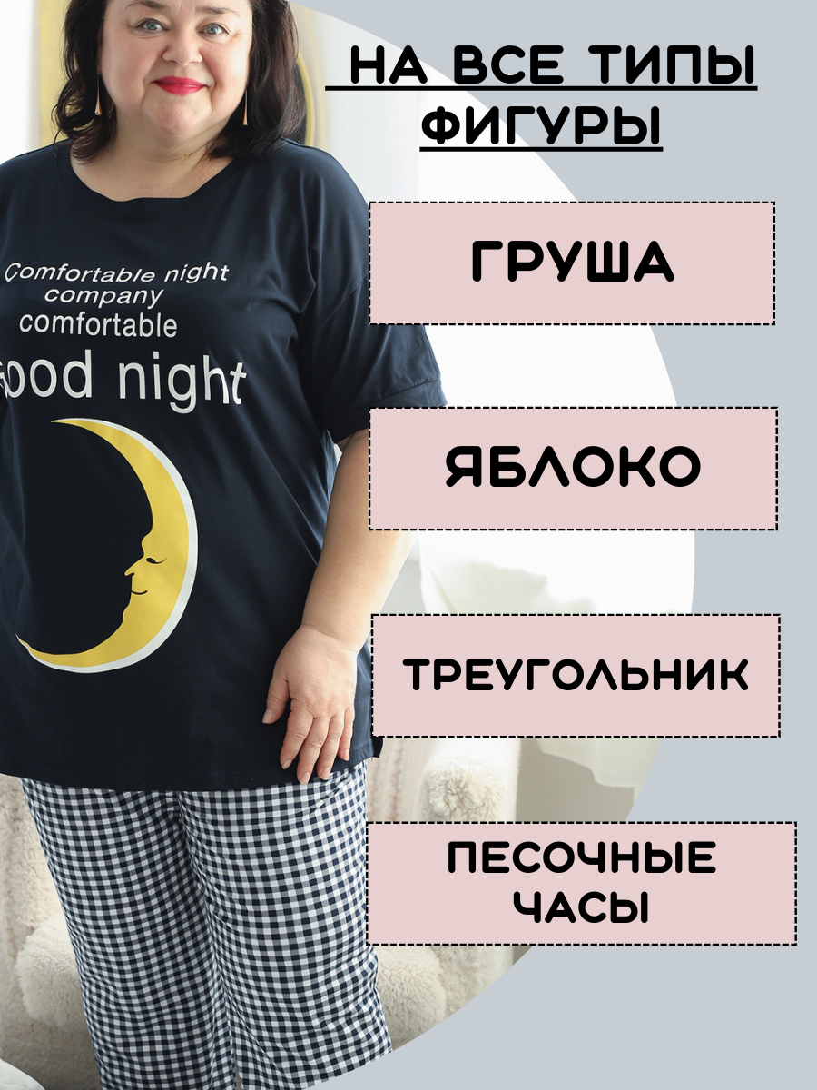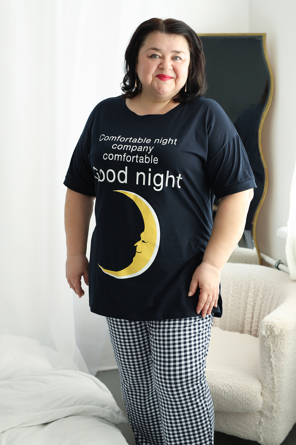Пижама женская больших размеров со штанами от ВРазмере – это не просто домашний костюм, а настоящий союз комфорта и заботы о каждой детали фигуры plus size. Мы учли всё, что важно нашим покупателям: - Удлинённая футболка полностью закрывает живот, мягко садится по фигуре и дарит уверенность. - Рукав до локтя скрывает полные руки, делает образ гармоничным и аккуратным. - Свободный крой – никакого стеснения движений, только лёгкость и комфорт. - Брюки на резинке с высокой посадкой подходят для бёдер до 172 см и не давят в талии. - Идеальная длина брюк — чтобы и высоким, и невысоким женщинам было удобно. - 100% хлопок — натуральный трикотаж, мягкий и дышащий, который дарит коже нежность и уют. Пижама больших размеров выполнена в стильном тёмно-синем цвете с милым принтом «Good night» и клетчатыми брюками. Она одинаково удобна для сна, отдыха дома или даже для уютных домашних вечеров с близкими. Это та самая вещь, которая помогает чувствовать себя красивой и уверенной даже в домашних условиях. Подходит для любой фигуры и станет прекрасным подарком для себя или любимого человека.