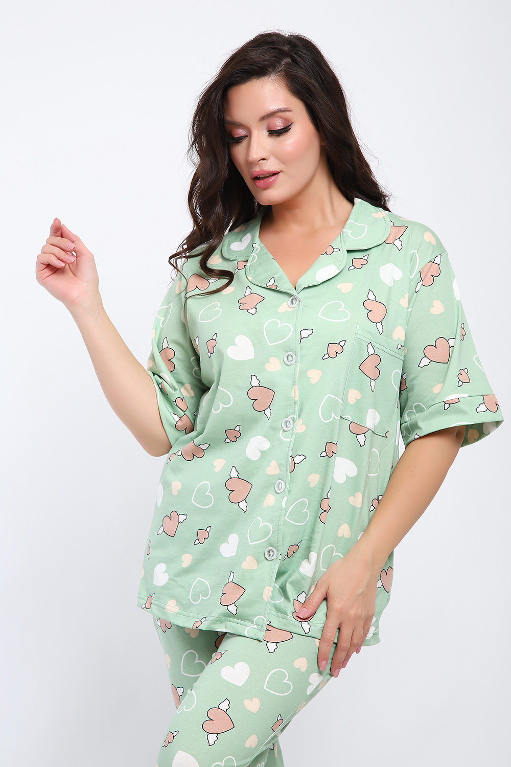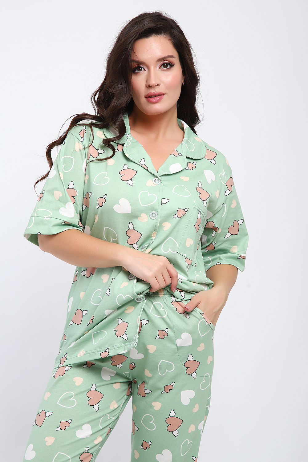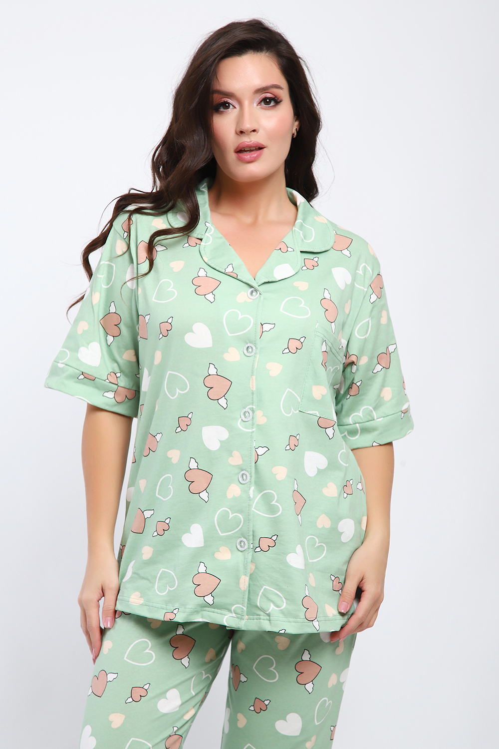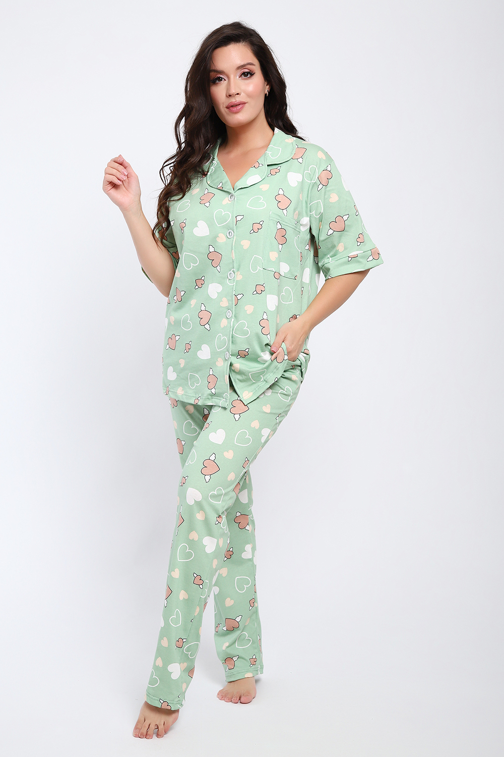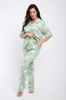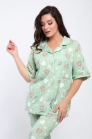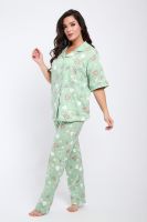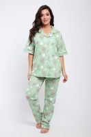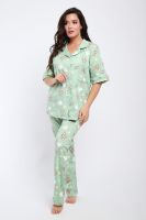 Женская пижама состоит из рубашки и брюк. В этом ансамбле вы найдете все - трендовая расцветка, идеальная посадка, широкий размерный ряд. Рубашка свободного покроя застегивается на 5 пуговиц, на груди накладной карман. Брюки прямого покроя с карманами по бокам. Выглядеть прекрасно дома - это просто.